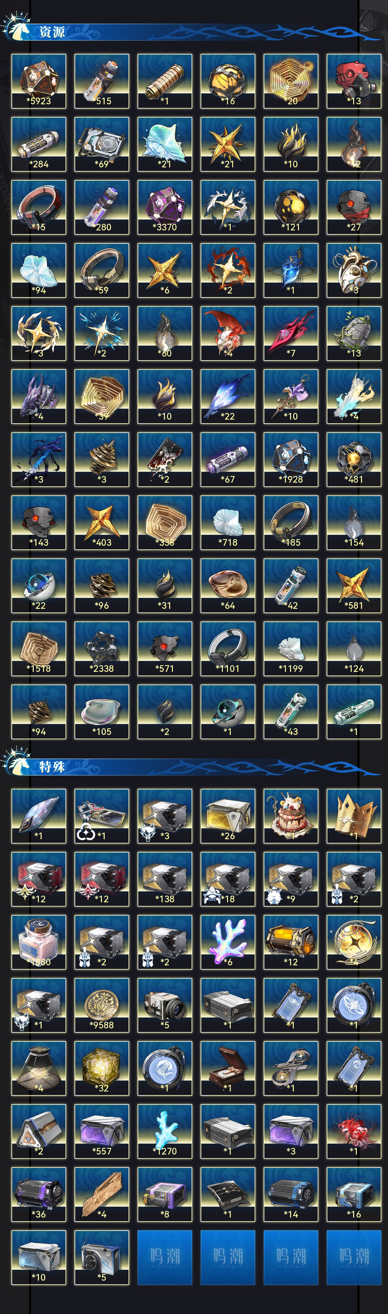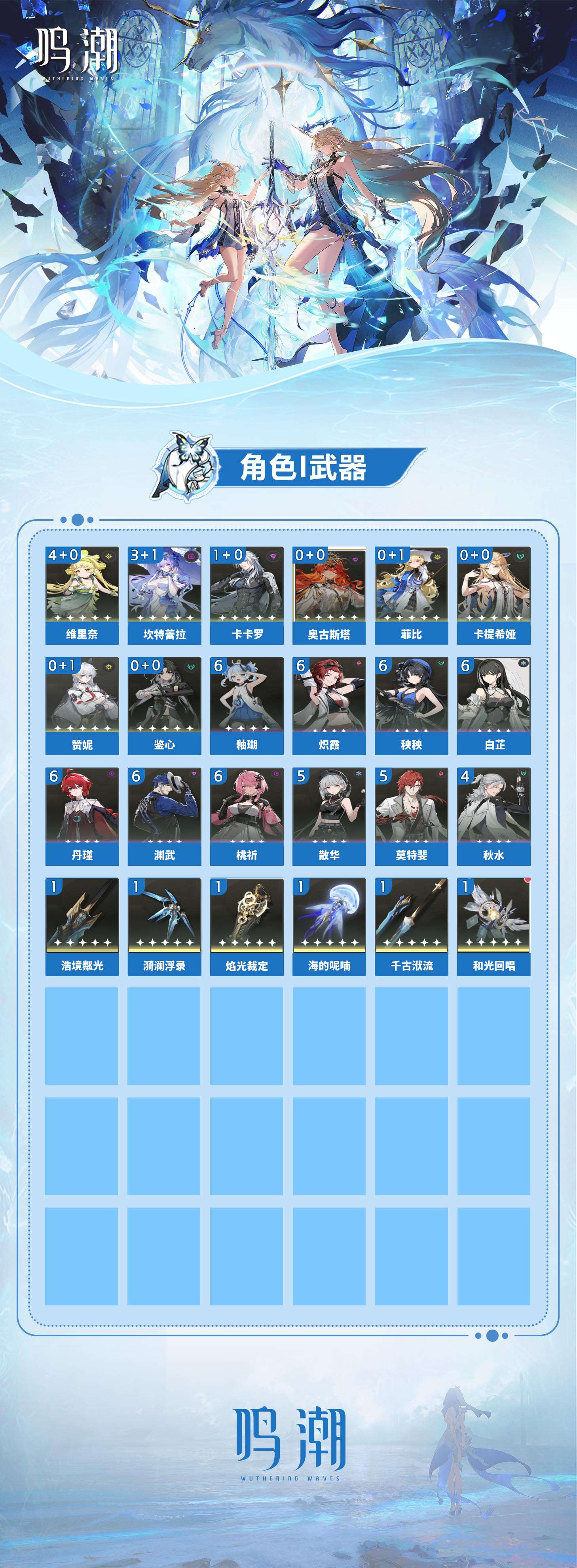【鸣潮】【lymc6753】冒险等级:73,男主,五星数量:14,绑定情况:手机号__五星角色:维里奈 4命|坎特蕾拉 3命|卡卡罗 1命|赞妮|卡提希娅|奥古斯塔|鉴心|菲比__五星武器:海的呢喃|漪澜浮录|焰光裁定|千古洑流|浩境粼光|和光回唱__四星角色:秧秧 6命|炽霞 6命|白芷 6命|桃祈 6命|丹瑾 6命|渊武 6命|釉瑚 6命|散华 5命|莫特斐 5命|秋水 4命