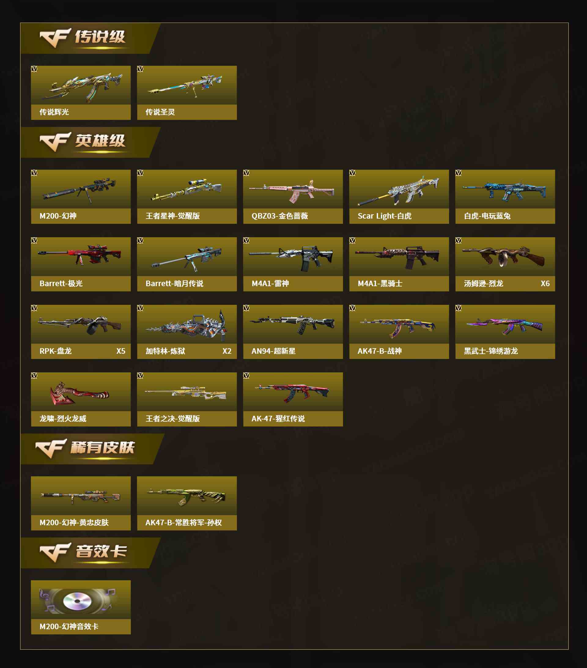 【Lv100.2 高阶大元帅】【可二次】【可排位】【VIP3】31V 1炫金 传说辉光/传说圣灵/M200-幻神-黄忠皮肤/M200-幻神/M200-幻神音效卡/Scar Light-白虎/白虎-电玩蓝兔/M4A1-雷神/Barrett-极光/M4A1-黑骑士/汤姆逊-烈龙/RPK-盘龙/加特林-炼狱/AN94-超新星/QBZ03-金色蔷薇/(截图展示段位不代表实际段位,如赛季更新等不可抗拒因素发生变化、时限道具不保证所剩时间,其余道具看截图或咨询客服)