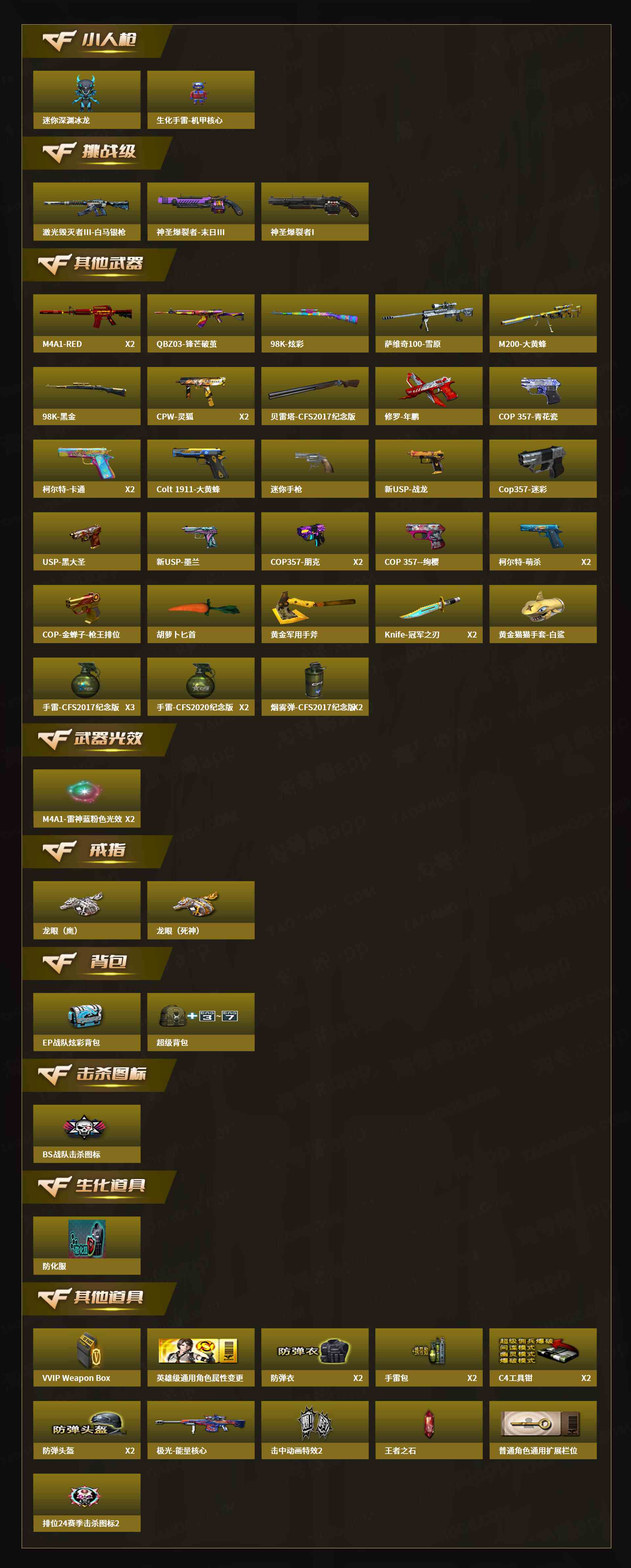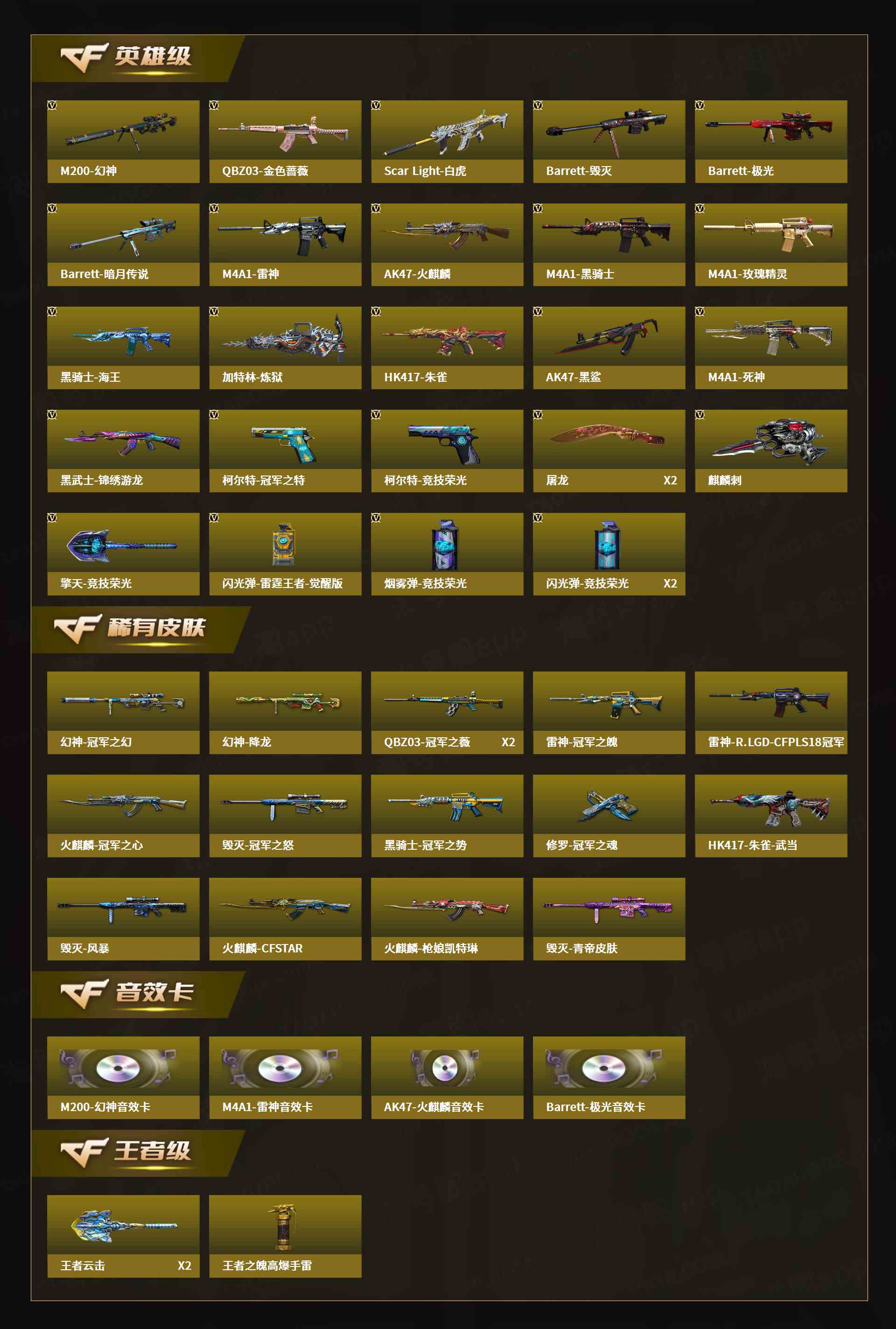 【Lv102 荣耀元帅】【可二次】【可排位】【VIP4】30V 3王者 幻神-冠军之幻/幻神-降龙/M200-幻神/M200-幻神音效卡/QBZ03-冠军之薇/Scar Light-白虎/雷神-冠军之魄/雷神-R.LGD-CFPLS18冠军/M4A1-雷神/M4A1-雷神音效卡/火麒麟-冠军之心/AK47-火麒麟/AK47-火麒麟音效卡/毁灭-冠军之怒/毁灭-风暴/Barrett-毁灭/Barrett-极光/Barrett-极光音效卡/黑骑士-冠军之势/M4A1-黑骑士/M4A1-玫瑰精灵/黑骑士-海王/加特林-炼狱/HK417-朱雀/AK47-黑鲨/9A91-烈火/M4A1-死神/修罗-冠军之魂/柯尔特-冠军之特/柯尔特-竞技荣光/屠龙/擎天-竞技荣光/QBZ03-金色蔷薇/(截图展示段位不代表实际段位,如赛季更新等不可抗拒因素发生变化、时限道具不保证所剩时间,其余道具看截图或咨询客服)