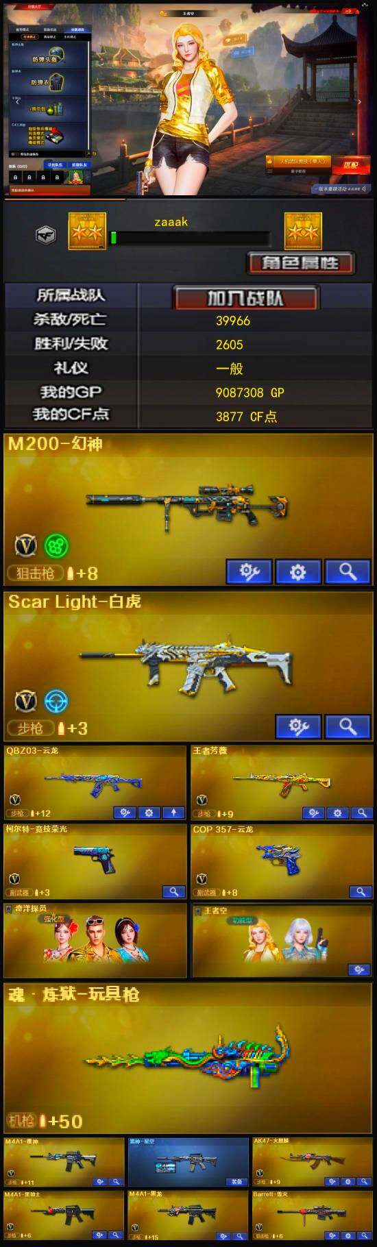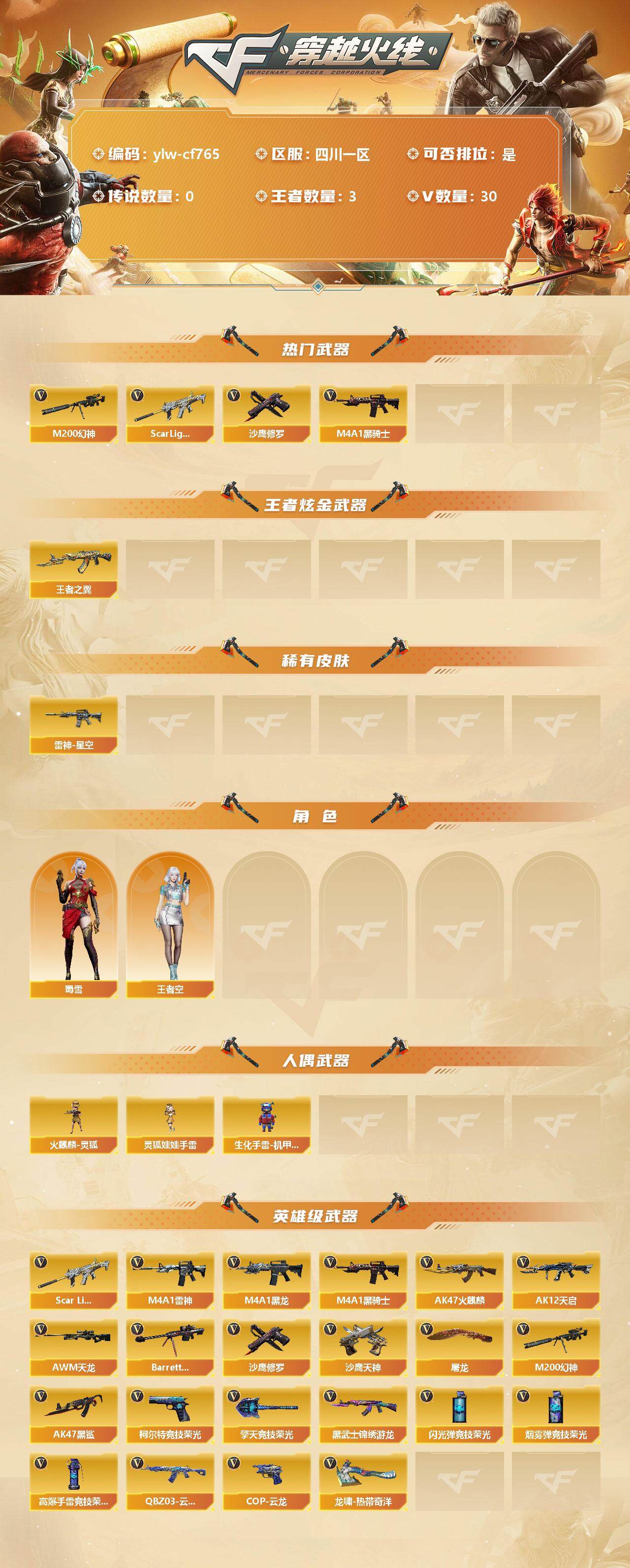 【商品标题】:四川一区-30v-3王者-0炫金 【热门武器】:scar light-白虎,m200-幻神,m4a1-黑骑士,沙鹰-修罗 【王者炫金武器】:王者之翼 【稀有皮肤】:雷神-星空 【角色】:王者空,蜀雪 【人偶武器】:火麒麟-灵狐,灵狐娃娃手蕾,生化手蕾-机甲核心 【英雄级武器】:q03-云龙,cop 357-云龙,柯尔特-竞技荣光,擎天-竞技荣光,高爆手蕾-竞技荣光,盐雾蛋-竞技荣光,闪光丹-竞技荣光,scar light-白虎,m4a1-雷神,m4a1-黑龙,m4a1-黑骑士,ak47-火麒麟,ak12-天启,awm-天龙,barrett-毁灭,m200-幻神,ak47-黑鲨,黑武士-锦绣游龙,沙鹰-天神2,沙鹰-修罗,屠龙,龙啸-热带奇洋 【特殊呛械】:1白虎,1黑骑士,0烈龙,0盘龙,0炼狱,0蝴蝶斯泰尔