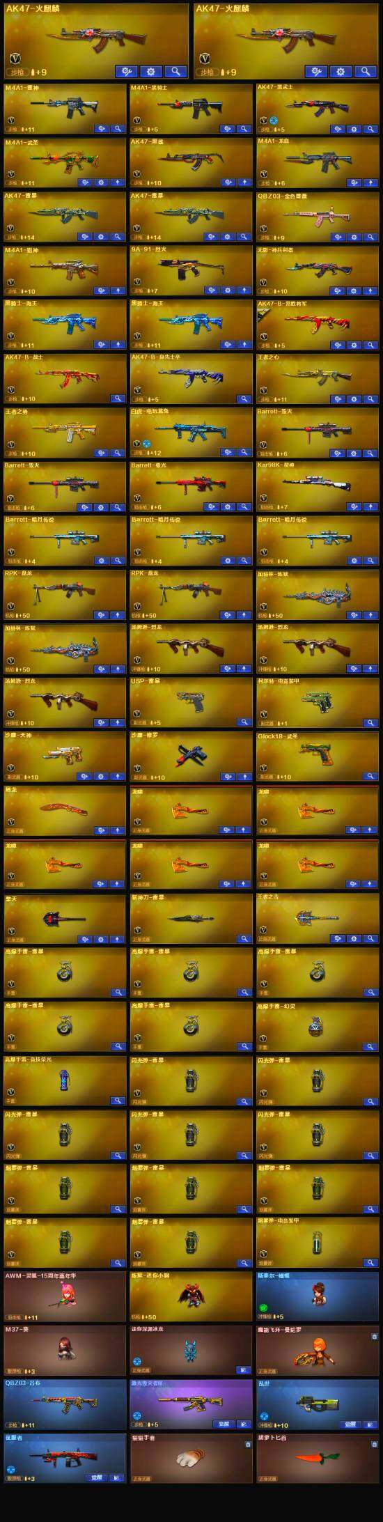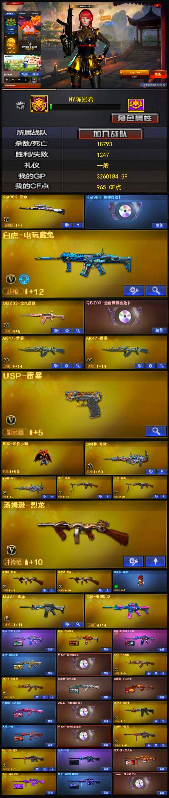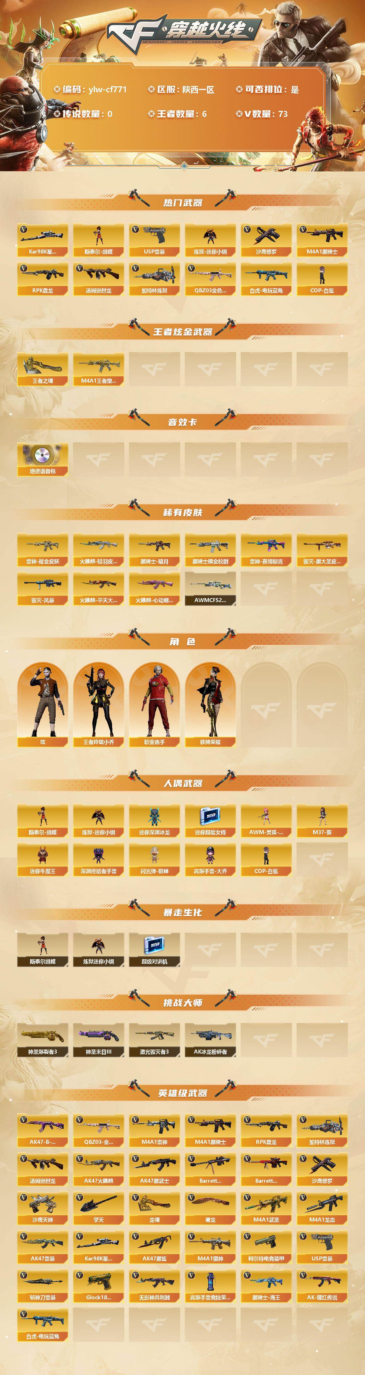 [9182119]【商品标题】:陕西一区-73v-6王者-0炫金 【热门武器】:q03-金色蔷薇,白虎-电玩蓝兔,kar98k-星神,炼狱-迷你小钢,m4a1-黑骑士,汤姆逊-烈龙3,rpk-盘龙2,加特林-炼狱2,斯泰尔-蝴蝶,cop-白鲨,usp-雷暴,沙鹰-修罗 【王者炫金武器】:m4a1-王者堕天神,王者之啸 【音效卡】:绝迹语音包 【稀有皮肤】:雷神-耀金皮肤,雷神-赛博朋克,火麒麟-轻羽皮肤,火麒麟-平天大圣,火麒麟-心动糖果,黑骑士-暗月,黑骑士-摸金校尉2,毁灭-黑大圣皮肤,毁灭-风暴,awm-cfs 2020 【角色】:王者玲珑-小乔,炫,铁骑荣耀,职业选手 【人偶武器】:cop-白鲨,斯泰尔-蝴蝶,awm-灵狐-15周年嘉年华,m37-葵,炼狱-迷你小钢,迷你深渊冰龙,迷你超能女侍,迷你牛魔王,深渊终结者手蕾2,闪光丹-貂蝉,高爆手蕾-大乔 【暴走生化】:斯泰尔-蝴蝶,炼狱-迷你小钢,超级对讲机 【挑战大师】:神圣爆裂者iii2,神圣爆裂者-末日iii2,激光毁灭者iii,ak47-冰龙粉碎者 【英雄级武器】:高爆手蕾-竞技荣光,柯尔特-电竞装甲,ak47-雷暴2,usp-雷暴,斩神刀-雷暴,m4a1-武圣,glock18-武圣,q03-金色蔷薇,白虎-电玩蓝兔,无影-神兵利器,m4a1-雷神,m4a1-黑骑士,rpk-盘龙2,加特林-炼狱2,汤姆逊-烈龙3,ak47-火麒麟2,ak47-黑武士,barrett-毁灭2,barrett-极光,m4a1-龙血,kar98k-星神,ak47-黑鲨,m4a1-猎神,黑骑士-海王2,ak-47-猩红传说5,ak47-b-常胜将军,沙鹰-天神,沙鹰-修罗,擎天,龙啸5,屠龙 【特殊呛械】:蝴蝶斯泰尔3烈龙,0白虎,1黑骑士,3烈龙,2盘龙,2炼狱,1蝴蝶斯泰尔