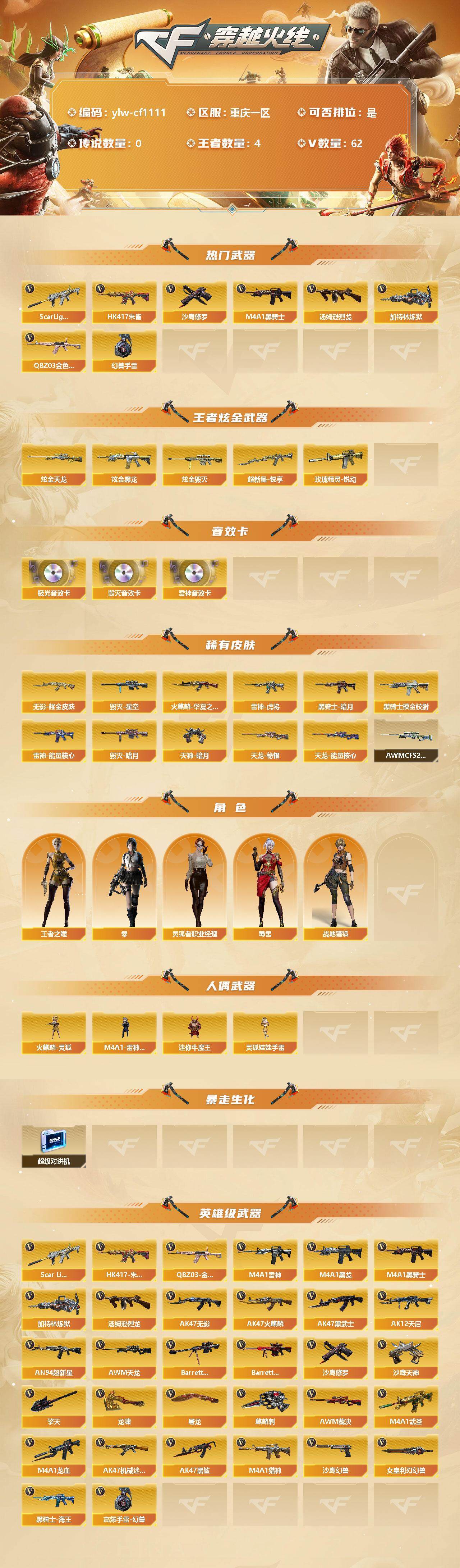 [9751979]【商品标题】:重庆一区-62v-4王者-5炫金 【热门武器】:q03-金色蔷薇,scar light-白虎,hk417-朱雀,m4a1-黑骑士2,汤姆逊-烈龙,加特林-炼狱3,沙鹰-修罗6,高爆手蕾-幻兽 【王者炫金武器】:炫金天龙3,炫金黑龙,炫金毁灭,超新星-悦享,玫瑰精灵-悦动 【音效卡】:m4a1-雷神音效卡,barrett-毁灭音效卡,barrett-极光音效卡 【稀有皮肤】:雷神-能量核心,雷神-虎将,火麒麟-华夏之心,黑骑士-暗月2,黑骑士-摸金校尉,毁灭-暗月,毁灭-星空,天龙-秘银,天龙-能量核心,无影耀金皮肤3,awm-cfs 2020,天神-暗月3 【角色】:王者之瞳,灵狐者-职业经理,零,蜀雪,战地猎狐 【人偶武器】:火麒麟-灵狐,m4a1-雷神-精英刀锋,迷你牛魔王,灵狐娃娃手蕾 【暴走生化】:超级对讲机 【英雄级武器】:沙鹰-幻兽,女皇利刃-幻兽,m4a1-武圣,q03-金色蔷薇,scar light-白虎,hk417-朱雀,m4a1-雷神,m4a1-黑龙,m4a1-黑骑士2,加特林-炼狱3,汤姆逊-烈龙,ak47-无影,ak47-火麒麟,ak47-黑武士,ak12-天启,an94-超新星,awm-天龙,barrett-毁灭4,barrett-极光,awm-裁决,m4a1-龙血,ak47-机械迷城2,ak47-黑鲨,m4a1-猎神,黑骑士-海王,沙鹰-天神,沙鹰-修罗6,麒麟刺5,擎天2,龙啸6,屠龙3,高爆手蕾-幻兽 【特殊呛械】:1白虎,2黑骑士,1烈龙,0盘龙,3炼狱,0蝴蝶斯泰尔