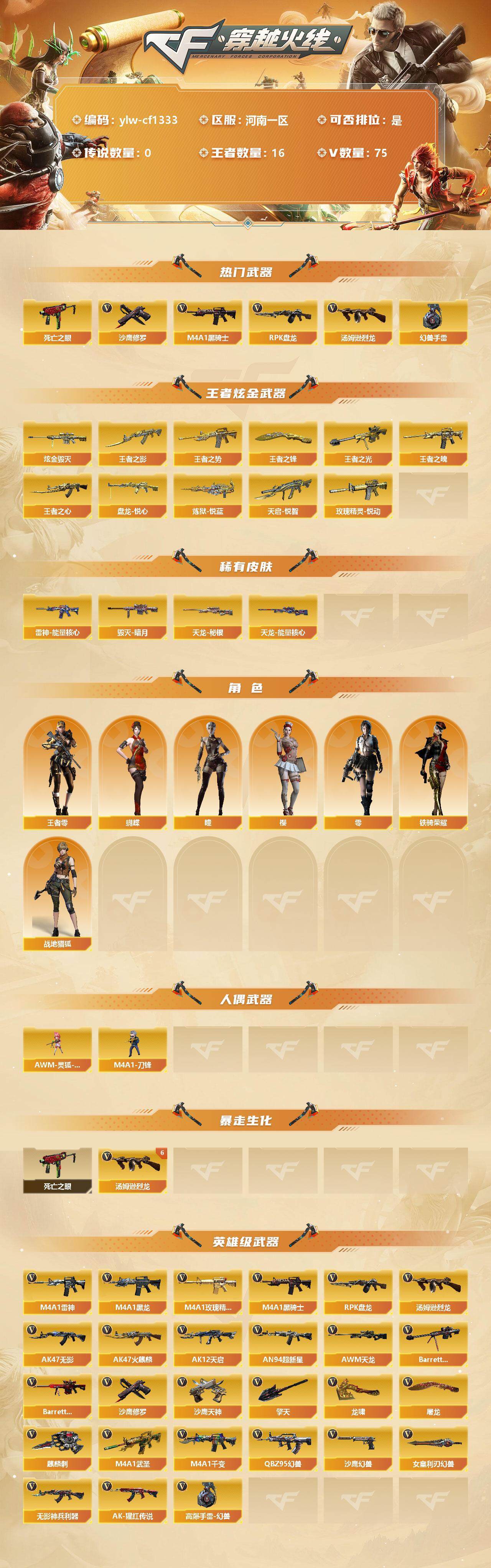【商品标题】:河南一区-75v-16王者-1炫金 【热门武器】:死亡之眼,m4a1-黑骑士5,汤姆逊-烈龙6,rpk-盘龙3,沙鹰-修罗2,高爆手蕾-幻兽5 【王者炫金武器】:炫金毁灭,盘龙-悦心,炼狱-悦蓝4,天启-悦智,王者之势,玫瑰精灵-悦动2,王者之光,王者之影,王者之魄,王者之心,王者之锋2 【稀有皮肤】:雷神-能量核心,毁灭-暗月,天龙-秘银2,天龙-能量核心 【角色】:王者-零,零,樱,瞳,蝴蝶,铁骑荣耀,战地猎狐 【人偶武器】:awm-灵狐-15周年嘉年华,m4a1-刀锋 【暴走生化】:死亡之眼 【英雄级武器】:q95-幻兽,沙鹰-幻兽5,女皇利刃-幻兽,m4a1-武圣,无影-神兵利器,m4a1-雷神2,m4a1-黑龙,m4a1-玫瑰精灵,m4a1-黑骑士5,rpk-盘龙3,汤姆逊-烈龙6,ak47-无影,ak47-火麒麟3,ak12-天启,an94-超新星,awm-天龙,barrett-毁灭2,barrett-极光2,m4a1-千变,ak-47-猩红传说,沙鹰-天神,沙鹰-修罗2,麒麟刺,擎天,龙啸2,屠龙4,高爆手蕾-幻兽5 【特殊呛械】:0白虎,5黑骑士,6烈龙,3盘龙,0炼狱,0蝴蝶斯泰尔