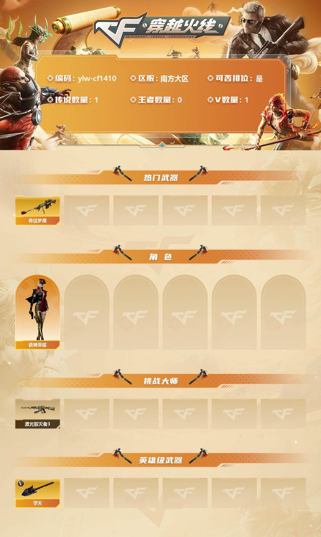 [10066751]【商品标题】:南方大区-1v-0王者-0炫金 【传说武器】:传说梦魇 【热门武器】:传说梦魇 【角色】:铁骑荣耀 【挑战大师】:激光毁灭者iii 【英雄级武器】:擎天 【特殊呛械】:0白虎,0黑骑士,0烈龙,0盘龙,0炼狱,0蝴蝶斯泰尔