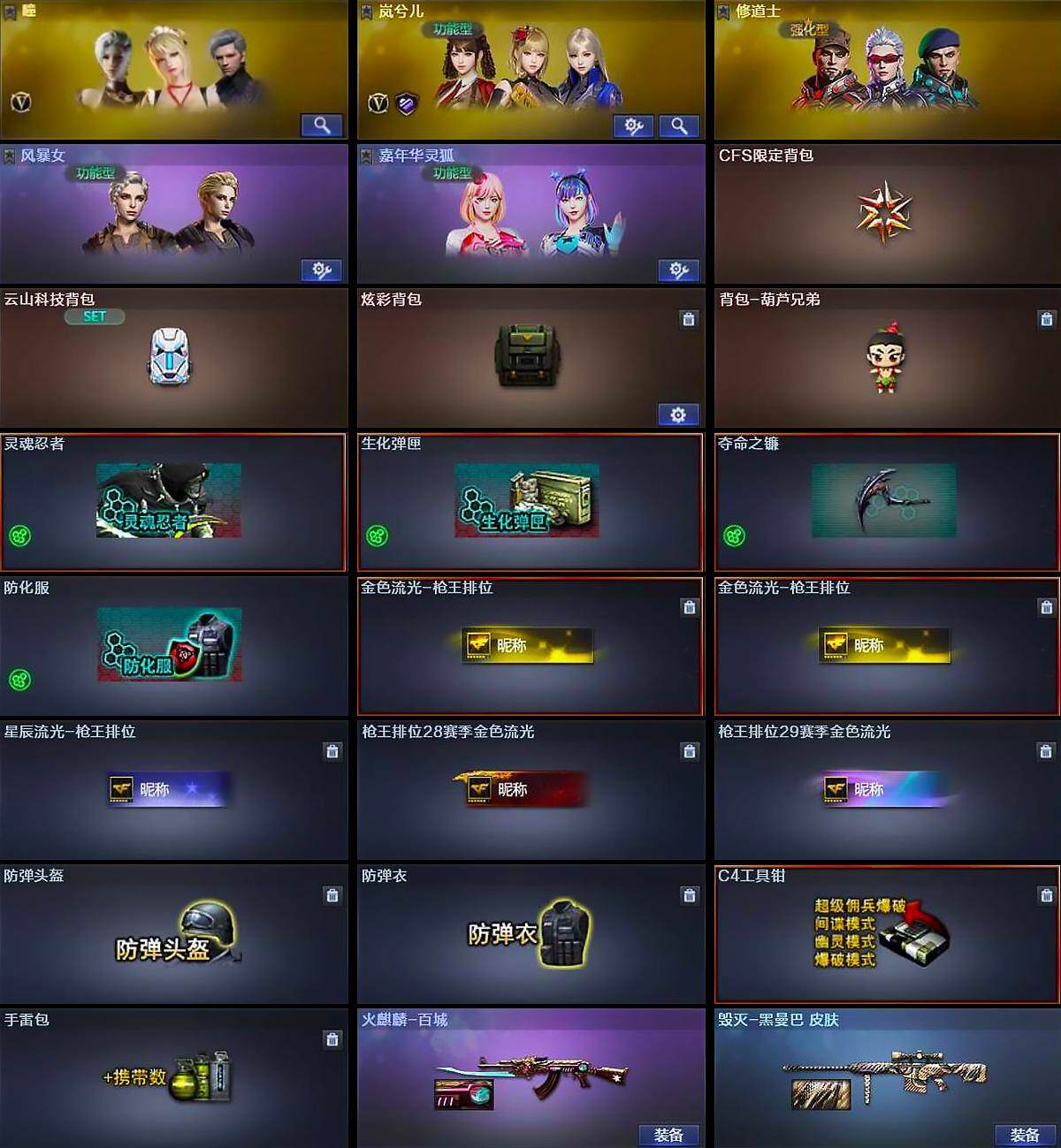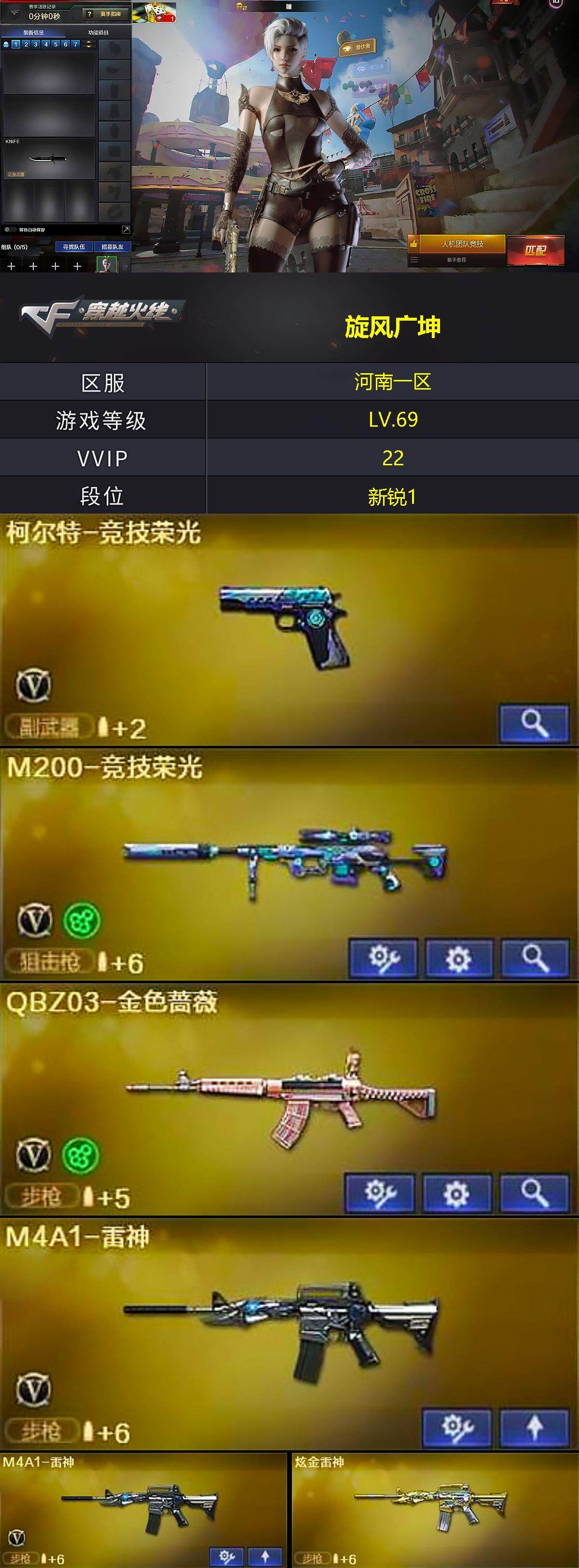 河南一区-22v-0王者-1炫金 【热门武器】:q03-金色蔷薇,m200-竞技荣光,羊驼玩偶,炽芒蝶刃 【王者炫金武器】:炫金雷神 【皮肤】:火麒麟-百城,毁灭-黑曼巴 皮肤 【角色】:瞳,岚兮儿,修道士,风暴女,嘉年华灵狐 【人偶武器】:scar light-马呛,awm-灵狐-15周年嘉年华 【英雄级武器】:ak47-火麒麟,m4a1-雷神2,无影-神兵利器,q03-金色蔷薇,barrett-毁灭,m200-竞技荣光,柯尔特-竞技荣光,屠龙,擎天-竞技荣光,炽芒蝶刃,高爆手蕾-竞技荣光3,闪光丹-竞技荣光3,盐雾蛋-竞技荣光3 【道具】:cfs限定背包,云山科技背包,炫彩背包,背包-葫芦兄弟,灵魂忍者,生化弹匣,夺命之镰,防化服,金色流光-呛王排位2,星辰流光-呛王排位,呛王排位28赛季金色流光,呛王排位29赛季金色流光,防弹头盔,防弹衣,c4工具钳,手蕾包 【特殊呛械】: