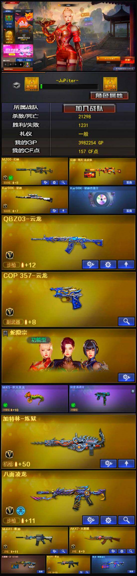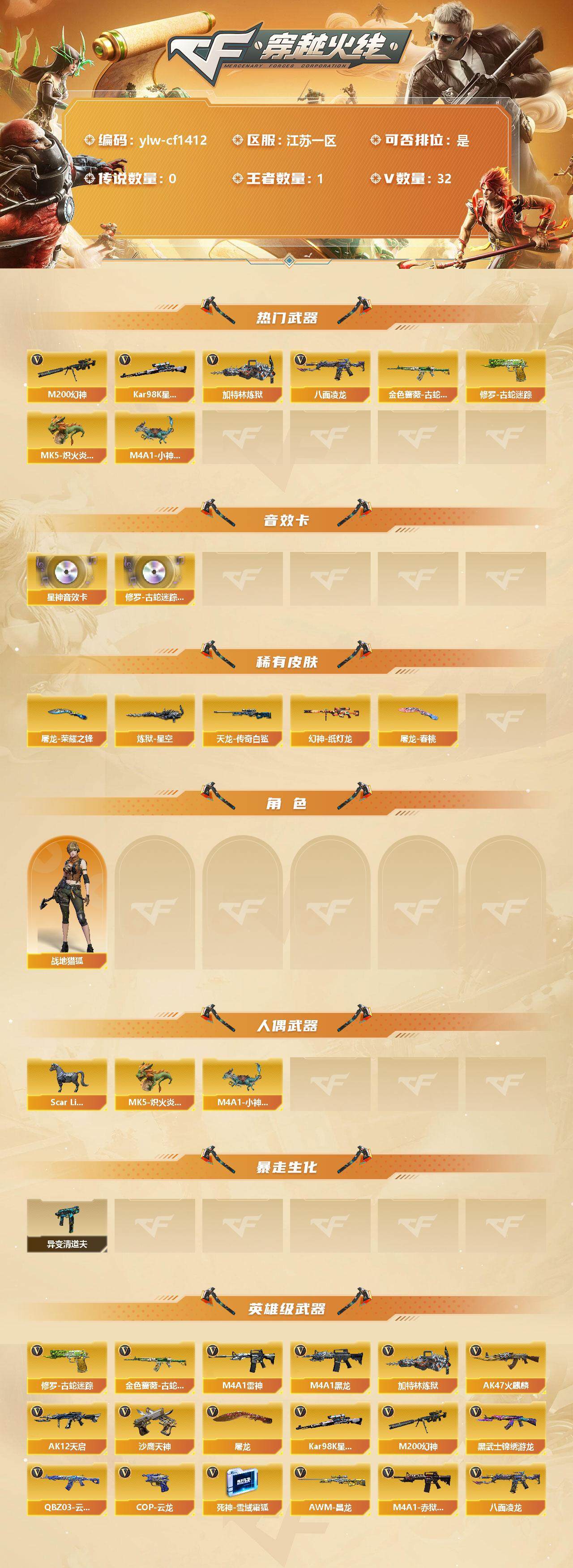 【商品标题】:江苏一区-32v-1王者-0炫金 【热门武器】:m200-幻神,金色蔷薇-古蛇迷踪,修罗-古蛇迷踪,八面凌龙,kar98k-星神,加特林-炼狱,5-炽火炎龙,m4a1-小神龙 【音效卡】:修罗-古蛇迷踪音效卡,kar98k-星神音效卡 【稀有皮肤】:幻神-纸灯龙皮肤,炼狱-星空,awm-天龙-传奇白鲨,屠龙-荣耀之锋,屠龙-春桃 皮肤 【角色】:战地猎狐 【人偶武器】:m4a
