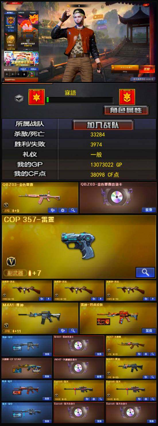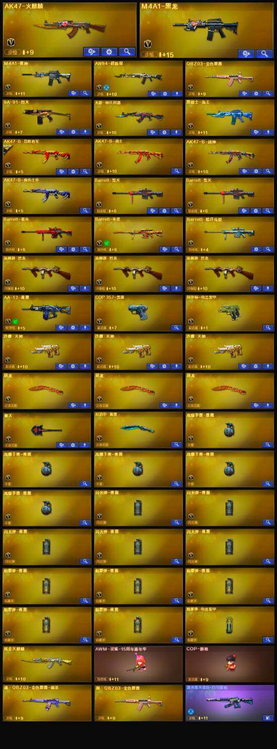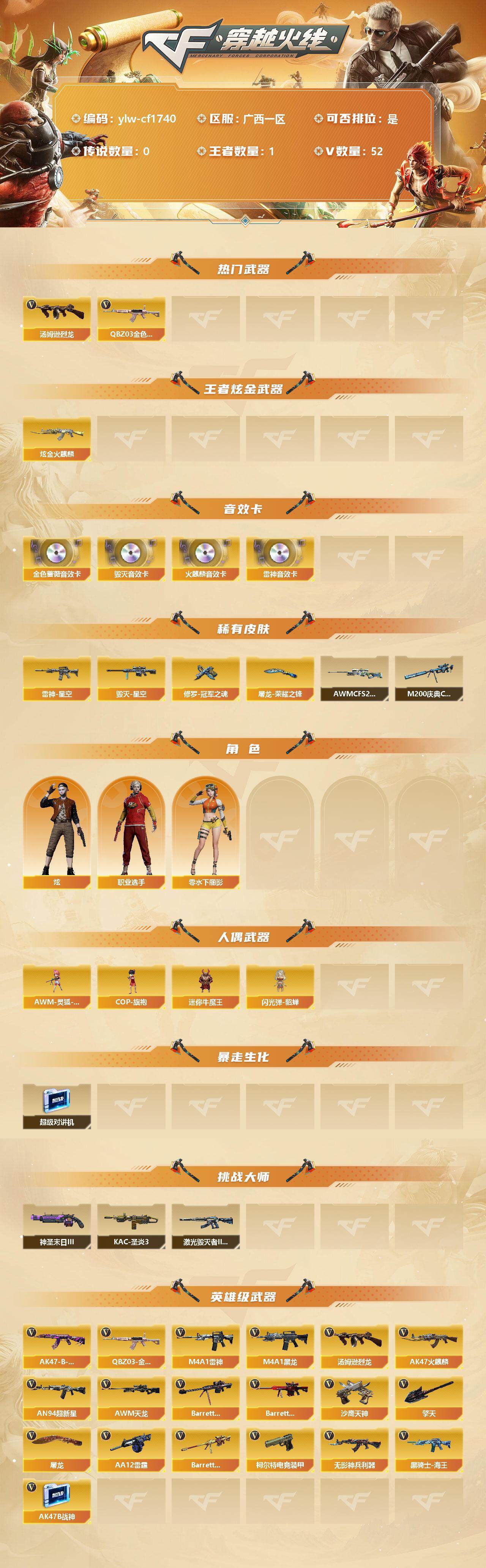 【商品标题】:广西一区-52v-1王者-1炫金 【热门武器】:q03-金色蔷薇,汤姆逊-烈龙3 【王者炫金武器】:炫金火麒麟 【音效卡】:ak47-火麒麟音效卡,m4a1-雷神音效卡,barrett-毁灭音效卡2,q03-金色蔷薇音效卡 【稀有皮肤】:雷神-星空,毁灭-星空,m200-庆典-cfs 2021,awm-cfs 2020,修罗-冠军之魂,屠龙-荣耀之锋 【角色】:零-水
