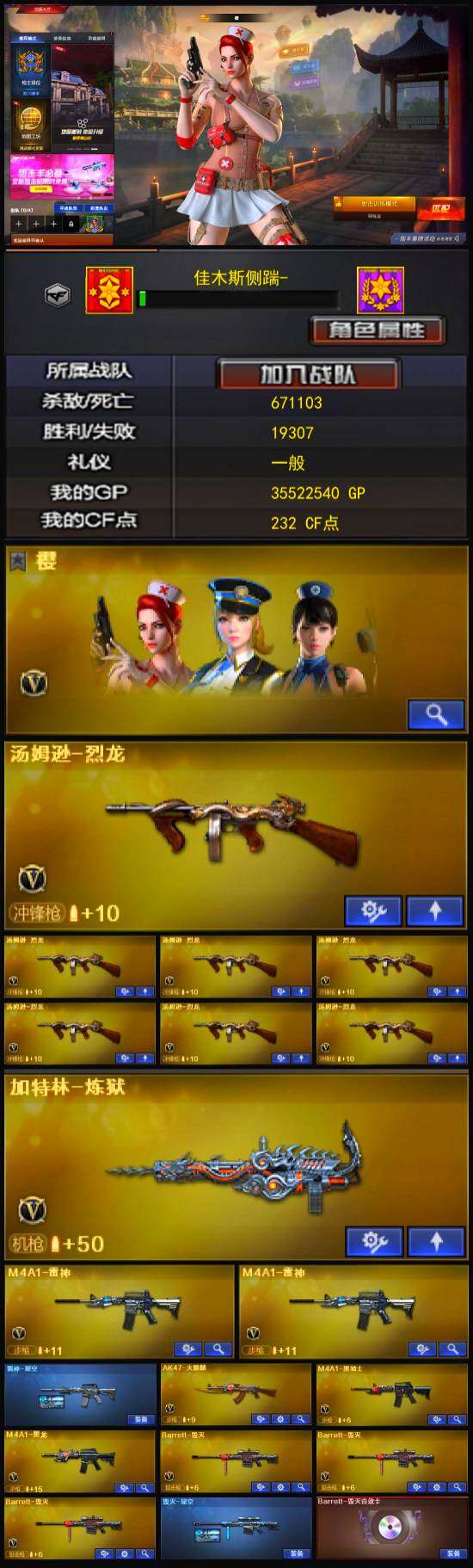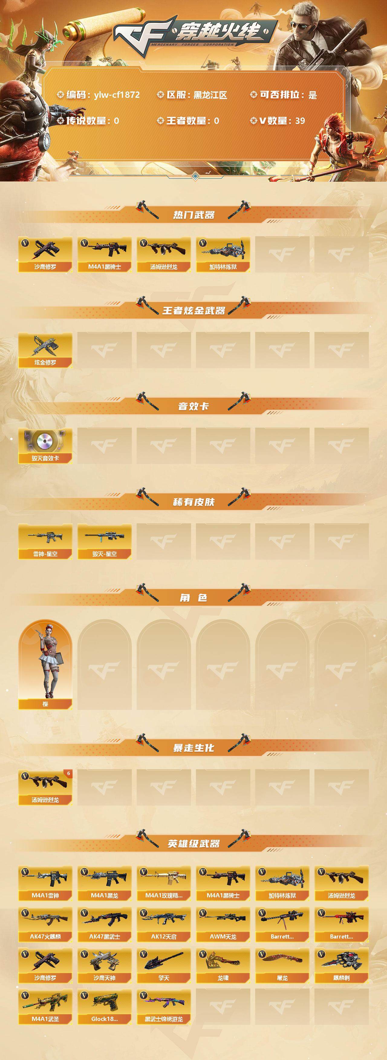 [10665286]【商品标题】:黑龙江区-39v-0王者-1炫金 【热门武器】:m4a1-黑骑士,汤姆逊-烈龙7,加特林-炼狱,沙鹰-修罗3 【王者炫金武器】:炫金修罗 【音效卡】:barrett-毁灭音效卡 【稀有皮肤】:雷神-星空,毁灭-星空 【角色】:樱 【英雄级武器】:m4a1-武圣,glock18-武圣,m4a1-雷神2,m4a1-黑龙,m4a1-玫瑰精灵,m4a1-黑骑士,加特林-炼狱,汤姆逊-烈龙7,ak47-火麒麟,ak47-黑武士2,ak12-天启,awm-天龙,barrett-毁灭3,barrett-极光,黑武士-锦绣游龙,沙鹰-天神2,沙鹰-修罗3,麒麟刺2,擎天2,龙啸2,屠龙2 【特殊呛械】:0白虎,1黑骑士,6烈龙,0盘龙,1炼狱,0蝴蝶斯泰尔