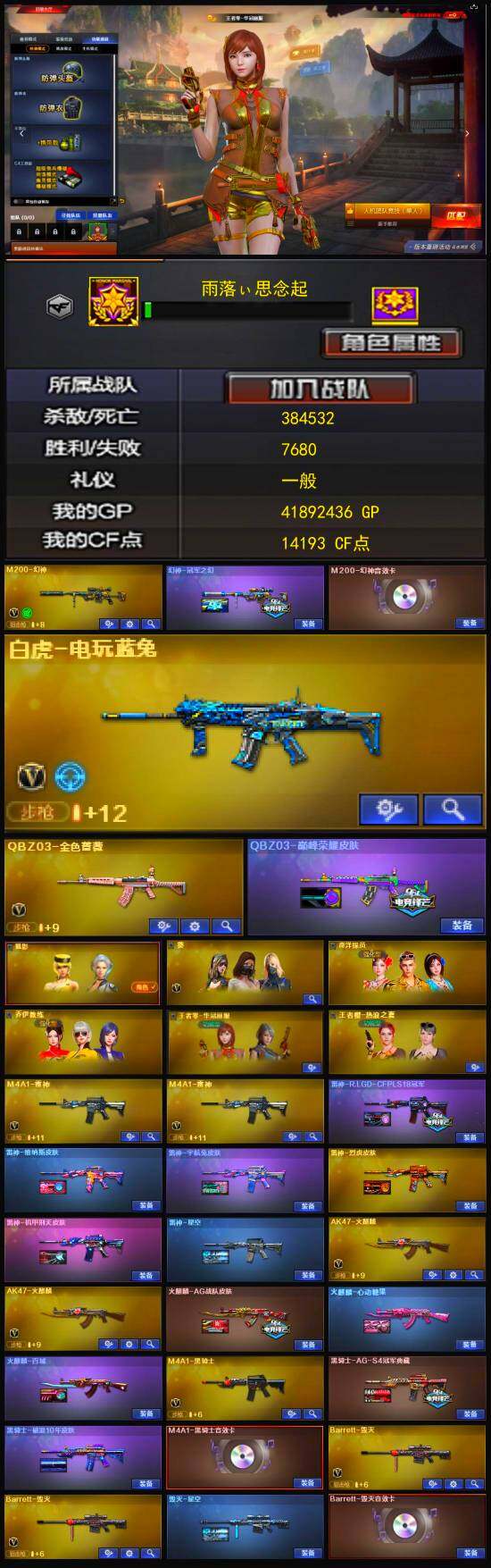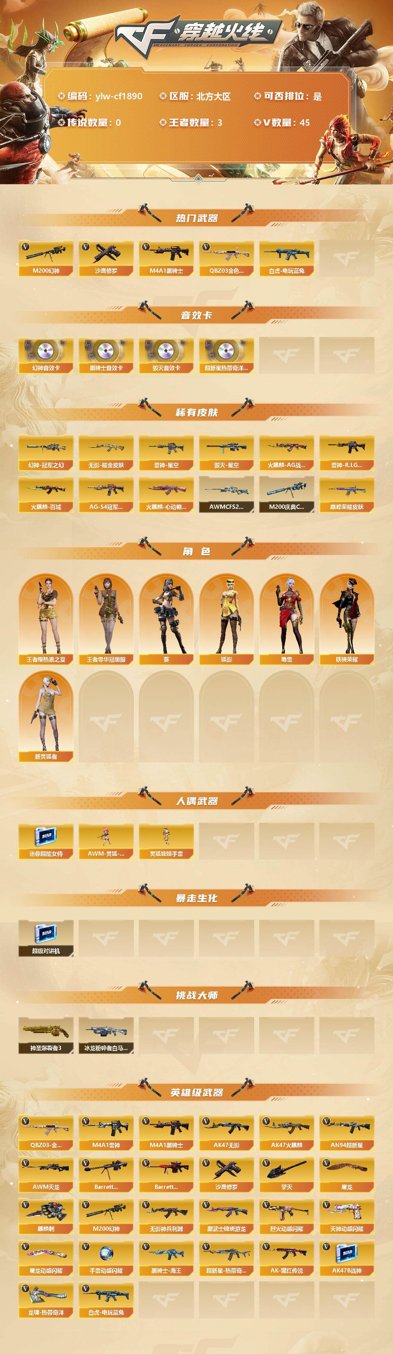 【商品标题】:北方大区-45v-3王者-0炫金 【热门武器】:q03-金色蔷薇,m200-幻神,白虎-电玩蓝兔,m4a1-黑骑士,沙鹰-修罗4 【音效卡】:an94-超新星-热带奇洋音效卡,m200-幻神音效卡,m4a1-黑骑士音效卡,barrett-毁灭音效卡 【稀有皮肤】:幻神-冠军之幻,q03-巅峰荣耀皮肤,雷神-星空,雷神-r.lgd-cfpls18冠军,火麒麟-ag战队皮肤