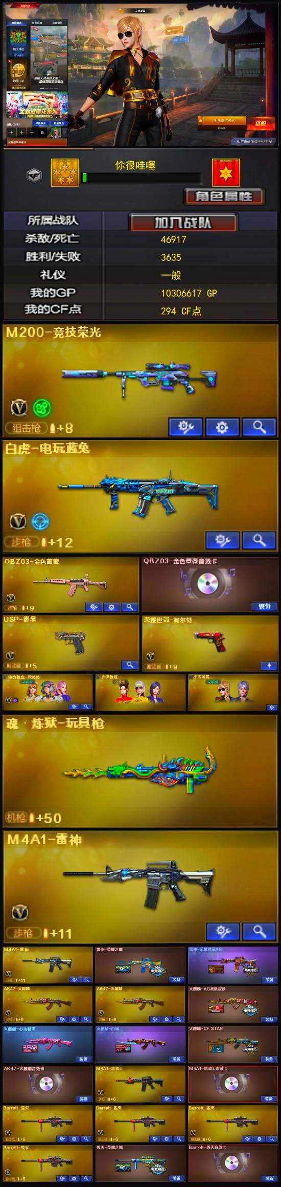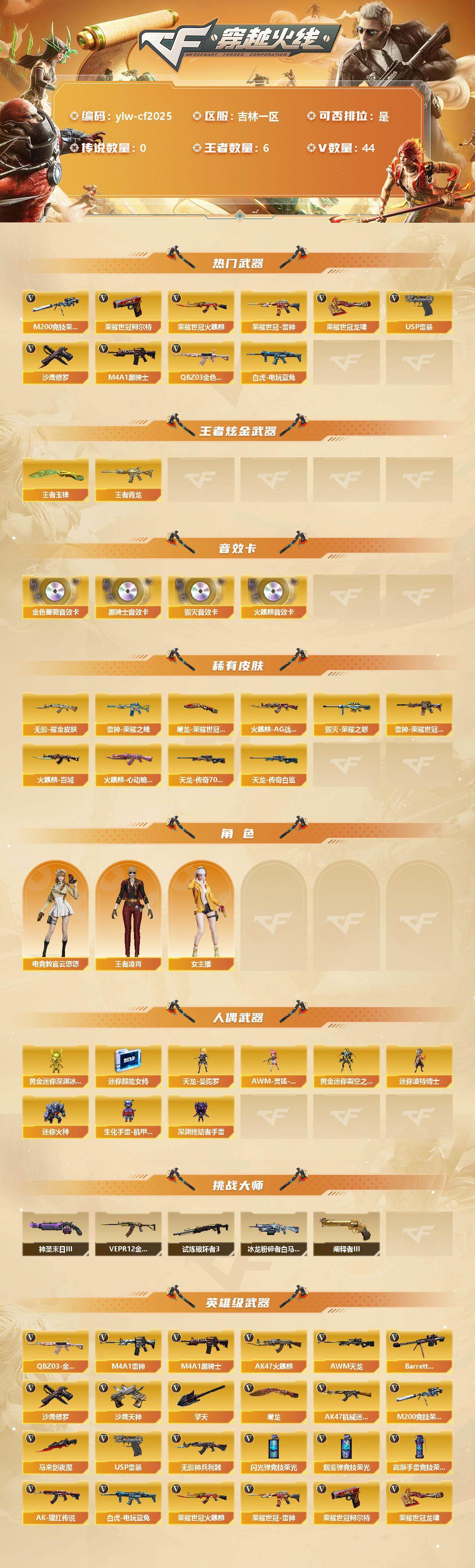 【商品标题】:吉林一区-44v-6王者-0炫金 【热门武器】:q03-金色蔷薇,m200-竞技荣光,荣耀世冠-火麒麟,荣耀世冠-雷神,白虎-电玩蓝兔,荣耀世冠-柯尔特,m4a1-黑骑士,usp-雷暴,沙鹰-修罗,荣耀世冠-龙啸 【王者炫金武器】:王者青龙2,王者玉锋 【音效卡】:ak47-火麒麟音效卡,m4a1-黑骑士音效卡,barrett-毁灭音效卡,q03-金色蔷薇音效卡 【稀有