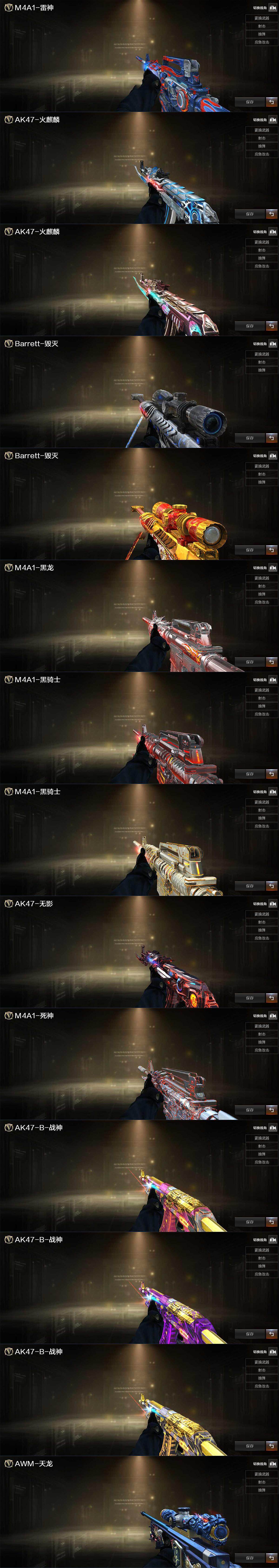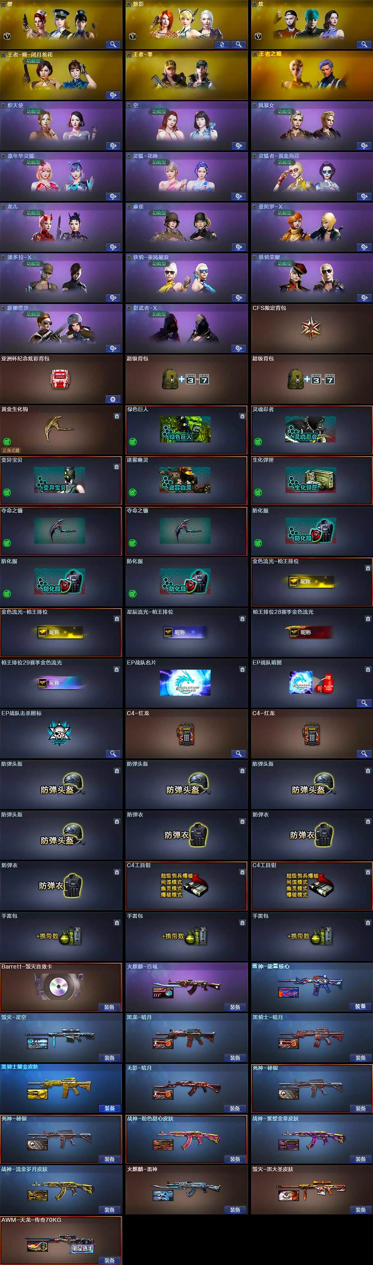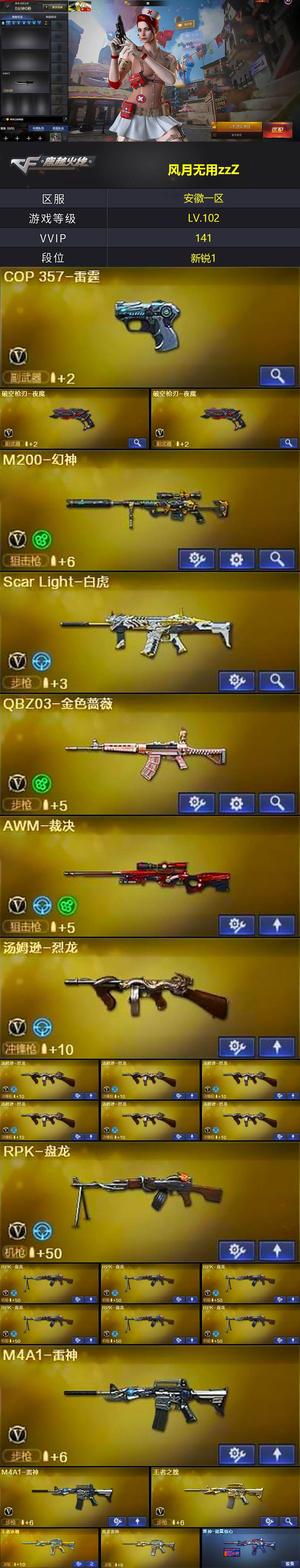 安徽一区-141v-10王者-3炫金 【热门武器】:q03-金色蔷薇,scar light-白虎,hk417-朱雀,m200-幻神,死亡之眼2,m4a1-黑骑士3,汤姆逊-烈龙7,rpk-盘龙7,斯泰尔-蝴蝶,沙鹰-修罗5 【王者炫金武器】:玫瑰精灵-悦动,王者之魄,王者之怒,炫金雷神,炫金天龙,炫金修罗 【音效卡】:barrett-毁灭音效卡 【皮肤】:雷神-能量核心,火麒麟-