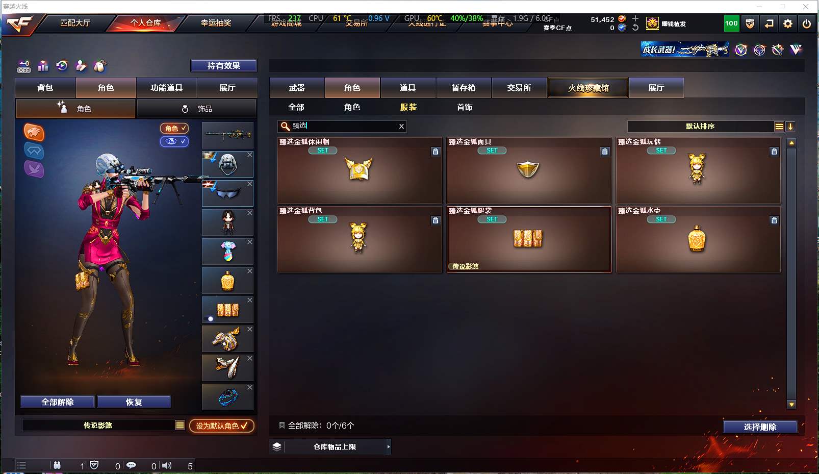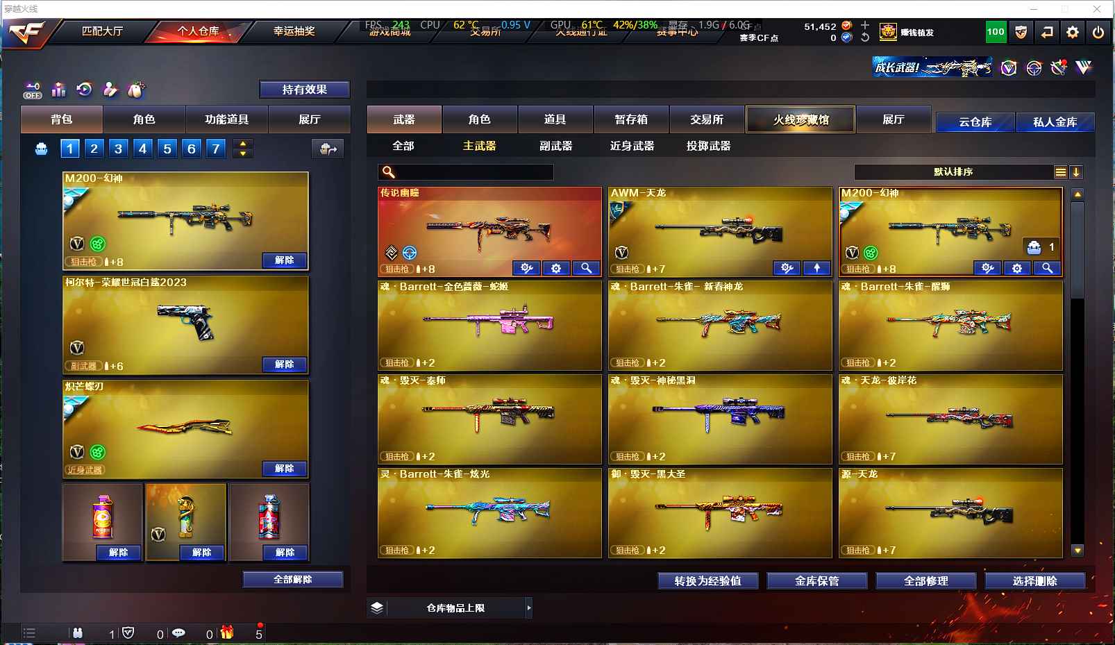 4把炽芒蝶刃23白鲨皮 四防传说影煞 神秘礼盒背包 传说幽瞳 传说破晓 6烈龙 G36C幻影 幻神23白鲨 幻神电流骇客 幻神音效卡 2把23白鲨柯尔特封神放逐者 臻选金狐套 角色隼 挑战9阶 金云 满暴击玩偶