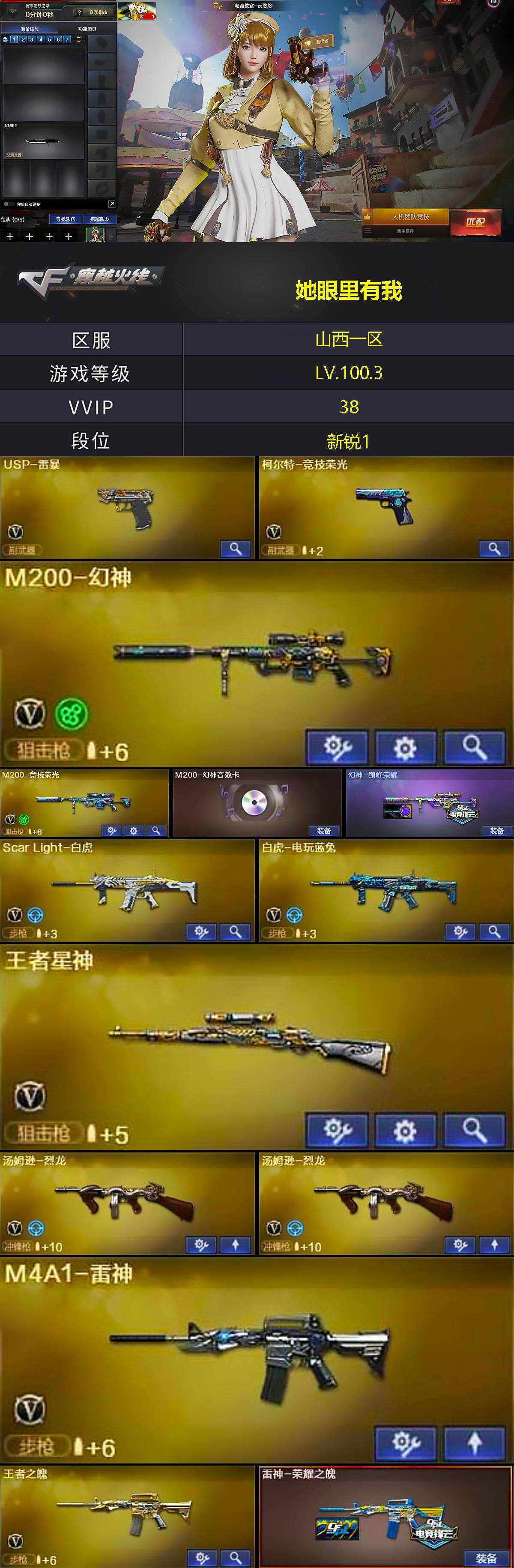 山西一区-38v-3王者-2炫金 【热门武器】:scar light-白虎,m200-幻神,m200-竞技荣光,白虎-电玩蓝兔,m4a1-黑骑士,汤姆逊-烈龙2,斯泰尔-蝴蝶,usp-雷暴 【王者炫金武器】:炫金火麒麟,炫金毁灭 【音效卡】:m200-幻神音效卡,ak47-火麒麟音效卡,m4a1-黑骑士音效卡 【皮肤】:幻神-巅峰荣耀,雷神-荣耀之魄,火麒麟-战神关羽,火麒麟-心动糖果,毁灭
