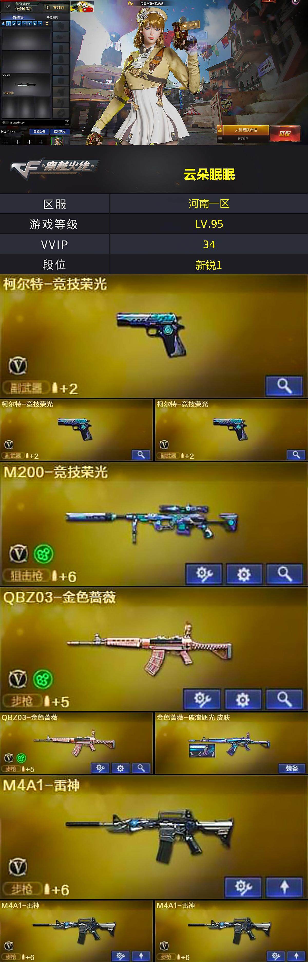 河南一区-32v-0王者-1炫金 【热门武器】:q03-金色蔷薇2,修罗-古蛇迷踪,m200-竞技荣光,m4a1-黑骑士 【王者炫金武器】:炫金黑龙 【皮肤】:金色蔷薇-破浪逐光 皮肤,黑骑士-伏羲2 【角色】:电竞教官-云悠悠,蛇隐宗,乔伊教练,暗夜-x,电竞少女,兰-新年限定,猎狐者-追月,0号玩家,曼陀罗-x,蛇姬,甜心偶像,蜀雪,兔囡囡,维纳斯,新娜塔莎,雪莉杨-摸金校尉 【人