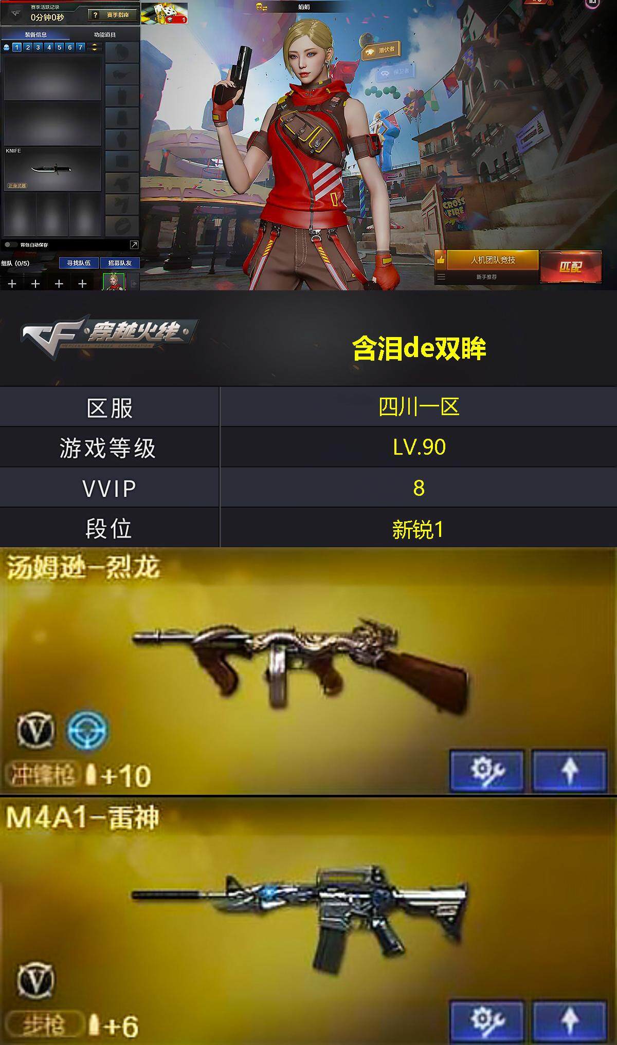 四川一区-8v-0王者-0炫金 【热门武器】:死亡之眼,m4a1-黑骑士,汤姆逊-烈龙,沙鹰-修罗 【角色】:娟娟,潘多拉-x,蜀雪 【暴走生化】:死亡之眼 【挑战大师】:ak47-冰龙粉碎者 【英雄级武器】:ak47-火麒麟,m4a1-雷神,m4a1-黑骑士,barrett-毁灭,汤姆逊-烈龙,沙鹰-修罗,屠龙 【道具】:绿色巨人,灵魂忍者,变异宝贝,迷雾幽灵,夺命之镰,防化服2,呛王排位28赛季金色流光,防弹头盔5,防弹衣5,c4工具钳4,手蕾包4 【特殊呛械】:1黑骑士,1烈龙