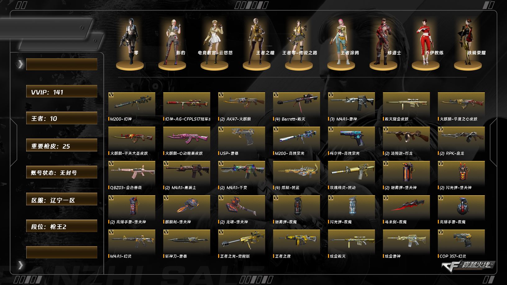 7246,北部,辽宁一区,可排位,142v,幻神,幻神agcfpls17冠军,【竞技荣光套,m200竞技荣光,柯尔特竞技荣光,擎天竞技荣光,】,q金色蔷薇,白虎电玩蓝兔,幻灵套装,cop幻灵,usp雷暴,柯尔特电竞装甲,【四防角色,王者涂鸦,】,】【角色】,电竞教官云悠悠,零,影豹,幻面灵狐