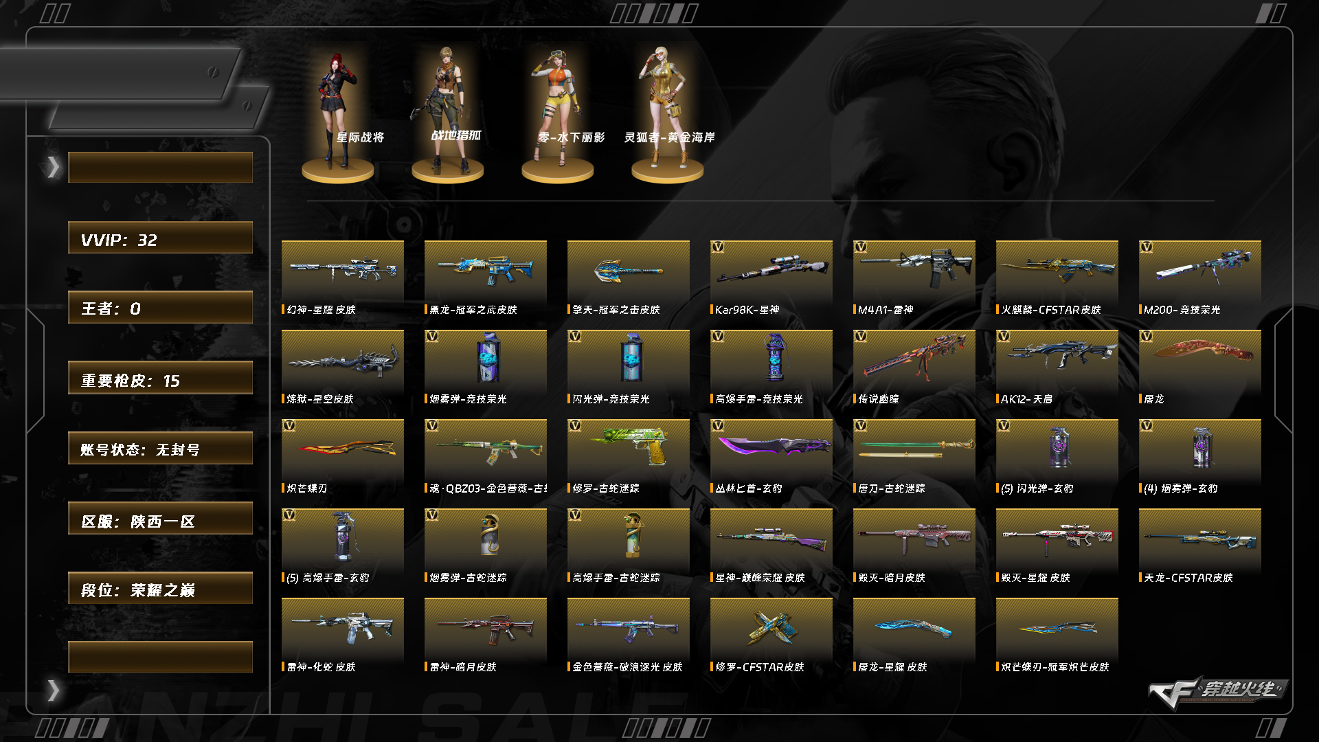 9165/西部/陕西一区/可排位/【荣耀之巅】/lv.88中将1/vip1/31v/传说幽瞳/【星神三件套】/星神/星神音效卡/星神巅峰荣耀/m200竞技荣光/炽芒蝶刃/炽芒蝶刃冠军炽芒/雷神/天启/屠龙/四套玄豹手蕾/一套竞技荣光手蕾/【无幻神】/幻神星耀/【皮肤音效卡】/雷神化蛇/屠龙星耀/
