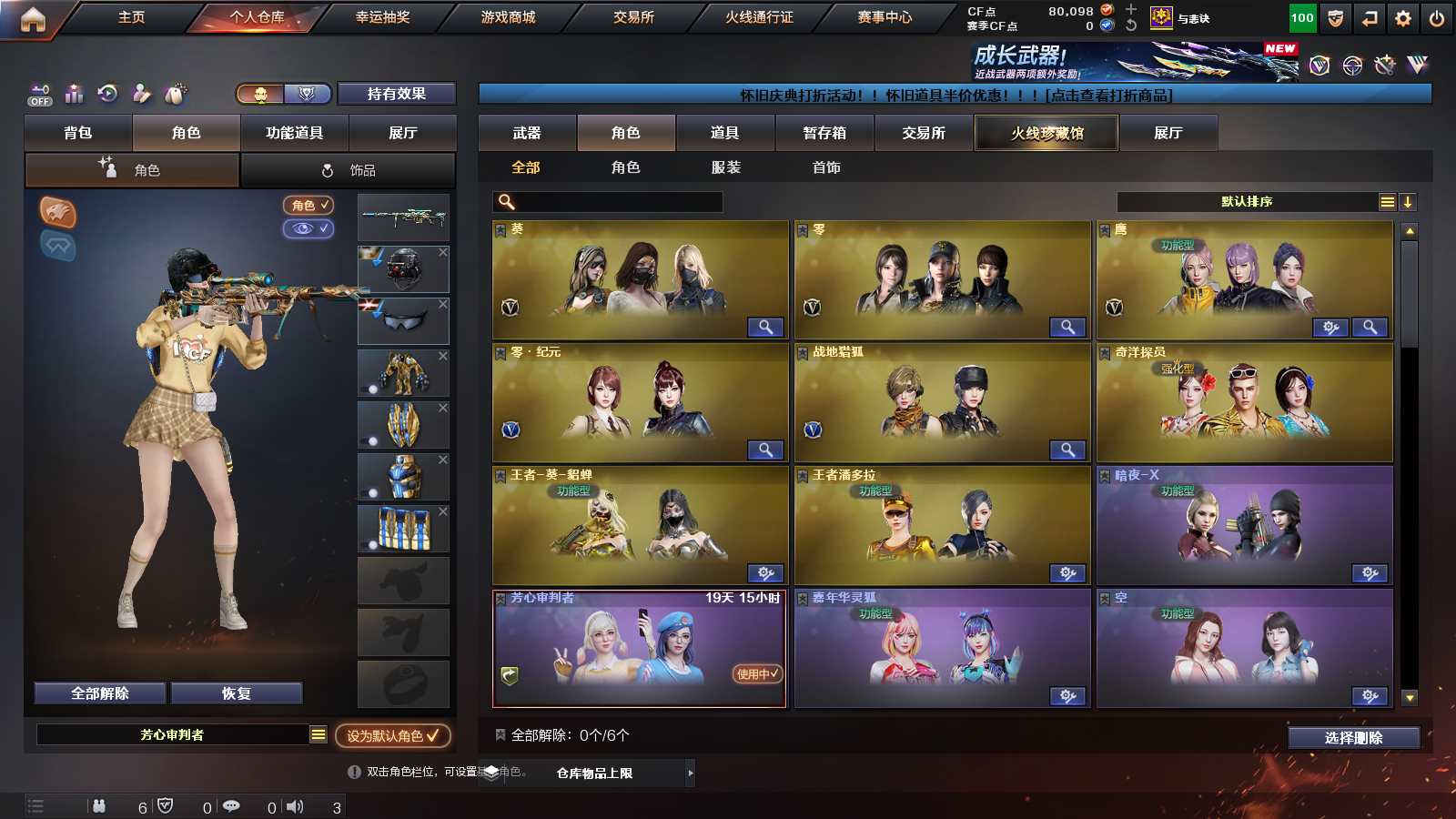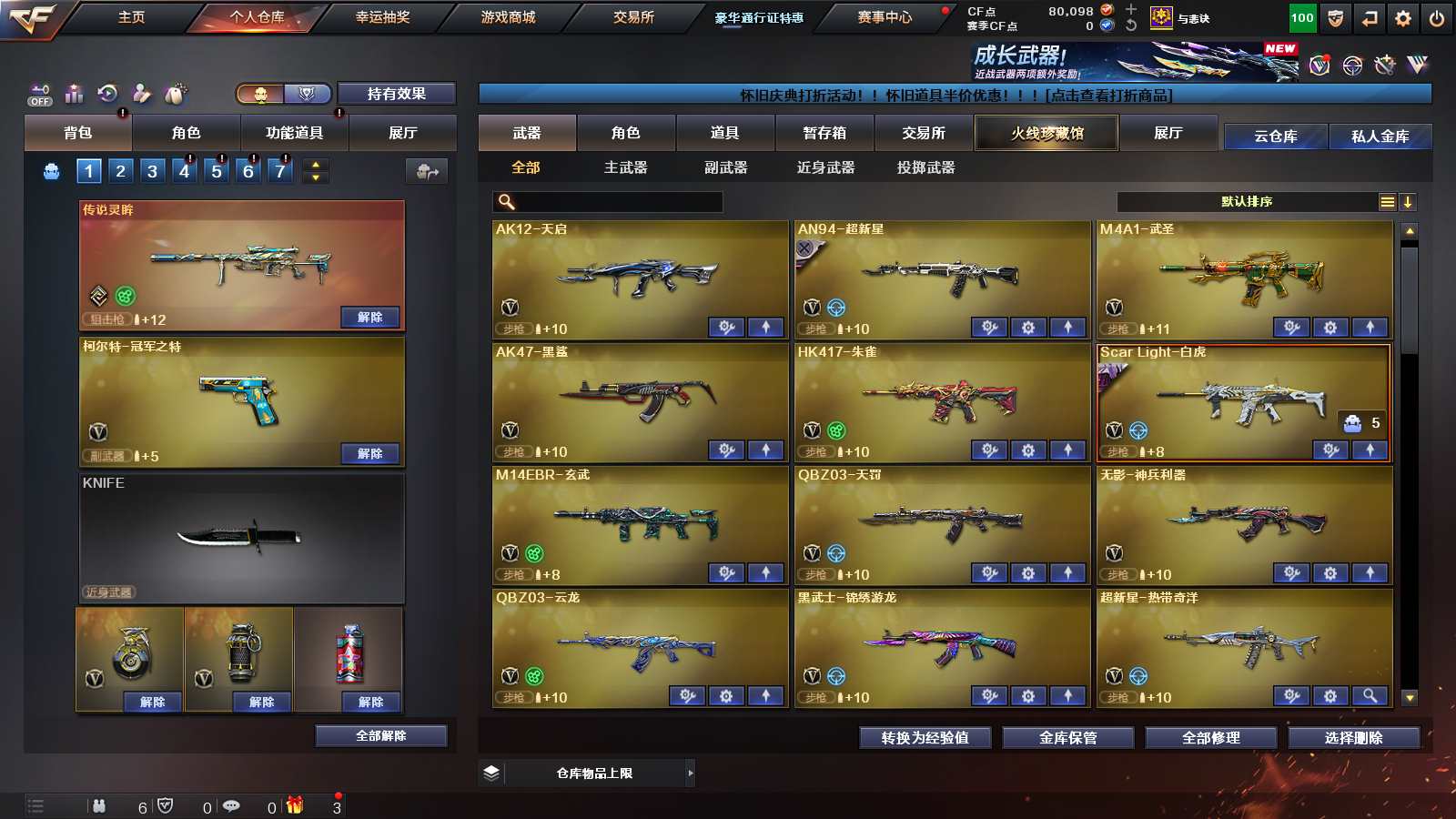 Lv.102段位新锐1,VIP6,136V,5传说,44王者,0炫金,11811CF点,游戏年龄16.8年;【传说武器4】:传说梦魇/传说光耀/传说暗裔/传说夜影;【稀有套装2】:夜魔套装/竞技荣光套装;【重要角色20】:传说艾莉莎/电竞教官-云悠悠/晴雅/瞳/樱/葵/王者-樱-热浪之夏/王者-零-传说之路/王者炫/王者葵-惊若翩鸿/王者涂鸦/葵-阿尔法武装/雪域霜狐/乔伊教练/修道士/铁骑荣耀/职业选手/葵-赛博朋克/幽/灵狐者-职业经理;【武器皮肤72】:幻神-AG-CFPLS24冠军/幻神-传奇欧欧/幻神-CFS2022/幻神-AG-CFPLS17冠军/幻神-青鹤/幻神-丹凤/幻神-冠军之幻/幻神-宠儿-2021MVP/幻神-周瑜/星神-漫游/毁灭-航天科技/毁灭-直播专属/毁灭-魔灵/毁灭-荣耀之怒/毁灭-暗月2/毁灭-BEAN-2020MVP/毁灭-风暴/毁灭耀金/极光-能量核心/天龙-CFSTAR2/裁决-异化之源/AWM-裁决-百城联赛天津/AWM-天龙-传奇白鲨/AWM-天龙-传奇70KG/ScarLight-白虎-暗星/火麒麟-白虎/QBZ03-冠军之薇/QBZ03-AG-CFPLS19冠军/黑骑士-破浪10年/黑骑士-幻能朋克/M4A1-黑骑士-娜塔莉娅/雷神-诺拉/黑骑士-冠军之势/黑骑士-地狱火2/黑骑士-CFS2021/雷神-荣耀之魄/雷神-宠儿-2019MVP/雷神-传奇N9/雷神-荣耀世冠AG/黑龙-能量核心/雷神-虎将/黑骑士-摸金校尉/雷神-能量核心/雷神-烈虎/雷神-暗月/火麒麟-CFSTAR2/火麒麟-心动糖果/火麒麟-AG战队/火麒麟-百城/AK47-火麒麟-传奇EVEN/火麒麟-荣耀世冠AG/AK47-B-常胜将军-曹操2/AK47-B-常胜将军-刘备/AK47-B-常胜将军-孙权/火麒麟-轻羽/炼狱-月/修罗-CFSTAR/修罗-能量核心/屠龙-惊鸿/屠龙-巅峰荣耀/屠龙-荣耀之锋/屠龙-荣耀世冠AG2/龙啸-冠军之啸/裁决-运输船皮肤/火麒麟-枪娘凯萨琳/毁灭-枪娘巴雷特;【英雄武器123】:M200-幻神2/M200-竞技荣光/Kar98K-星神/Barrett-碧霄极光/Barrett-毁灭/Barrett-朱雀/Barrett-极光/AWM-天龙/AWM-裁决/VSK-94-金蚀/ScarLight-白虎/QBZ03-天罚/QBZ03-金色蔷薇/M4A1-再燃火线/M4A1-猎神/死神-雪域霜狐/M4A1-千变/M4A1-武圣/M4A1-夜魔/M4A1-黑骑士/M4A1-青龙/M4A1-雷神/M4A1-黑龙/无影-神兵利器/AK47-火麒麟2/AK47-无影/AK47-黑鲨/AK47-机械迷城/AK47-B-常胜将军/AK47-B-战士/AK47-B-身先士卒/AK47-黑武士/AN94-超新星2/烈火-动感闪耀/AK12-天启/炼狱-风暴/加特林-炼狱2/RPK-盘龙6/汤姆逊-烈龙7/柯尔特-冠军之特/柯尔特-竞技荣光2/荣耀世冠-柯尔特/COP-堕天神/USP-雷暴/破空枪刃-夜魔2/天神-动感闪耀/沙鹰-修罗/沙鹰-天神6/Glock18-武圣/屠龙-动感闪耀/幻灵之锋/屠龙3/荣耀世冠-龙啸/龙啸-堕天神/擎天-云海游龙/擎天-竞技荣光/擎天4/麒麟刺/麒麟刺-堕天神/马来剑-夜魔/手雷-动感闪耀/高爆手雷-神工天巧/高爆手雷-竞技荣光/高爆手雷-夜魔4/高爆手雷-幻灵/高爆手雷-堕天神3/闪光弹-神工天巧/闪光弹-竞技荣光/闪光弹-夜魔4/闪光弹-幻灵/闪光弹-堕天神3/烟雾弹-神工天巧/烟雾弹-竞技荣光/烟雾弹-夜魔4/烟雾弹-幻灵/烟雾弹-堕天神3/炼狱-百战金芒/机械迷城-穹宇/麒麟刺-百战金芒/FAMASG2-天戎/9A91-烈火;【热门武器16】:1修罗/6烈龙/6盘龙/1黑骑士/2炼狱;【音效卡13】:Barrett-碧霄极光音效卡2/炼狱-百战金芒-庆典舞曲音效卡/AWM-裁决音效卡/M4A1-雷神-怀旧音效卡/死神-雪域霜狐-怀旧音效卡/QBZ03-金色蔷薇音效卡/ScarLight-白虎音效卡/Kar98K-星神音效卡/Barrett-毁灭音效卡/M4A1-黑骑士音效卡/AK47-火麒麟音效卡/M200-幻神音效卡;【王者武器39】:王者幻神-觉醒版/王者星神-觉醒版/王者之光-觉醒版/王者之怒-觉醒版/王者之决-觉醒版2/QBZ-03-王者蔷薇-觉醒版/王者风势-觉醒版/王者之戮-觉醒版/M4A1-雷霆王者-觉醒版/王者青龙/王者之势-觉醒版/王者冰魄-觉醒版/王者火魄-觉醒版/王者之影-觉醒版/王者之心-觉醒版/王者凤吟/王者玄武/超新星-悦享-觉醒版/王者之烈-觉醒版/悦蓝-惊涛骇浪-觉醒版/王者之霆/COP357-雷霆王者-觉醒版/王者之灵-觉醒版/王者之魂-觉醒版/王者冰锋/王者之锋-觉醒版2/王者之啸-觉醒版/王者之击-觉醒版/高爆手雷-雷霆王者3/闪光弹-雷霆王者-觉醒版3/烟雾弹-雷霆王者-觉醒版3;【小人枪27】:夺魂/火麒麟-绝迹2/迷你火种/迷你深渊冰龙/生化手雷-机甲核心/迷你裂空之翼/迷你宝贝/魔能飞环-曼陀罗/AWM-灵狐-15周年嘉年华/迷你波特博士/灵狐娃娃手雷/COP-白鲨/深渊终结者手雷/炼狱-迷你小钢/裁决-雪莉杨/Cat-刀锋/牛牛-AK47/冰火魔兽/迷你牛牛/M37-葵/COP-旗袍/斯泰尔-蝴蝶/高爆手雷-大乔/闪光弹-貂蝉/巴雷特-零-水下丽影/迷你生化手雷;【暴走生化4】:毒蜂/炼狱-迷你小钢/死亡之眼/斯泰尔-蝴蝶;【挑战大师9】:毒蜂/迷你火种/神圣爆裂者-末日III/末日审判者III/致命乱世-超越Max/迷你深渊冰龙/试炼破坏者III/阐释者III/唐刀-戎马一生;【官方截图】【所有武器的数量可能含有时效性,具体请以游戏内仓库实际拥有为准】