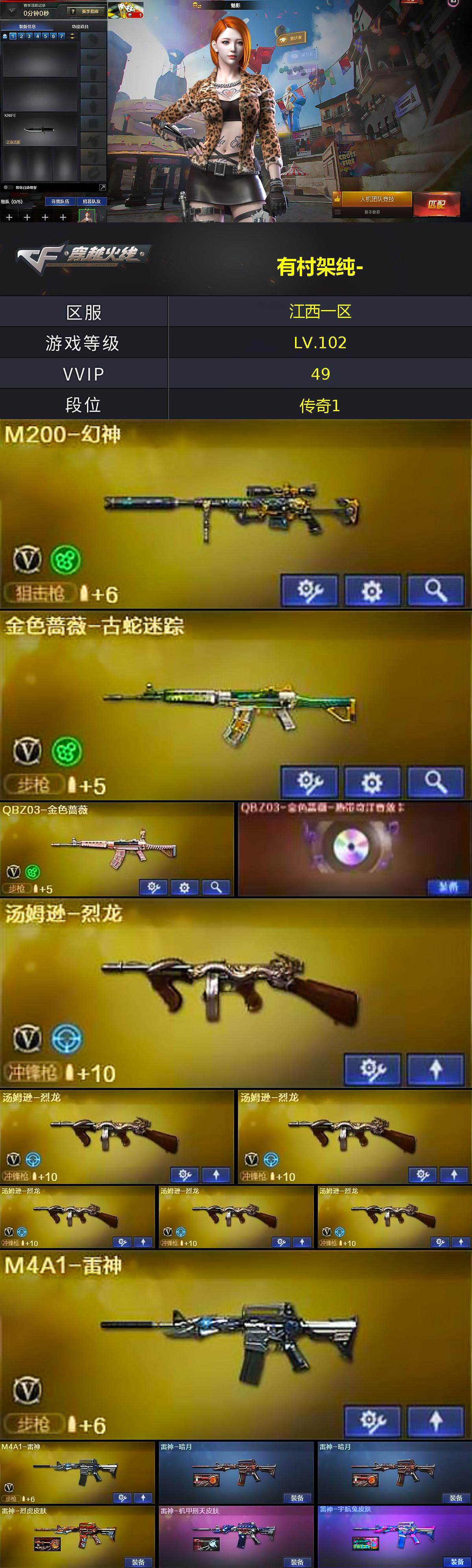 江西一区-43v-1王者-0炫金 【热门武器】:q03-金色蔷薇,m200-幻神,金色蔷薇-古蛇迷踪,修罗-古蛇迷踪,m4a1-黑骑士,汤姆逊-烈龙6,沙鹰-修罗4 【音效卡】:an94-超新星-热带奇洋音效卡,q03-金色蔷薇-热带奇洋音效卡,m4a1-黑骑士音效卡 【皮肤】:雷神-暗月2,雷神-烈虎皮肤,雷神-机甲刑天皮肤,雷神-宇航兔皮肤,火麒麟-平天大圣,火麒麟-百城,毁