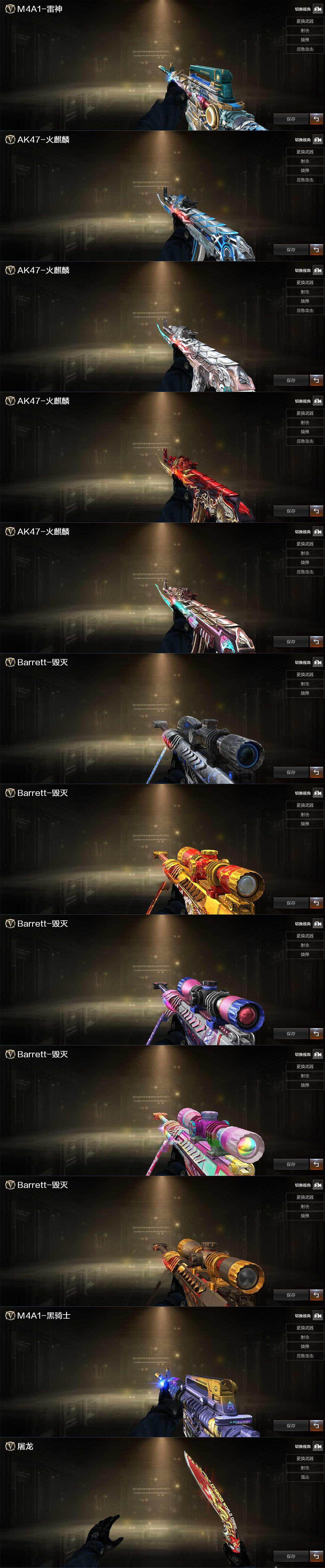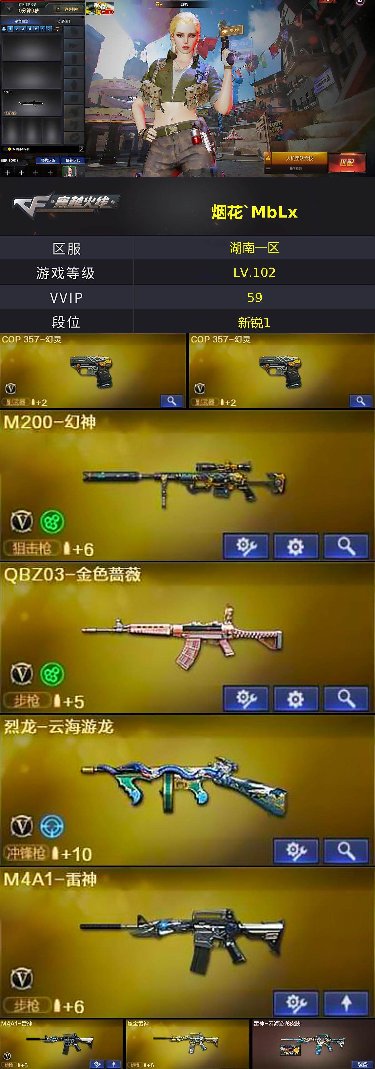 湖南一区-55v-2王者-1炫金 【热门武器】:q03-金色蔷薇,m4a1-青龙,m200-幻神,金色小号,c.a.t,牛牛-ak47,雷神-小红,cop 357-幻灵2 【王者炫金武器】:炫金雷神 【音效卡】:擎天-云海游龙音效卡,barrett-毁灭音效卡,hk417-朱雀音效卡 【皮肤】:雷神-云海游龙皮肤,火麒麟-雷神,火麒麟-轻羽皮肤,火麒麟-平天大圣,火麒麟-百城,毁灭-星空