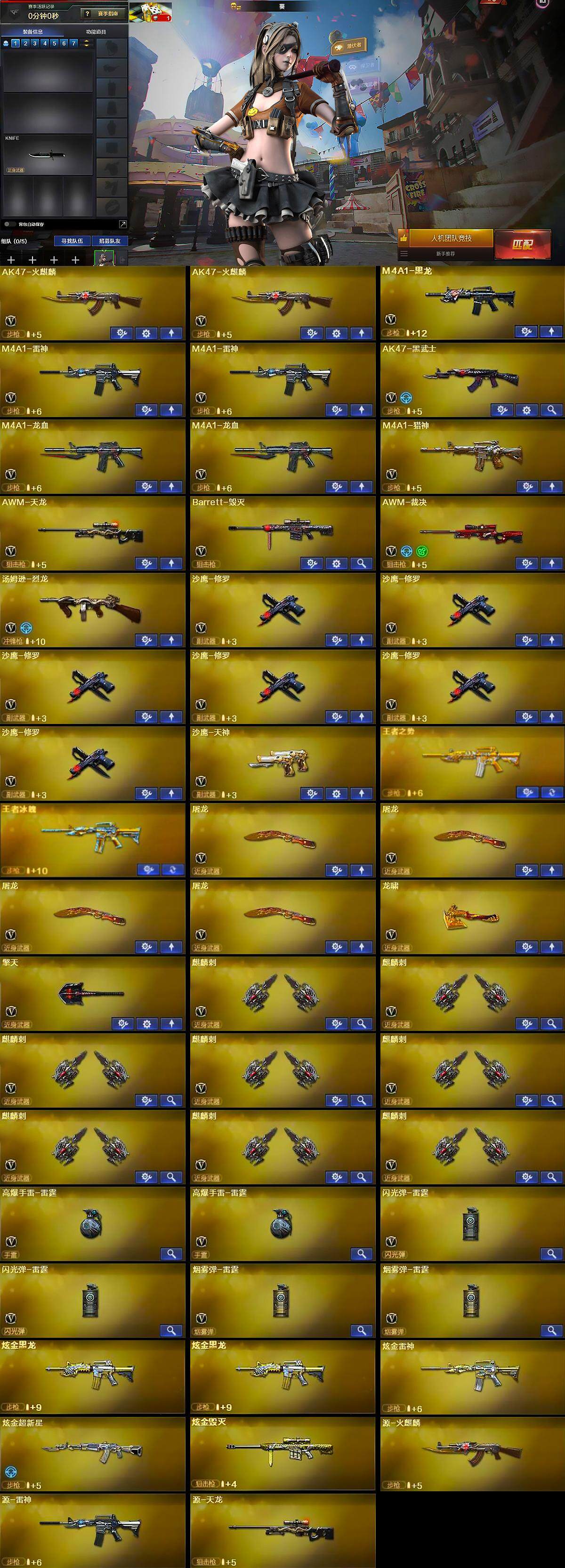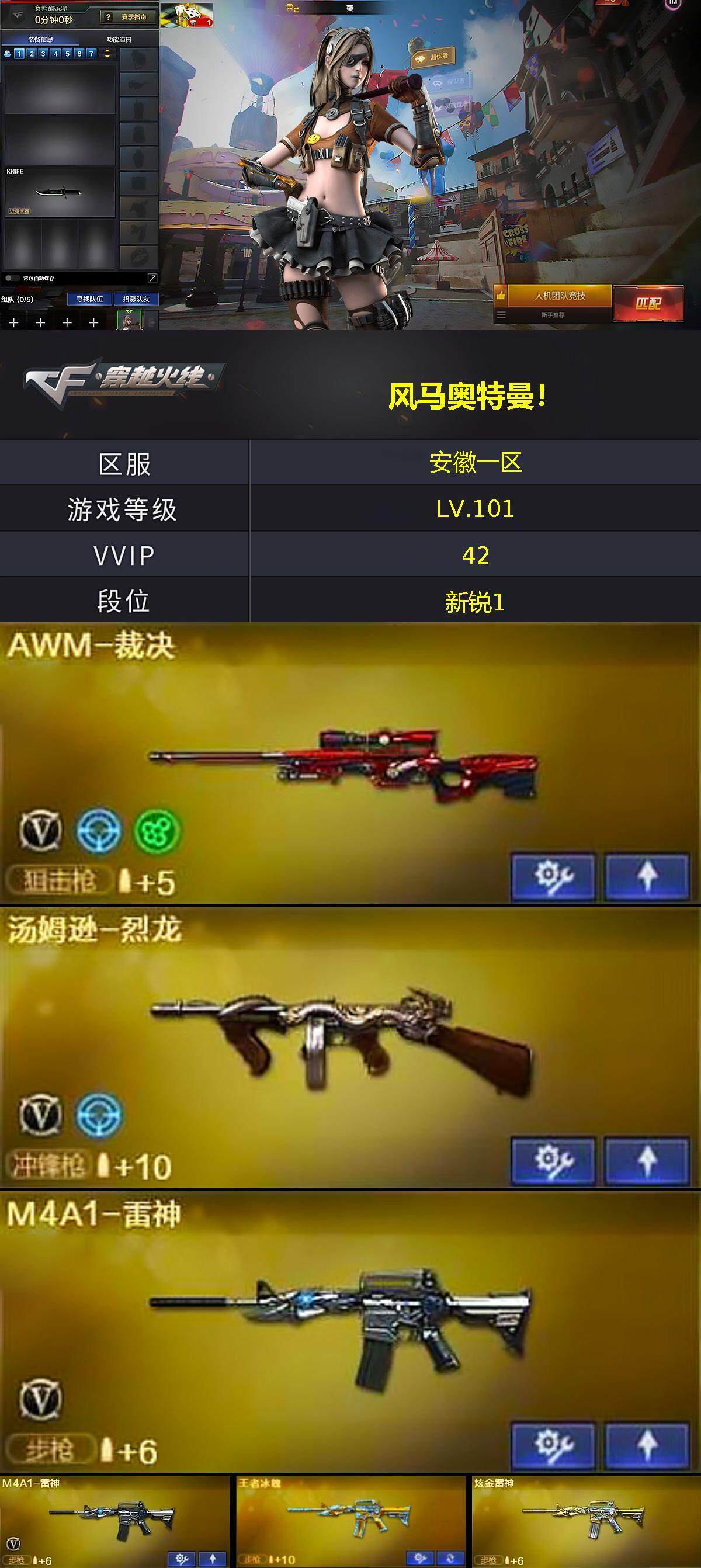 安徽一区-42v-2王者-5炫金 【热门武器】:汤姆逊-烈龙,沙鹰-修罗6 【王者炫金武器】:王者之势,王者之魄,炫金黑龙2,炫金雷神,炫金超新星,炫金毁灭 【皮肤】:天神-暗月 【角色】:葵,空,新娜塔莎,影武者-x 【英雄级武器】:ak47-火麒麟2,m4a1-黑龙,m4a1-雷神2,ak47-黑武士,m4a1-龙血2,m4a1-猎神,awm-天龙,barrett-毁灭,awm-