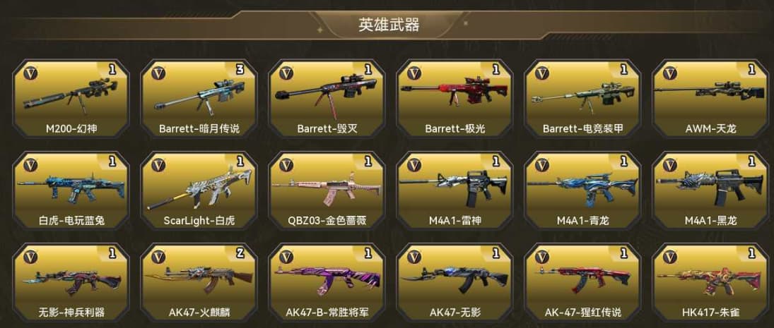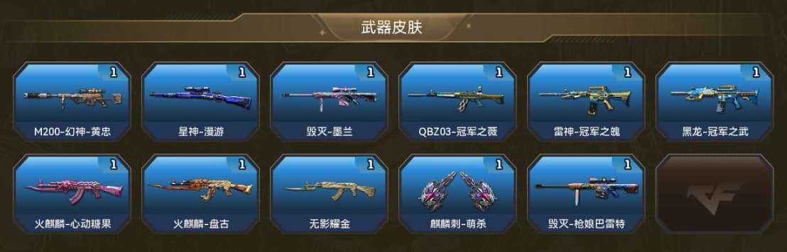 2282810-传说辉光 幻神皮肤 电竞装甲套 星神 白虎 q带皮 雷神三件套 火麒麟三件套)cf北部/吉林一区/47v/传说辉光/幻神 黄忠/电竞装甲套/王者星神/scar白虎 白虎电玩蓝兔/q金色蔷薇 冠军之薇/朱雀/青龙/雷神 冠军之魄 音效卡/火麒麟 盘古 音效卡/毁灭 呛娘格雷姐妹/黑龙 冠军之武/6王者/雨棠 王者葵惊若翩鸿 王者玲珑小乔(四防)/3音效卡/多皮