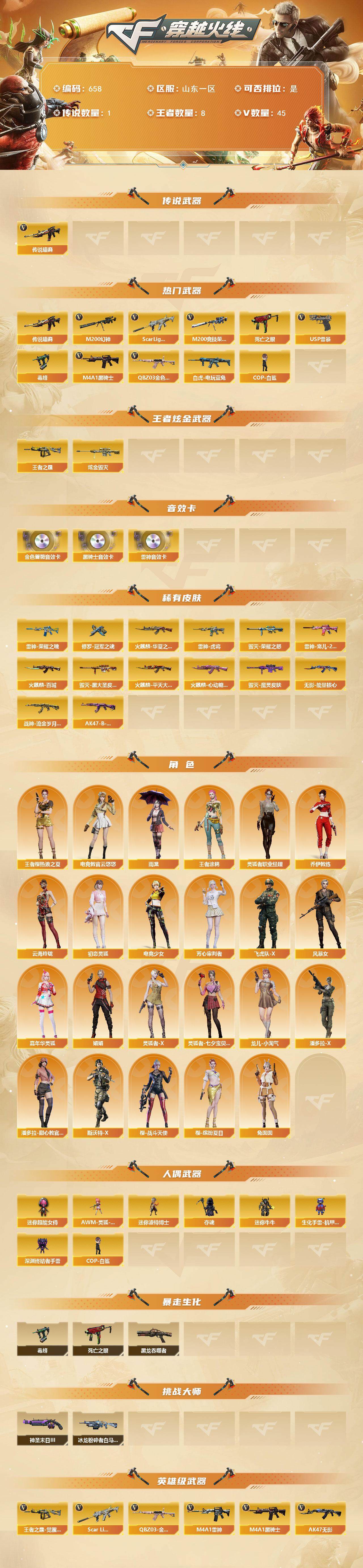[14193636]山东一区-45v-8王者-1炫金 【传说武器】:传说暗裔 【热门武器】:传说暗裔,q03-金色蔷薇,scar light-白虎,m200-幻神,m200-竞技荣光,死亡之眼,白虎-电玩蓝兔,毒蜂,m4a1-黑骑士,cop-白鲨,usp-雷暴 【王者炫金武器】:王者之霆,炫金毁灭 【音效卡】:m4a1-雷神音效卡,m4a1-黑骑士音效卡,q03-金色蔷薇音效卡 【皮肤】:雷神-荣耀之魄,雷神-虎将,雷神-宠儿-2019mvp,火麒麟-华夏之心,火麒麟-平天大圣,火麒麟-百城,火麒麟-心动糖果,毁灭-荣耀之怒,毁灭-黑大圣皮肤,毁灭-魔灵皮肤,无影-能量核心,战神-流金岁月皮肤,ak47-b-常胜将军-曹操,修罗-冠军之魂 【角色】:雨棠,电竞教官-云悠悠,王者樱-热浪之夏,王者涂鸦,乔伊教练,云海玲珑,初恋灵狐,电竞少女,芳心审判者,飞虎队-x,风暴女,嘉年华灵狐,娟娟,灵狐者-x,灵狐者-七夕宝贝,灵狐者-职业经理,龙儿-小淘气,潘多拉-x,潘多拉-甜心教官,斯沃特-x,兔囡囡,樱-战斗天使,樱-缤纷夏日 【人偶武器】:cop-白鲨,awm-灵狐-15周年嘉年华,迷你波特博士,夺魂,迷你牛牛,生化手蕾-机甲核心,深渊终结者手蕾2,迷你超能女侍 【暴走生化】:毒蜂,黑龙吞噬者,死亡之眼 【挑战大师】:冰龙粉碎者-白马银呛3,神圣爆裂者-末日iii 【英雄级武器】:ak47-火麒麟,m4a1-雷神,m4a1-黑骑士,ak47-无影,m4a1-武圣,scar light-白虎,无影-神兵利器,q03-金色蔷薇,王者之影-觉醒版,超新星-悦享-觉醒版,ak-47-猩红传说2,ak47-b-战神,白虎-电玩蓝兔,barrett-毁灭,m200-幻神,m200-竞技荣光,王者星神-觉醒版,王者之霆-觉醒版,usp-雷暴,柯尔特-竞技荣光,glock18-武圣,天神-动感闪耀,擎天-竞技荣光,擎天-云海游龙,王者之锋-觉醒版2,高爆手蕾-竞技荣光5,手蕾-动感闪耀,手蕾-云海游龙,闪光丹-竞技荣光8,盐雾蛋-竞技荣光5 【道具】:cfs限定背包,亚洲杯纪念炫彩背包,全能呛王背包,虎牙炫彩背包,超级背包,绿色巨人,灵魂忍者,迷雾幽灵,夺命之镰,防化服2,金色流光-呛王排位2,语音特效-机器人,电玩兔兔表情,云海游龙表情,ep战队名片,ep战队喷图,防