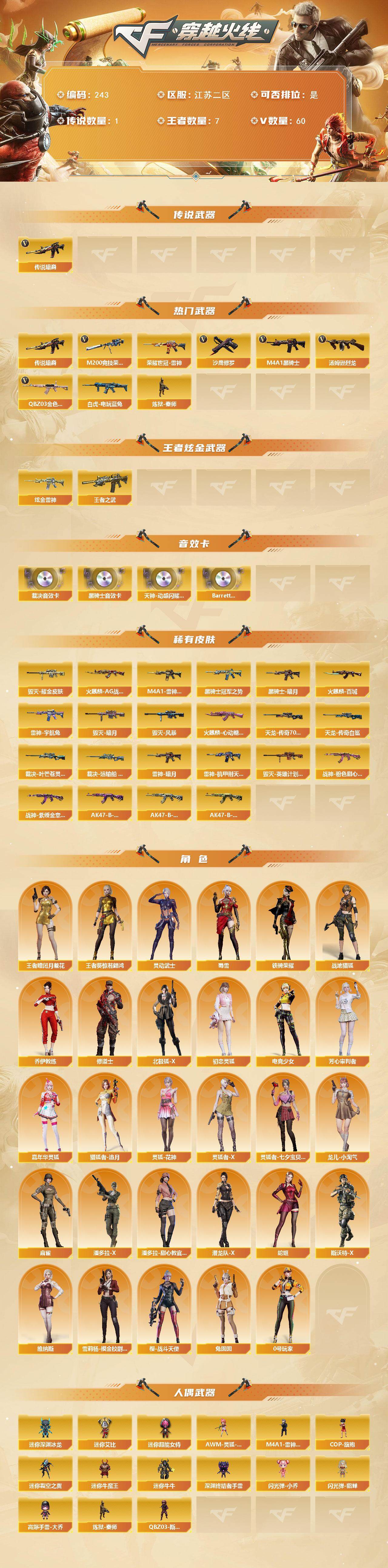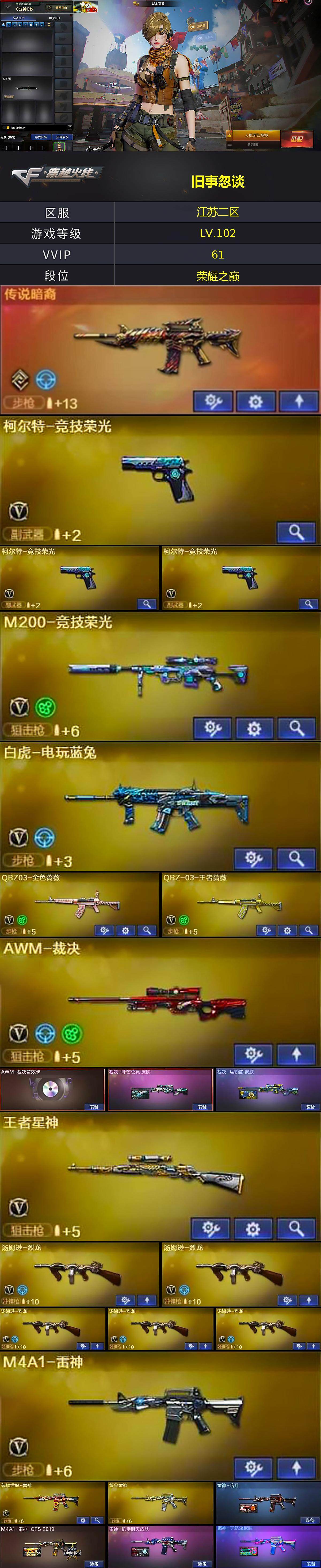 江苏二区-60v-7王者-1炫金 【传说武器】:传说暗裔 【热门武器】:传说暗裔,q03-金色蔷薇,m200-竞技荣光,荣耀世冠-雷神,白虎-电玩蓝兔,m4a1-黑骑士,汤姆逊-烈龙5,炼狱-秦师,沙鹰-修罗2 【王者炫金武器】:王者之武,炫金雷神 【音效卡】:天神-动感闪耀 音效卡,m4a1-黑骑士音效卡,awm-裁决音效卡,barrett-碧霄极光音效卡2 【皮肤】:裁决-叶芒苍