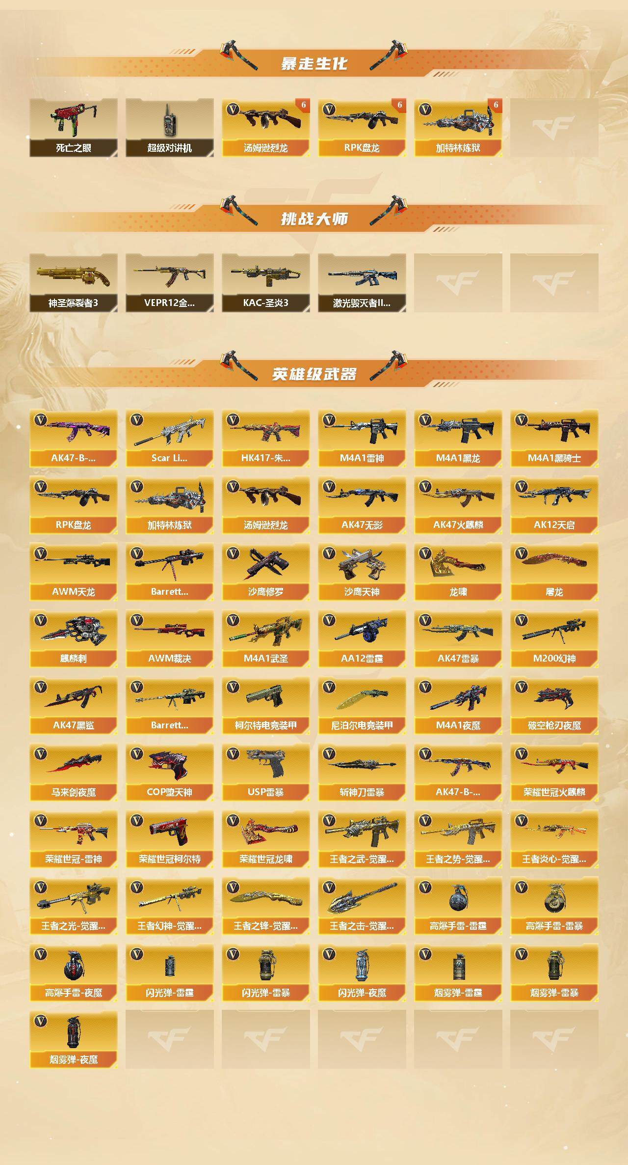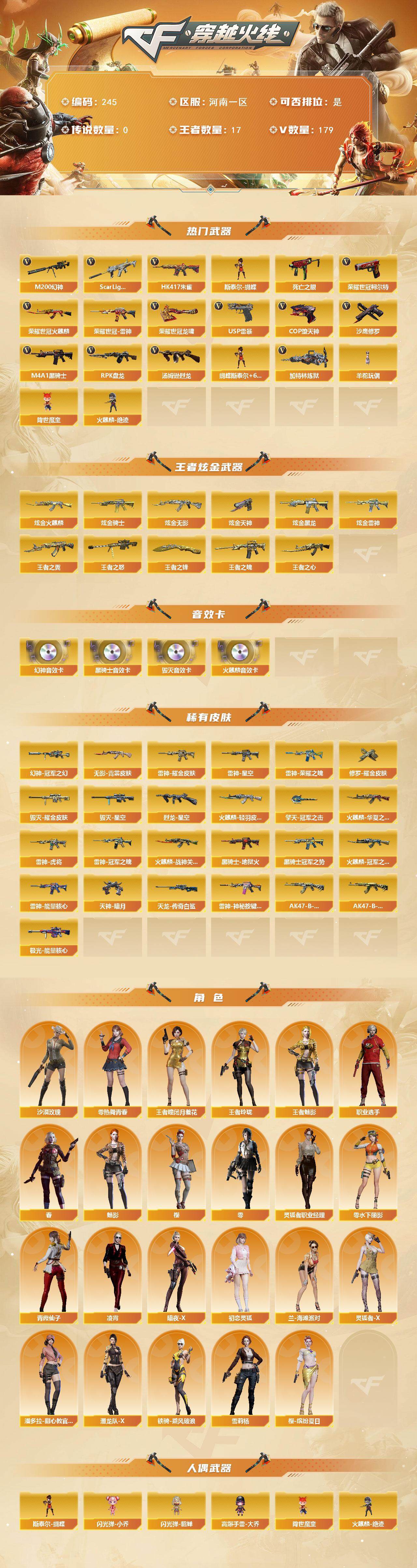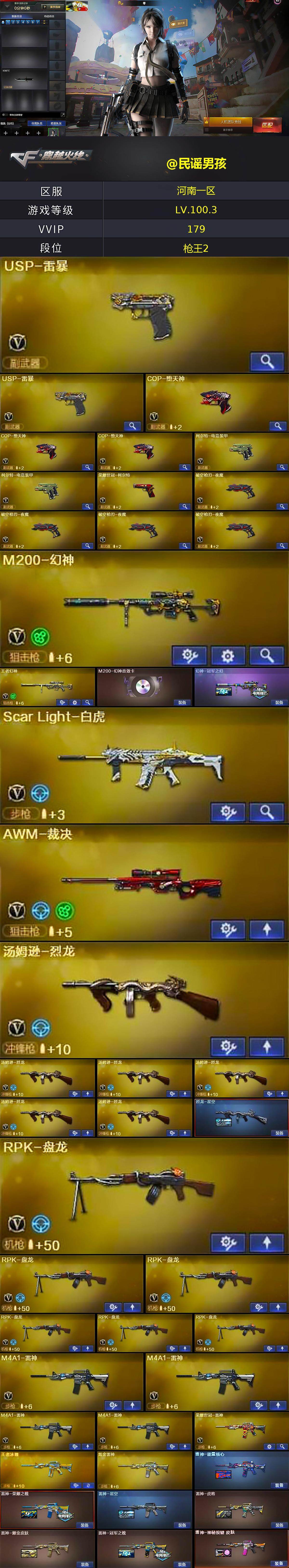 河南一区-179v-17王者-6炫金 【热门武器】:scar light-白虎,hk417-朱雀3,m200-幻神,死亡之眼,荣耀世冠-火麒麟,荣耀世冠-雷神,荣耀世冠-柯尔特,m4a1-黑骑士3,汤姆逊-烈龙6,rpk-盘龙6,加特林-炼狱6,斯泰尔-蝴蝶,羊驼玩偶,降世魔童,火麒麟-绝迹,usp-雷暴2,cop-堕天神3,沙鹰-修罗12,荣耀世冠-龙啸 【王者炫金武器】:王