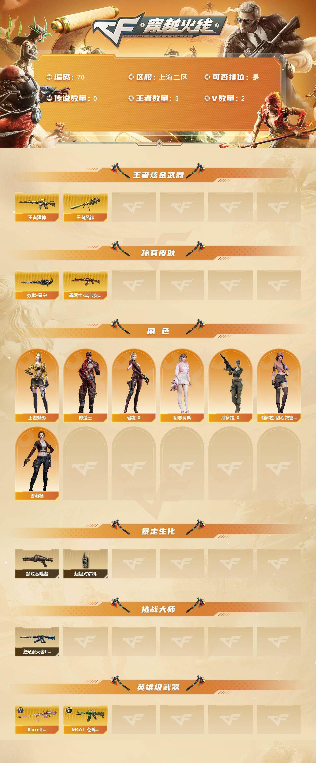 上海二区-2v-3王者-0炫金 【王者炫金武器】:王者猎神,王者风神 【皮肤】:黑武士-典韦皮肤,炼狱-星空 【角色】:王者-魅影,修道士,暗夜-x,初恋灵狐,潘多拉-x,潘多拉-甜心教官,雪莉杨 【暴走生化】:黑龙吞噬者,超级对讲机 【挑战大师】:激光毁灭者iii-白马银呛 【英雄级武器】:barrett-金色蔷薇,m4a1-苍鸣雷神 【道具】:女皇终结者-背包,战舰背包,女皇终结者-魔龙之
