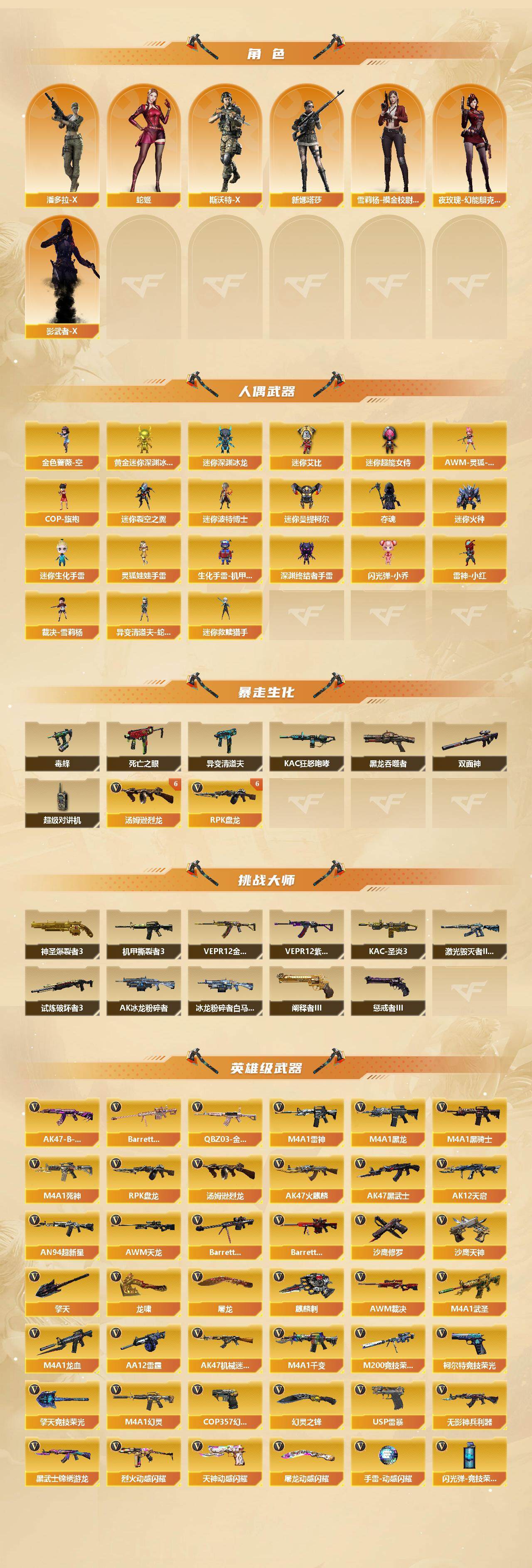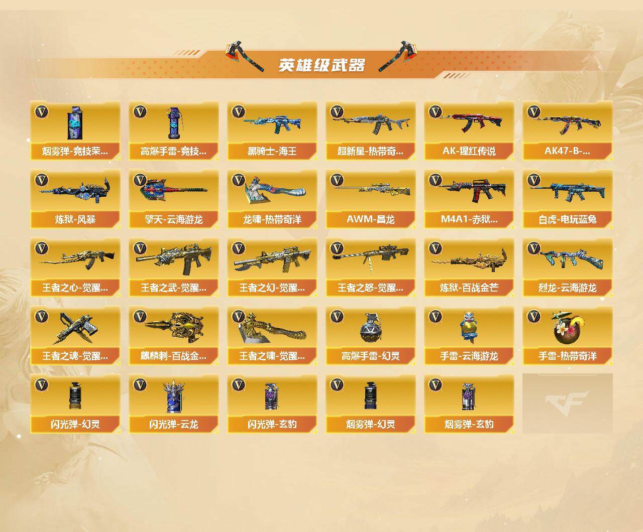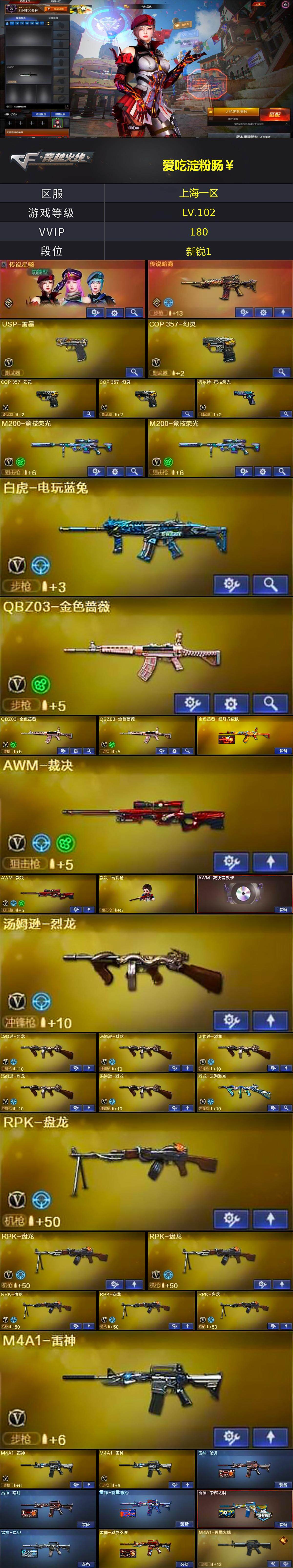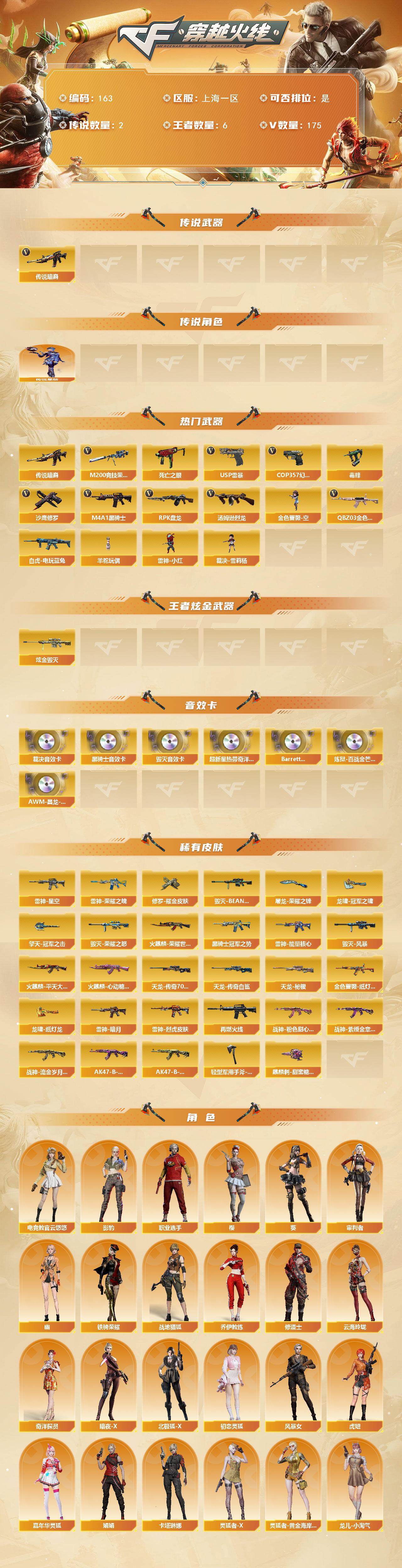 上海一区-175v-6王者-2炫金 【传说武器】:传说暗裔 【传说角色】:传说星骇 【热门武器】:传说暗裔,q03-金色蔷薇3,m200-竞技荣光2,死亡之眼,白虎-电玩蓝兔,毒蜂,m4a1-黑骑士4,汤姆逊-烈龙6,rpk-盘龙6,金色蔷薇-空,羊驼玩偶,雷神-小红,裁决-雪莉杨,usp-雷暴,cop 357-幻灵3,沙鹰-修罗8 【王者炫金武器】:炫金毁灭2 【音效卡】