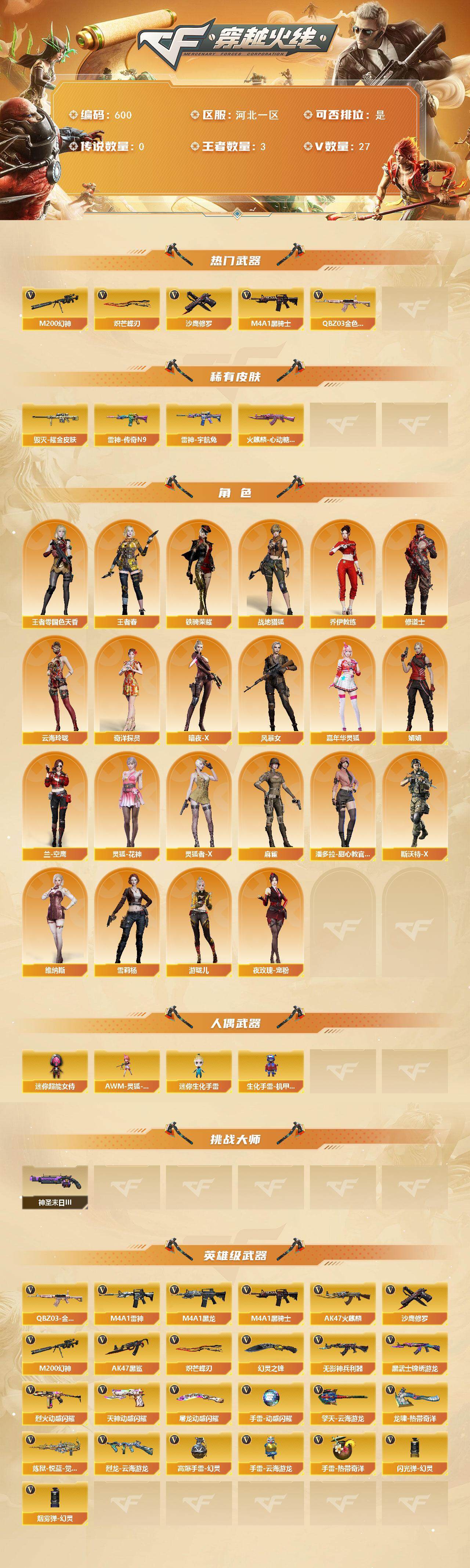 [14212659]河北一区-27v-3王者-0炫金 【热门武器】:q03-金色蔷薇,m200-幻神,m4a1-黑骑士,沙鹰-修罗,炽芒蝶刃 【皮肤】:雷神-传奇n9,雷神-宇航兔皮肤,火麒麟-心动糖果,毁灭耀金皮肤 【角色】:战地猎狐,王者-零-国色天香,王者春,奇洋探员,乔伊教练,修道士,云海玲珑,暗夜-x,风暴女2,嘉年华灵狐,娟娟,兰-空鹰,灵狐-花神,灵狐者-x,麻雀,潘多拉-甜心教官,斯沃特-x,铁骑荣耀,维纳斯,雪莉杨,夜玫瑰-宠粉,游珑儿 【人偶武器】:awm-灵狐-15周年嘉年华,迷你生化手蕾,生化手蕾-机甲核心,迷你超能女侍 【挑战大师】:神圣爆裂者-末日iii 【英雄级武器】:ak47-火麒麟,m4a1-黑龙,m4a1-雷神,m4a1-黑骑士,ak47-黑鲨,无影-神兵利器,黑武士-锦绣游龙,q03-金色蔷薇,烈火-动感闪耀,m200-幻神,炼狱-悦蓝-觉醒版,烈龙-云海游龙,沙鹰-修罗,天神-动感闪耀,幻灵之锋2,炽芒蝶刃,屠龙-动感闪耀,擎天-云海游龙,龙啸-热带奇洋,高爆手蕾-幻灵,手蕾-动感闪耀,手蕾-云海游龙,手蕾-热带奇洋,闪光丹-幻灵,盐雾蛋-幻灵 【道具】:bs战队炫彩背包,云海游龙炫彩背包,全能呛王背包,奇洋探员-海龟背包,女皇终结者-背包,超级背包,女皇终结者-魔龙之吻,救世主-黑桃战神,黄金生化钩,绿色巨人,灵魂忍者3,变异宝贝,迷雾幽灵3,生化弹匣,夺命之镰,防化服3,金色流光-呛王排位2,星辰流光-呛王排位,呛王排位28赛季金色流光,语音特效-生化,热带奇洋打击特效,热带奇洋表情,动感闪耀表情2,云海游龙表情,防弹头盔3,防弹衣3,c4工具钳3,手蕾包3 【特殊呛械】:1黑骑士