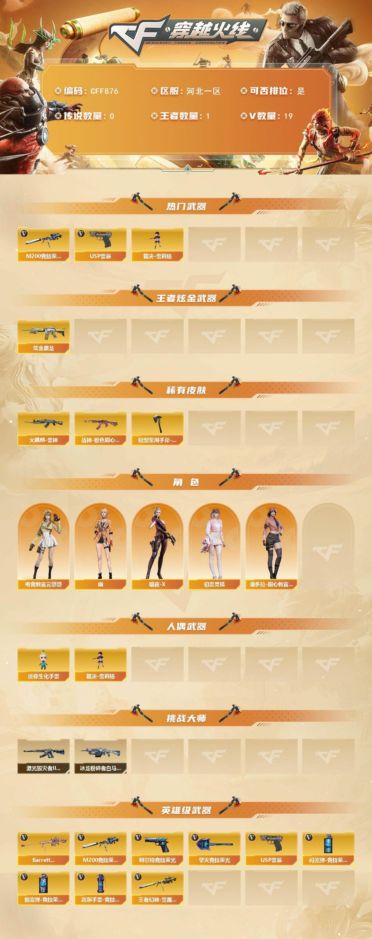【cff876】16v/78级/将帅/1王者/1炫金/3英雄/m200-竞技荣光/裁决-雪莉杨/usp-雷暴/炫金黑龙/火麒麟-雷神/战神-粉色甜心皮肤/轻型军用手斧-再燃火线/电竞教官-云悠悠/暗夜-x/初恋灵狐/潘多拉-甜心教官/幽/迷你生化手蕾/冰龙粉碎者-白马银呛/激光毁灭者iii-白马银呛/barrett-金色蔷薇/王者幻神-觉醒版/柯尔特-竞技荣光/擎天-竞技荣光/高爆手蕾-竞技荣
