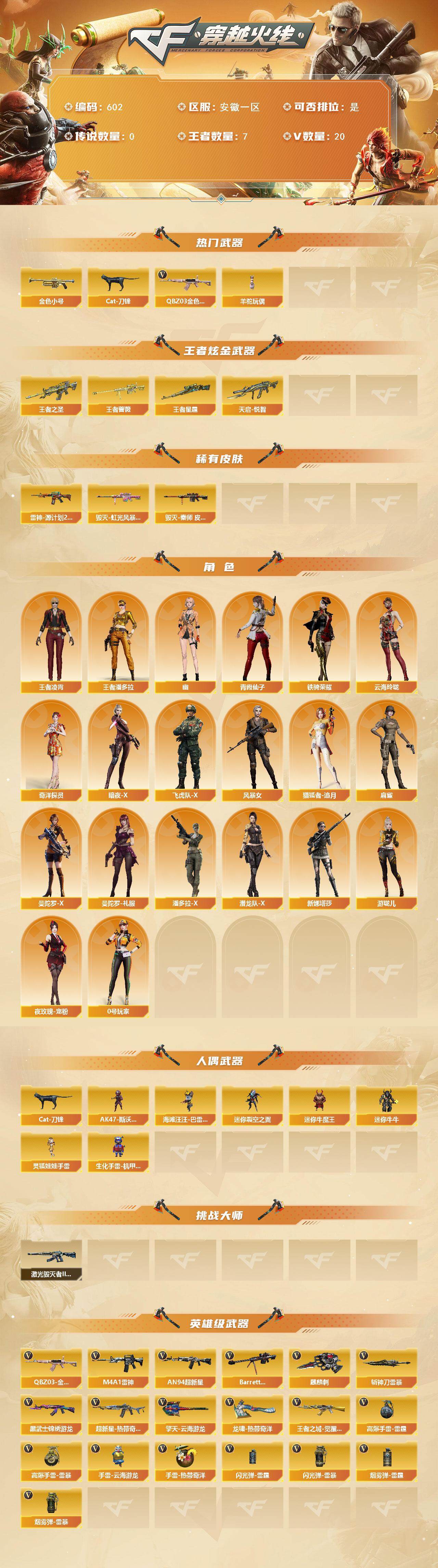 [14213258]安徽一区-20v-7王者-0炫金 【热门武器】:q03-金色蔷薇,金色小号,cat-刀锋,羊驼玩偶2 【王者炫金武器】:王者之圣,天启-悦智,王者蔷薇,王者星霆 【皮肤】:雷神-源计划2.0专属 皮肤,毁灭-虹光风暴 皮肤,毁灭-秦师 皮肤 【角色】:王者凌霄,王者潘多拉,奇洋探员,云海玲珑,暗夜-x,飞虎队-x,风暴女,猎狐者-追月,0号玩家,麻雀,曼陀罗-x,曼陀罗-礼服,潘多拉-x,潜龙队-x,青霞仙子,铁骑荣耀,新娜塔莎,夜玫瑰-宠粉,幽,游珑儿 【人偶武器】:海滩汪汪-芭蕾特,cat-刀锋,迷你裂空之翼,迷你牛魔王,迷你牛牛,生化手蕾-机甲核心,ak47-斯沃特,灵狐娃娃手蕾2 【挑战大师】:激光毁灭者iii-白马银呛 【英雄级武器】:m4a1-雷神2,an94-超新星,黑武士-锦绣游龙,超新星-热带奇洋,q03-金色蔷薇,王者之城-觉醒版,barrett-毁灭,麒麟刺,擎天-云海游龙,龙啸-热带奇洋,斩神刀-雷暴,高爆手蕾-雷霆,高爆手蕾-雷暴,手蕾-云海游龙,手蕾-热带奇洋,闪光丹-雷霆,闪光丹-雷暴2,盐雾蛋-雷霆,盐雾蛋-雷暴 【道具】:bs战队炫彩背包,cfs限定背包,云山科技背包,奇洋探员-海龟背包,热带奇洋炫彩背包,超级背包,女皇终结者-魔龙之吻,绿色巨人,灵魂忍者2,变异宝贝,迷雾幽灵2,生化弹匣,夺命之镰,防化服3,金色流光-呛王排位,星辰流光-呛王排位,呛王排位28赛季金色流光,呛王排位29赛季金色流光,热带奇洋表情,云海游龙表情,c4-沙漠,防弹头盔3,防弹衣3,c4工具钳3,手蕾包3 【特殊呛械】: