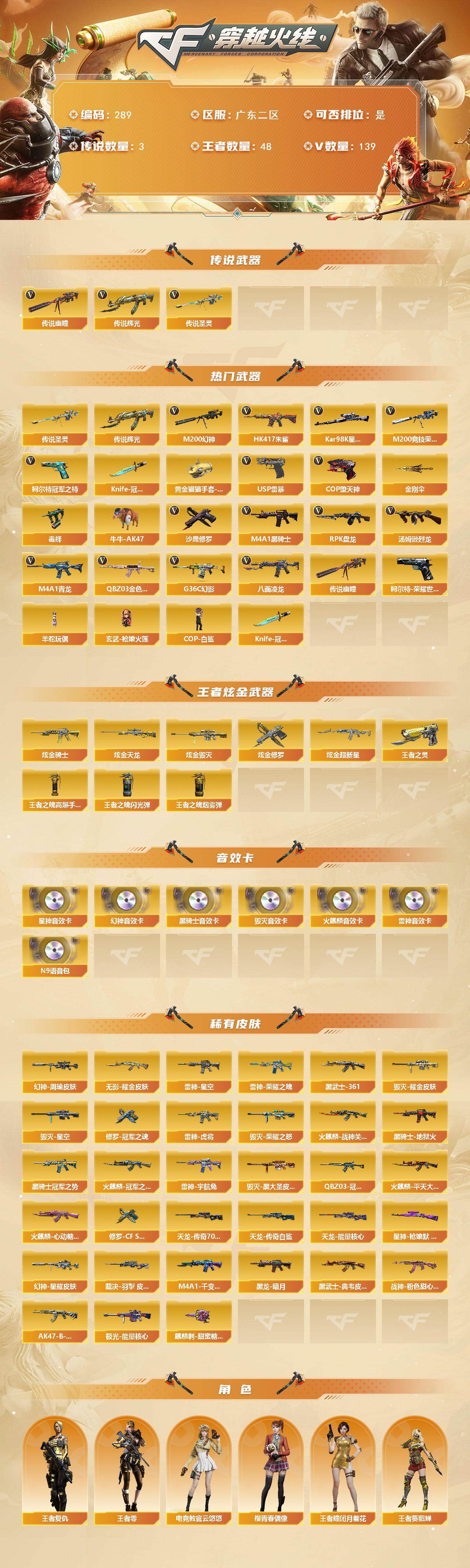 【289】xg11402广东二区-139v-48王者-10炫金 【传说武器】:传说辉光,传说圣灵,传说幽瞳 【热门武器】:传说圣灵,传说辉光,传说幽瞳,g36c-幻影,q03-金色蔷薇,hk417-朱雀,m4a1-青龙,m200-幻神,柯尔特-荣耀世冠白鲨2023,m200-竞技荣光,八面凌龙,柯尔特-冠军之特,kar98k-星神,毒蜂,牛牛-ak47,m4a1-黑骑士,汤姆逊-烈龙,rpk-盘龙,羊驼玩偶,玄武-呛娘火莲,cop-白鲨,usp-雷暴,cop-堕天神,沙鹰-修罗3,knife-冠军之刃2,黄金猫猫手套-白鲨,金刚伞 【王者炫金武器】:王者之灵5,炫金骑士,炫金超新星,炫金毁灭4,炫金天龙,炫金修罗3,王者之魄高爆手蕾4,王者之魄闪光丹5,王者之魄盐雾蛋2 【音效卡】:m200-幻神音效卡,ak47-火麒麟音效卡,m4a1-雷神音效卡,m4a1-黑骑士音效卡,barrett-毁灭音效卡,n9语音包,kar98k-星神音效卡 【皮肤】:幻神-周瑜皮肤,幻神-星耀 皮肤,q03-冠军之薇,裁决-羽掣 皮肤,星神-呛娘默 皮肤,雷神-荣耀之魄,雷神-星空,雷神-虎将,雷神-宇航兔皮肤,火麒麟-冠军之心,火麒麟-战神关羽2,火麒麟-平天大圣,火麒麟-心动糖果,毁灭-荣耀之怒,毁灭耀金皮肤,毁灭-星空,毁灭-黑大圣皮肤,m4a1-千变-孔明皮肤,黑龙-暗月,黑骑士-冠军之势,黑骑士-地狱火,无影耀金皮肤,ak47-黑武士-361,黑武士-典韦皮肤,战神-粉色甜心皮肤2,ak47-b-常胜将军-刘备,天龙-能量核心,awm-天龙-传奇70kg,awm-天龙-传奇白鲨,极光-能量核心,修罗-cf star,修罗-冠军之魂2,麒麟刺-甜蜜糖果 皮肤 【角色】:零,樱,瞳,魅影,凌霄,电竞教官-云悠悠,月兔特工,荒漠琉璃,关小雨,星际战将,王者-瞳-闭月羞花,王者-葵-貂蝉,王者-零,王者复仇,王者春,王者玲珑,王者-迷迭香,王者玲珑-小乔,堕落女神,雪域霜狐,炽天使,暗夜-x,北极狐-x,芳心审判者,风暴女,虎妞,嘉年华灵狐,疾风,兰-海滩派对,兰-新年限定,零-水下丽影,灵狐者-黄金海岸,灵狐者-七夕宝贝,灵狐者-职业经理,龙儿,曼陀罗-x,曼陀罗-礼服,潘多拉-x,潜龙队-x,青霞仙子,蛇姬,铁骑荣耀,兔囡囡,维纳斯,雪莉杨,雪莉杨-摸金校尉,夜玫瑰-幻能朋克,樱-青春偶像,樱-战斗天使,樱-缤纷夏日,幽,职业选手,智影 【人偶武器】:玄武-呛娘火莲,cop-白鲨,天龙-曼陀罗2,火麒麟-灵狐3,m4a1-雷神-精英刀锋,斯泰尔-呛娘暗刃,cop-旗袍,牛牛-ak47,迷你牛魔王,深渊终结者手蕾,闪光丹-小乔,闪光丹-貂蝉,高爆手蕾-大乔,迷你艾比 【暴走生化】:毒蜂,黑龙吞噬者,双面神,超级对讲机 【挑战大师】:冰龙粉碎者-白马银呛2,vepr-12-金魔,激光毁灭者iii,神圣爆裂者-末日iii,阐释者iii 【英雄级武器】:m4a1-千变,ak47-火麒麟2,m4a1-黑龙,m4a1-雷神,m4a1-黑骑士,ak47-无影,ak47-黑武士3,ak12-天启2,an94-超新星2,ak47-黑鲨2,m4a1-龙血,m4a1-青龙,hk417-朱雀,m4a1-夜魔,g36c-幻影,八面凌龙,q03-金色蔷薇,m4a1-猎神,王者之心-觉醒版,王者之魄-觉醒版,ak47-b-战神,王者之城-觉醒版,王者炎心-觉醒版,王者火魄-觉醒版,ak47-b-常胜将军,王者之烈-觉醒版,王者白虎-觉醒版,q-03-王者蔷薇-觉醒版,黑武士-cf网剧冠军,awm-天龙,barrett-毁灭4,barrett-极光,awm-裁决2,m200-幻神,kar98k-星神,m200-竞技荣光,王者之怒-觉醒版,rpk-盘龙,炼狱-悦蓝-觉醒版,汤姆逊-烈龙,沙鹰-修罗3,沙鹰-天神5,usp-雷暴,cop-堕天神,柯尔特-冠军之特,柯尔特-荣耀世冠白鲨2023,柯尔特-竞技荣光,破空呛刃-夜魔,王者之灵-觉醒版,天神-cf网剧冠军,屠龙6,龙啸3,马来剑-夜魔,擎天2,麒麟刺4,幻灵之锋3,擎天-竞技荣光,擎天-cf网剧冠军,王者之锋-觉醒版,王者之啸-觉醒版2,王者之击-觉醒版,王者之刺-觉醒版,高爆手蕾-夜魔7,高爆手蕾-幻灵3,高爆手蕾-竞技荣光6,闪光丹-夜魔7,闪光丹-幻灵4,闪光丹-竞技荣光5,闪光丹-雷霆王者-觉醒版2,盐雾蛋-夜魔7,盐雾蛋-幻灵3,盐雾蛋-竞技荣光5,盐雾蛋-雷霆王者-觉醒版 【道具】:cfs限定背包,ep战队炫彩背包,亚洲杯纪念炫彩背包,战舰背包,次元之矛-背包2,超级背包,雪域霜狐炫彩背包,黄金超能特工背包,救世主-黑桃战神,黄金生化钩,绿色巨人,灵魂忍者,迷雾幽灵,夺命之镰,防化服2,金色流光-呛王排位2,星辰流光-呛王排位,巅峰赛先锋-金色流光,流光-再燃火线,呛王排位28赛季金色流光,呛王排位29赛季金色流光,语音特效-怀旧,雪域霜狐表情,cfpl选手表情-第1套,ep战队名片,ep战队喷图,ep战队击杀图标,防弹头盔4,防弹衣4,c4工具钳3,手蕾包3 【特殊呛械】:1黑骑士,1烈龙,1盘龙