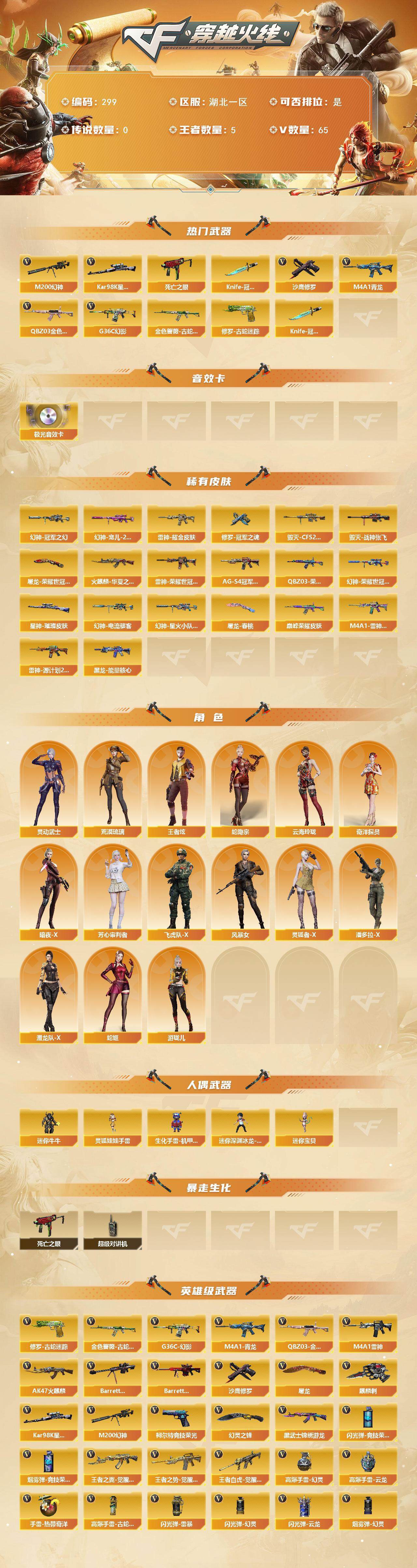 【299】xg17874湖北一区-65v-5王者-0炫金 【热门武器】:g36c-幻影,q03-金色蔷薇,m4a1-青龙,m200-幻神,金色蔷薇-古蛇迷踪,修罗-古蛇迷踪,死亡之眼,kar98k-星神,沙鹰-修罗5,knife-冠军之刃4 【音效卡】:barrett-极光音效卡 【皮肤】:幻神-冠军之幻,幻神-宠儿-2021mvp,m200-幻神-荣耀世冠白鲨,幻神-电流骇客 皮肤,幻神-星火小队签名臻藏版 皮肤,q03-荣耀世冠白鲨,q03-巅峰荣耀皮肤,星神-璀璨皮肤,雷神-耀金皮肤,雷神-荣耀世冠ag,m4a1-雷神-巅峰荣耀皮肤,雷神-源计划2.0专属 皮肤,火麒麟-华夏之心,毁灭-cfs2020,毁灭-战神张飞,黑龙-能量核心,黑骑士-ag-s4冠军典藏,修罗-冠军之魂,屠龙-荣耀世冠ag,屠龙-春桃 皮肤 【角色】:荒漠琉璃,王者炫,蛇隐宗,奇洋探员,云海玲珑,暗夜-x,芳心审判者,飞虎队-x,风暴女,灵动武士,灵狐者-x,潘多拉-x,潜龙队-x,蛇姬,游珑儿 【人偶武器】:迷你宝贝,迷你牛牛2,生化手蕾-机甲核心,迷你深渊冰龙-王绿豆,灵狐娃娃手蕾2 【暴走生化】:死亡之眼,超级对讲机 【英雄级武器】:ak47-火麒麟,m4a1-雷神,m4a1-青龙,g36c-幻影,黑武士-锦绣游龙,金色蔷薇-古蛇迷踪,q03-金色蔷薇,王者之翼-觉醒版,王者之势-觉醒版,王者白虎-觉醒版,barrett-毁灭,barrett-极光,m200-幻神,kar98k-星神,沙鹰-修罗5,柯尔特-无冕之王,柯尔特-竞技荣光,修罗-古蛇迷踪,屠龙4,麒麟刺,幻灵之锋2,高爆手蕾-幻灵7,高爆手蕾-云龙3,手蕾-热带奇洋,高爆手蕾-古蛇迷踪,闪光丹-雷暴,闪光丹-幻灵7,闪光丹-竞技荣光3,闪光丹-云龙4,闪光丹-雷霆王者-觉醒版,盐雾蛋-幻灵7,盐雾蛋-竞技荣光3,盐雾蛋-云龙4,盐雾蛋-古蛇迷踪 【道具】:cfs限定背包,ep战队炫彩背包,kz战队炫彩背包,亚洲杯纪念炫彩背包,冰冰企鹅背包,古蛇迷踪炫彩背包,奇洋探员-海龟背包,超级背包,救世主-黑桃战神,黄金生化钩,绿色巨人,灵魂忍者2,变异宝贝,迷雾幽灵2,夺命之镰,防化服2,金色流光-呛王排位,星辰流光-呛王排位,巅峰赛先锋-金色流光,呛王排位28赛季金色流光,呛王排位29赛季金色流光,古蛇迷踪打击特效,蛇隐宗表情,斯沃特表情,ep战队名片,ep战队喷图,ep战队击杀图标2,防弹头盔3,防弹衣3,c4工具钳3,手蕾包3 【特殊呛械】: