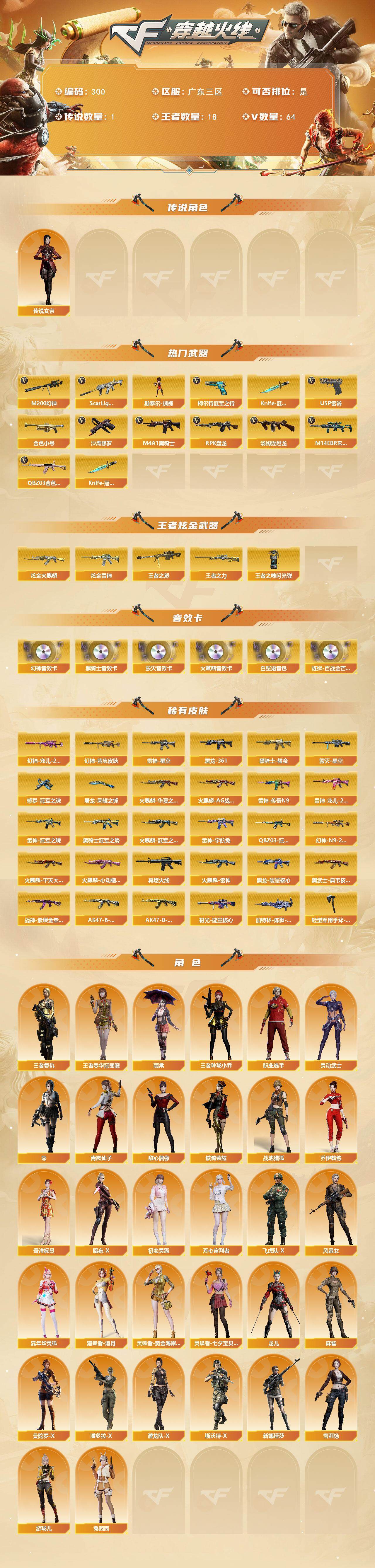 【300】xg47230广东三区-64v-18王者-2炫金 【传说角色】:传说女帝 【热门武器】:q03-金色蔷薇,m14ebr-玄武,scar light-白虎,m200-幻神,柯尔特-冠军之特,金色小号,m4a1-黑骑士,汤姆逊-烈龙3,rpk-盘龙2,斯泰尔-蝴蝶,usp-雷暴,沙鹰-修罗3,knife-冠军之刃2 【王者炫金武器】:王者之怒,王者之力,炫金火麒麟,炫金雷神,王者之魄闪光丹3 【音效卡】:m200-幻神音效卡,ak47-火麒麟音效卡,m4a1-黑骑士音效卡2,barrett-毁灭音效卡,白鲨语音包,炼狱-百战金芒-庆典舞曲音效卡 【皮肤】:m200-幻神-黄忠皮肤,幻神-宠儿-2021mvp3,m200-幻神-n9-2022mvp,q03-冠军之薇,雷神-星空,雷神-冠军之魄,雷神-传奇n9,雷神-宠儿-2019mvp,雷神-宇航兔皮肤,m4a1-再燃火线,火麒麟-ag战队皮肤,火麒麟-雷神,火麒麟-冠军之心,火麒麟-华夏之心,火麒麟-平天大圣,火麒麟-心动糖果,毁灭-星空,黑龙-能量核心2,m4a1-黑龙-361,黑骑士耀金皮肤,黑骑士-冠军之势,黑武士-典韦皮肤,战神-紫绶金章皮肤3,ak47-b-常胜将军-刘备2,ak47-b-常胜将军-孙权2,极光-能量核心2,加特林-炼狱-钟馗皮肤,修罗-冠军之魂,屠龙-荣耀之锋,轻型军用手斧-再燃火线 【角色】:零,雨棠,战地猎狐,王者零-华冠丽服,王者复仇,王者玲珑-小乔,奇洋探员,乔伊教练,暗夜-x,初恋灵狐,芳心审判者,飞虎队-x,风暴女2,嘉年华灵狐,猎狐者-追月,灵动武士,灵狐者-黄金海岸,灵狐者-七夕宝贝,龙儿,麻雀,曼陀罗-x,潘多拉-x,潜龙队-x,青霞仙子,斯沃特-x,甜心偶像,铁骑荣耀,兔囡囡,新娜塔莎,雪莉杨,游珑儿,职业选手 【人偶武器】:m4a1-雷神-精英刀锋,迷你宝贝,斯泰尔-蝴蝶,awm-灵狐-15周年嘉年华2,迷你深渊冰龙3,迷你裂空之翼,迷你牛魔王,迷你波特博士10,迷你曼提柯尔,夺魂,迷你火种,迷你生化手蕾,生化手蕾-机甲核心2,深渊终结者手蕾,闪光丹-小乔,闪光丹-貂蝉,高爆手蕾-大乔,迷你巨石泰坦-魔花研究所,灵狐娃娃手蕾 【挑战大师】:神圣爆裂者iii,激光毁灭者iii-白马银呛,vepr-12-金魔,激光毁灭者iii,机甲撕裂者iii,kac-圣炎切割者iii,神圣爆裂者-末日iii2,vepr-12-紫魔 【英雄级武器】:ak47-火麒麟2,m4a1-黑龙,m4a1-雷神2,m4a1-黑骑士,ak12-天启,scar light-白虎,m14ebr-玄武,超新星-热带奇洋,q03-金色蔷薇,烈火-动感闪耀,王者之心-觉醒版,王者之势-觉醒版,ak47-b-战神,ak47-b-常胜将军,barrett-毁灭2,barrett-极光,awm-裁决,m200-幻神,barrett-朱雀,王者之决-觉醒版,王者星神-觉醒版,rpk-盘龙2,炼狱-百战金芒,汤姆逊-烈龙3,aa-12-雷霆,沙鹰-修罗3,usp-雷暴,柯尔特-冠军之特,王者之灵-觉醒版,天神-动感闪耀,屠龙,龙啸2,麒麟刺,屠龙-动感闪耀,龙啸-热带奇洋,斩神刀-雷暴,麒麟刺-百战金芒,王者之啸-觉醒版2,王者之击-觉醒版2,高爆手蕾-雷暴4,手蕾-动感闪耀,高爆手蕾-云龙2,手蕾-热带奇洋,闪光丹-雷暴4,闪光丹-云龙,盐雾蛋-雷暴4 【道具】:ag战队炫彩背包,bs战队炫彩背包,xrock炫彩背包,云山科技背包,亚洲杯纪念炫彩背包,全能呛王背包,冰冰企鹅背包-猛男专用,奇洋探员-海龟背包,炫彩背包,热带奇洋炫彩背包,百战金芒炫彩背包,虎牙炫彩背包,超级背包2,圣拳猎手-炽雪,女皇终结者-魔龙之吻,救世主-黑桃战神,黄金生化钩,绿色巨人,灵魂忍者2,变异宝贝,迷雾幽灵,生化弹匣,夺命之镰,防化服3,金色流光-呛王排位2,星辰流光-呛王排位,巅峰赛先锋-金色流光,流光-再燃火线,呛王排位28赛季金色流光,呛王排位29赛季金色流光,语音特效-盛典烟火,萌萌小葵表情,热带奇洋表情2,动感闪耀表情,云海游龙表情,c4-红龙,防弹头盔8,防弹衣7,c4工具钳6,手蕾包5 【特殊呛械】:蝴蝶斯泰尔3烈龙,1白虎,1黑骑士,3烈龙,2盘龙,1蝴蝶斯泰尔
