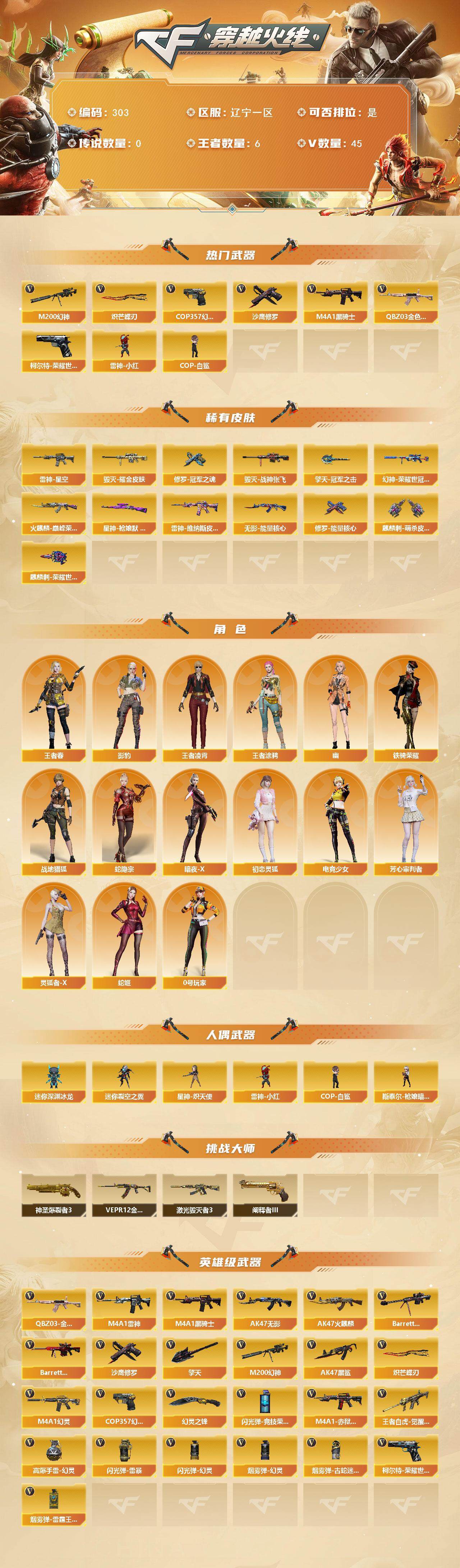 【303】xg25830辽宁一区-45v-6王者-0炫金 【热门武器】:q03-金色蔷薇,m200-幻神,柯尔特-荣耀世冠白鲨2023,m4a1-黑骑士,雷神-小红,cop-白鲨2,cop 357-幻灵2,沙鹰-修罗,炽芒蝶刃 【皮肤】:m200-幻神-荣耀世冠白鲨,星神-呛娘默 皮肤,雷神-星空,雷神-维纳斯皮肤,火麒麟-巅峰荣耀,毁灭耀金皮肤,毁灭-战神张飞,无影-能量核心,修罗-能量核心,修罗-冠军之魂,擎天-冠军之击,麒麟刺-萌杀皮肤,麒麟刺-荣耀世冠白鲨 【角色】:影豹,战地猎狐,王者春,王者凌霄,王者涂鸦,蛇隐宗,暗夜-x,初恋灵狐,电竞少女,芳心审判者,0号玩家,灵狐者-x,蛇姬,铁骑荣耀,幽 【人偶武器】:雷神-小红,cop-白鲨2,星神-炽天使,斯泰尔-呛娘暗刃,迷你深渊冰龙,迷你裂空之翼4 【挑战大师】:神圣爆裂者iii,vepr-12-金魔,激光毁灭者iii,阐释者iii 【英雄级武器】:ak47-火麒麟,m4a1-雷神,m4a1-黑骑士,ak47-无影,ak47-黑鲨,m4a1-幻灵,q03-金色蔷薇,王者白虎-觉醒版,barrett-毁灭2,barrett-极光,m200-幻神,沙鹰-修罗,cop 357-幻灵2,柯尔特-荣耀世冠白鲨2023,擎天,幻灵之锋,炽芒蝶刃,高爆手蕾-幻灵7,闪光丹-雷暴,闪光丹-幻灵7,闪光丹-竞技荣光,盐雾蛋-幻灵7,盐雾蛋-古蛇迷踪,盐雾蛋-雷霆王者-觉醒版,m4a1-赤狱骑士 【道具】:ag战队炫彩背包,cfs限定背包,亚洲杯纪念炫彩背包,超级背包,救世主-黑桃战神,绿色巨人,灵魂忍者,迷雾幽灵,夺命之镰,防化服2,金色流光-呛王排位,星辰流光-呛王排位,呛王排位28赛季金色流光,呛王排位29赛季金色流光,ep战队名片,ep战队喷图,防弹头盔2,防弹衣2,c4工具钳2,手蕾包2 【特殊呛械】:1黑骑士