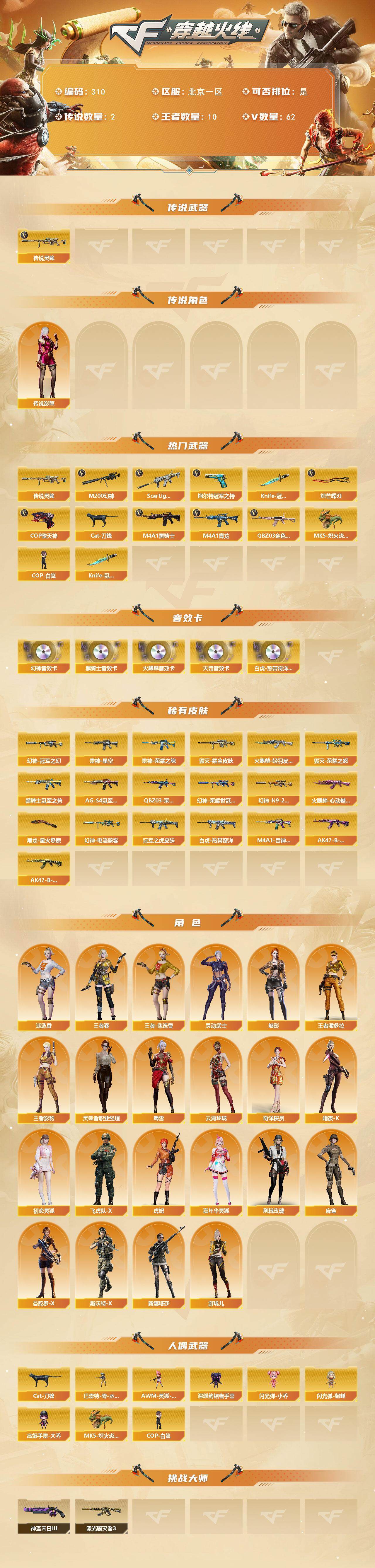 【310】xg29284北京一区-62v-10王者-0炫金 【传说武器】:传说灵眸 【传说角色】:传说影煞 【热门武器】:传说灵眸,q03-金色蔷薇,scar light-白虎,m4a1-青龙,m200-幻神,柯尔特-冠军之特,cat-刀锋,m4a1-黑骑士,mk5-炽火炎龙,cop-白鲨,cop-堕天神,knife-冠军之刃4,炽芒蝶刃 【音效卡】:scar light-白虎-热带奇洋音效卡,m200-幻神音效卡,ak47-火麒麟音效卡,m4a1-黑骑士音效卡,q03-天罚音效卡 【皮肤】:幻神-冠军之幻,m200-幻神-荣耀世冠白鲨,m200-幻神-n9-2022mvp,幻神-电流骇客 皮肤,scarlight-白虎-冠军之虎皮肤,白虎-热带奇洋 皮肤,q03-荣耀世冠白鲨,雷神-荣耀之魄,雷神-星空,m4a1-雷神-巅峰荣耀皮肤,火麒麟-轻羽皮肤,火麒麟-心动糖果,毁灭-荣耀之怒,毁灭耀金皮肤,黑骑士-冠军之势,黑骑士-ag-s4冠军典藏,ak47-b-常胜将军-曹操,ak47-b-常胜将军-孙权,屠龙-星火燎原 【角色】:魅影,迷迭香,王者春,王者影豹,王者-迷迭香,王者潘多拉,奇洋探员,云海玲珑,暗夜-x,初恋灵狐,飞虎队-x,虎妞,嘉年华灵狐,荆棘玫瑰,灵动武士,灵狐者-职业经理,麻雀,曼陀罗-x,斯沃特-x,蜀雪,新娜塔莎,游珑儿 【人偶武器】:cop-白鲨,mk5-炽火炎龙,芭蕾特-零-水下丽影,awm-灵狐-15周年嘉年华,cat-刀锋,深渊终结者手蕾,闪光丹-小乔,闪光丹-貂蝉,高爆手蕾-大乔 【挑战大师】:激光毁灭者iii,神圣爆裂者-末日iii 【英雄级武器】:ak47-火麒麟,m4a1-雷神,m4a1-黑骑士,m4a1-青龙,scar light-白虎,q03-天罚,无影-神兵利器,黑武士-锦绣游龙,超新星-热带奇洋,q03-金色蔷薇,m4a1-猎神,超新星-悦享-觉醒版,ak47-b-常胜将军,q-03-王者蔷薇-觉醒版,barrett-毁灭,m200-幻神,barrett-朱雀,王者之力-觉醒版,烈龙-云海游龙,aa-12-雷霆,沙鹰-天神3,cop-堕天神,柯尔特-冠军之特,王者之灵-觉醒版,屠龙,麒麟刺-堕天神,擎天,麒麟刺,幻灵之锋,炽芒蝶刃,擎天-云海游龙,龙啸-热带奇洋,龙啸-堕天神,王者之锋-觉醒版,高爆手蕾-堕天神4,高爆手蕾-幻灵4,高爆手蕾-云龙3,手蕾-云海游龙,手蕾-热带奇洋,闪光丹-堕天神4,闪光丹-幻灵2,闪光丹-云龙,盐雾蛋-堕天神4,盐雾蛋-幻灵2,盐雾蛋-云龙3 【道具】:ep战队炫彩背包,云海游龙炫彩背包,奇洋探员-海龟背包,热带奇洋炫彩背包,超级背包,绿色巨人,生化弹匣,夺命之镰,防化服2,金色流光-呛王排位2,星辰流光-呛王排位,呛王排位28赛季金色流光,热带奇洋表情,云海游龙表情,ep战队收纳包,ep战队击杀图标,c4-红龙,防弹头盔2,防弹衣2,c4工具钳2,手蕾包2 【特殊呛械】:1白虎,1黑骑士