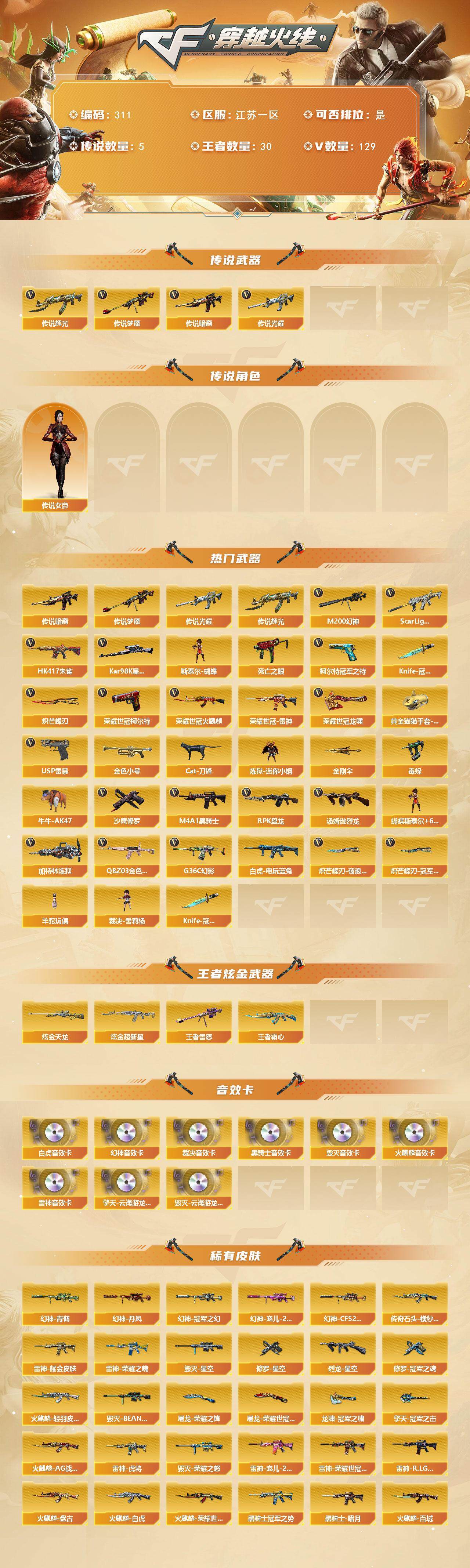 【311】xg28684江苏一区-129v-30王者-2炫金 【传说武器】:传说光耀,传说暗裔,传说辉光,传说梦魇 【传说角色】:传说女帝 【热门武器】:传说光耀,传说暗裔,传说梦魇,传说辉光,g36c-幻影,q03-金色蔷薇,scar light-白虎,hk417-朱雀,m200-幻神,死亡之眼,荣耀世冠-火麒麟,荣耀世冠-雷神,白虎-电玩蓝兔,柯尔特-冠军之特,荣耀世冠-柯尔特2,kar98k-星神3,金色小号,cat-刀锋,炼狱-迷你小钢,毒蜂,牛牛-ak47,m4a1-黑骑士5,汤姆逊-烈龙6,rpk-盘龙6,加特林-炼狱,斯泰尔-蝴蝶,羊驼玩偶,裁决-雪莉杨,usp-雷暴2,沙鹰-修罗2,knife-冠军之刃2,炽芒蝶刃,炽芒蝶刃-破浪逐光 皮肤,炽芒蝶刃-冠军炽芒皮肤,荣耀世冠-龙啸2,黄金猫猫手套-白鲨,金刚伞 【王者炫金武器】:王者霜心,王者雷怒,炫金超新星,炫金天龙 【音效卡】:擎天-云海游龙音效卡,m200-幻神音效卡,ak47-火麒麟音效卡,m4a1-雷神音效卡,m4a1-黑骑士音效卡,barrett-毁灭音效卡,barrett-毁灭-云海游龙音效卡,awm-裁决音效卡,scar light-白虎音效卡 【皮肤】:幻神-冠军之幻,幻神-丹凤,幻神-青鹤,幻神-宠儿-2021mvp,幻神-巅峰荣耀,幻神-cfs2022,scarlight-白虎-冠军之虎皮肤,q03-金色蔷薇-斗鱼皮肤,金色蔷薇-破浪逐光 皮肤,awm-裁决-凤灵皮肤,裁决-巅峰荣耀 皮肤,kar98k-星神-冠军之星皮肤,星神-巅峰荣耀 皮肤,烈龙-星空,雷神-暗月,雷神-荣耀之魄,雷神-虎将,雷神-耀金皮肤,雷神-宠儿-2019mvp,雷神-r.lgd-cfpls18冠军,雷神-荣耀世冠ag,雷神-宇航兔皮肤,雷神-维纳斯皮肤2,火麒麟-ag战队皮肤,火麒麟-雷神,火麒麟-轻羽皮肤2,传奇石头-横秒之巅,火麒麟-平天大圣,火麒麟-盘古,火麒麟-白虎,火麒麟-荣耀世冠ag,火麒麟-百城,火麒麟-巅峰荣耀,火麒麟-心动糖果,毁灭-荣耀之怒,毁灭-星空,毁灭-bean-2020mvp,毁灭-百城浙江 皮肤,毁灭-虹光风暴 皮肤,毁灭-秦师 皮肤,m4a1-千变-孔明皮肤,黑龙-能量核心,黑骑士-暗月,黑骑士-冠军之势,黑骑士-ag-s4冠军典藏,黑骑士-破浪10年皮肤,无影-能量核心,死神-秘银,幻影-破浪逐光 皮肤,战神-粉色甜心皮肤2,战神-紫绶金章皮肤,战神-流金岁月皮肤,ak47-b-常胜将军-曹操,ak47-b-常胜将军-刘备3,ak47-b-常胜将军-孙权2,天龙-秘银,awm-天龙-传奇70kg,awm-天龙-传奇白鲨,炼狱-月 皮肤,修罗-能量核心,修罗-星空,修罗-冠军之魂,屠龙-荣耀之锋4,屠龙-荣耀世冠ag,屠龙-春桃 皮肤,屠龙-破浪逐光 皮肤,龙啸-冠军之啸,擎天-秘银,擎天-冠军之击,麒麟刺-萌杀皮肤,麒麟刺-月皮肤,炽芒蝶刃-冠军炽芒皮肤,炽芒蝶刃-破浪逐光 皮肤 【角色】:零,炫,雨棠,电竞教官-云悠悠,战地猎狐,王者-葵-貂蝉,王者葵-惊若翩鸿,王者春,王者涂鸦,王者-魅影,奇洋探员,乔伊教练,修道士,云海玲珑,暗夜-x,北极狐-x,芳心审判者,飞虎队-x,风暴女,虎妞,嘉年华灵狐,娟娟,卡塔琳娜,兰-新年限定,灵狐者-x,灵狐者-七夕宝贝,流浪蔷薇,龙儿-小淘气,麻雀,曼陀罗-x,潘多拉-x,青霞仙子,蛇姬,斯沃特-x,蜀雪,铁骑荣耀,兔囡囡,维纳斯,雪莉杨-摸金校尉,夜玫瑰-宠粉,影武者-x,幽,游珑儿,雅典娜 【人偶武器】:裁决-雪莉杨,天龙-曼陀罗,m4a1-雷神-精英刀锋,炼狱-迷你小钢,迷你宝贝,斯泰尔-蝴蝶,awm-灵狐-15周年嘉年华2,海滩汪汪-芭蕾特,cop-旗袍,cat-刀锋,牛牛-ak47,迷你深渊冰龙,迷你裂空之翼,迷你牛魔王,迷你波特博士,夺魂,迷你牛牛,迷你生化手蕾,生化手蕾-机甲核心3,深渊终结者手蕾2,闪光丹-小乔,闪光丹-貂蝉,高爆手蕾-大乔,迷你超能女侍,迷你巨石泰坦-魔花研究所 【暴走生化】:毒蜂,异变清道夫,kac-狂怒咆哮,双面神,死亡之眼,超级对讲机 【挑战大师】:神圣爆裂者iii,冰龙粉碎者-白马银呛2,激光毁灭者iii-白马银呛,激光毁灭者iii,神圣爆裂者-末日iii,阐释者iii 【英雄级武器】:ak47-火麒麟2,m4a1-雷神,m4a1-黑骑士5,m4a1-死神,an94-超新星,m4a1-武圣,ak47-黑鲨,hk417-朱雀,scar light-白虎,m4a1-幻灵,无影-神兵利器,g36c-幻影,黑武士-锦绣游龙,超新星-热带奇洋,q03-金色蔷薇,烈火-动感闪耀,王者之心-觉醒版,王者之势-觉醒版,王者之幻-觉醒版,ak-47-猩红传说3,王者之鲨-觉醒版,王者冰魄-觉醒版,黑骑士-海王2,ak47-b-常胜将军,m4a1-雷霆王者-觉醒版,王者龙血-觉醒版,白虎-电玩蓝兔,荣耀世冠-火麒麟,荣耀世冠-雷神,awm-天龙,barrett-毁灭,barrett-极光,awm-裁决2,m200-幻神,kar98k-星神3,王者之光-觉醒版,barrett-雷霆王者-觉醒版,王者风神-觉醒版,rpk-盘龙6,加特林-炼狱,悦蓝-惊涛骇浪-觉醒版,汤姆逊-烈龙6,烈龙-云海游龙,沙鹰-修罗2,沙鹰-天神3,usp-雷暴2,cop 357-雷霆王者-觉醒版2,柯尔特-冠军之特,柯尔特-电竞装甲,荣耀世冠-柯尔特2,glock18-武圣,天神-动感闪耀,屠龙5,龙啸,麒麟刺-堕天神,擎天,麒麟刺3,擎天-竞技荣光,炽芒蝶刃,屠龙-动感闪耀,擎天-云海游龙,龙啸-热带奇洋,荣耀世冠-龙啸2,龙啸-堕天神,斩神刀-雷暴,王者之锋-觉醒版2,雷霆王者之锋-觉醒版,高爆手蕾-雷暴3,高爆手蕾-堕天神2,高爆手蕾-幻灵,高爆手蕾-竞技荣光4,手蕾-动感闪耀,高爆手蕾-云龙2,手蕾-云海游龙,手蕾-热带奇洋,闪光丹-雷暴3,闪光丹-堕天神2,闪光丹-竞技荣光4,闪光丹-云龙,闪光丹-雷霆王者-觉醒版,盐雾蛋-雷暴3,盐雾蛋-堕天神2,盐雾蛋-竞技荣光2,盐雾蛋-雷霆王者-觉醒版2,m4a1-赤狱骑士 【道具】:cfs限定背包,ep战队炫彩背包,xrock炫彩背包,云海游龙炫彩背包,全能呛王背包,奇洋探员-海龟背包,战舰背包,炫彩背包,热带奇洋炫彩背包,背包-洛丽塔,虎牙炫彩背包,超级背包,迷你冰龙背包,哔哩哔哩名片,女皇终结者-魔龙