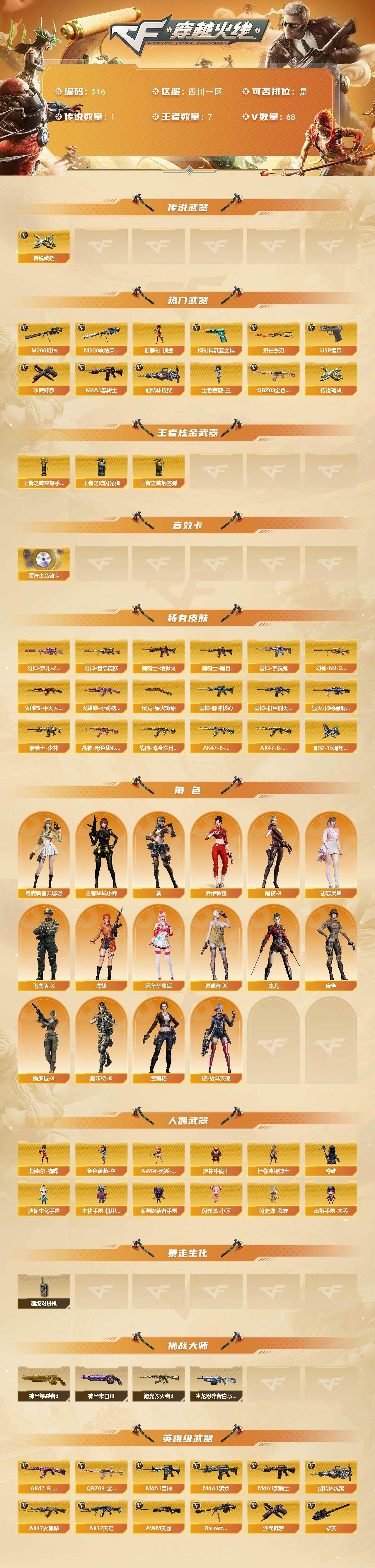 【316】xg31029四川一区-68v-7王者-0炫金 【传说武器】:传说破晓 【热门武器】:传说破晓,q03-金色蔷薇,m200-幻神,m200-竞技荣光,柯尔特-冠军之特,m4a1-黑骑士,加特林-炼狱,金色蔷薇-空,斯泰尔-蝴蝶2,usp-雷暴2,沙鹰-修罗,炽芒蝶刃 【王者炫金武器】:王者之魄高爆手蕾,王者之魄闪光丹2,王者之魄盐雾蛋 【音效卡】:m4a1-黑骑士音效卡 【皮肤】:m200-幻神-黄忠皮肤,幻神-宠儿-2021mvp,m200-幻神-n9-2022mvp,雷神-机甲刑天皮肤,雷神-脉冲核心,雷神-宇航兔皮肤,火麒麟-平天大圣,火麒麟-心动糖果,毁灭-神秘黑洞皮肤,黑骑士-暗月,黑骑士-地狱火,黑骑士-少林,战神-粉色甜心皮肤,战神-流金岁月皮肤,ak47-b-常胜将军-刘备2,ak47-b-常胜将军-孙权,修罗-15周年嘉年华 皮肤,屠龙-星火燎原 【角色】:葵,电竞教官-云悠悠,王者玲珑-小乔,乔伊教练,暗夜-x,初恋灵狐,飞虎队-x,虎妞,嘉年华灵狐,灵狐者-x,龙儿,麻雀,潘多拉-x,斯沃特-x,雪莉杨,樱-战斗天使 【人偶武器】:金色蔷薇-空,斯泰尔-蝴蝶2,awm-灵狐-15周年嘉年华,迷你牛魔王,迷你波特博士,夺魂2,迷你生化手蕾,生化手蕾-机甲核心,深渊终结者手蕾,闪光丹-小乔,闪光丹-貂蝉,高爆手蕾-大乔 【暴走生化】:超级对讲机 【挑战大师】:神圣爆裂者iii,冰龙粉碎者-白马银呛,激光毁灭者iii2,神圣爆裂者-末日iii2 【英雄级武器】:ak47-火麒麟,m4a1-黑龙,m4a1-雷神,m4a1-黑骑士,ak12-天启,无影-神兵利器,黑武士-锦绣游龙,q03-金色蔷薇,烈火-动感闪耀,王者炎心-觉醒版,黑骑士-海王,ak47-b-常胜将军,awm-天龙,barrett-毁灭,awm-裁决,m200-幻神,m200-竞技荣光,加特林-炼狱,沙鹰-修罗,usp-雷暴2,柯尔特-冠军之特,天神-动感闪耀,屠龙,擎天,擎天-竞技荣光,炽芒蝶刃,屠龙-动感闪耀,斩神刀-雷暴,王者之锋-觉醒版,高爆手蕾-雷暴4,高爆手蕾-竞技荣光6,手蕾-动感闪耀,高爆手蕾-云龙,闪光丹-雷暴4,闪光丹-竞技荣光7,闪光丹-云龙,盐雾蛋-雷暴4,盐雾蛋-竞技荣光6 【道具】:全能呛王背包,炫彩背包,超级背包,变异宝贝,生化弹匣,夺命之镰,防化服,金色流光-呛王排位2,星辰流光-呛王排位,呛王排位28赛季金色流光,电玩兔兔表情,动感闪耀表情,防弹头盔5,防弹衣3,c4工具钳4,手蕾包 【特殊呛械】:蝴蝶斯泰尔0烈龙,1黑骑士,1炼狱,2蝴蝶斯泰尔