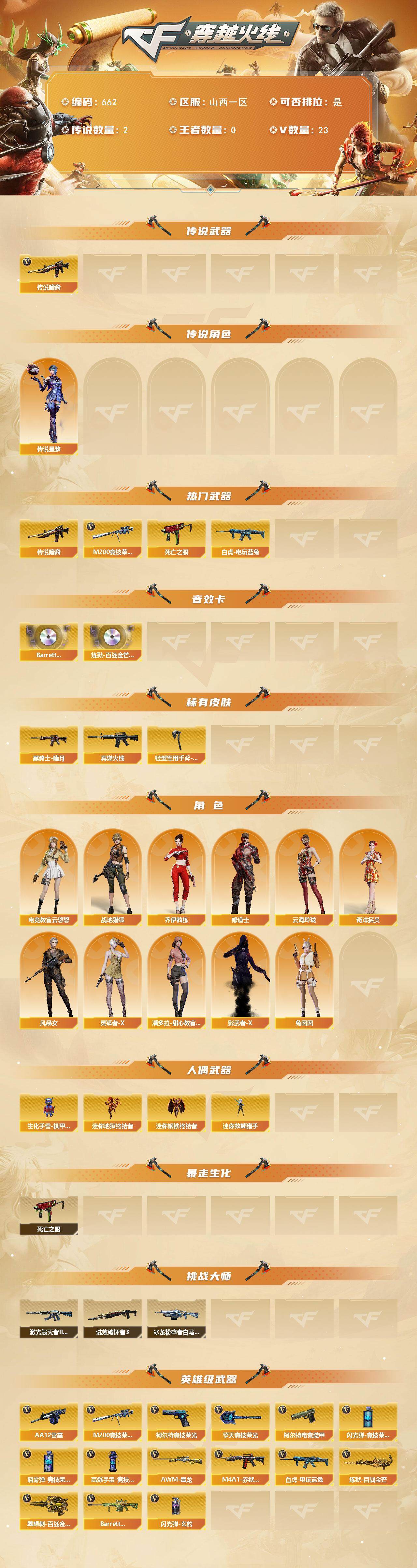 [14221029]山西一区-23v-0王者-0炫金 【传说武器】:传说暗裔 【传说角色】:传说星骇 【热门武器】:传说暗裔,m200-竞技荣光,死亡之眼,白虎-电玩蓝兔 【音效卡】:barrett-碧霄极光音效卡,炼狱-百战金芒-庆典舞曲音效卡 【皮肤】:m4a1-再燃火线,黑骑士-暗月,轻型军用手斧-再燃火线 【角色】:电竞教官-云悠悠,战地猎狐,奇洋探员,乔伊教练,修道士,云海玲珑,风暴女,灵狐者-x,潘多拉-甜心教官,兔囡囡,影武者-x 【人偶武器】:迷你钢铁终结者,迷你救赎猎手,迷你地狱终结者,生化手蕾-机甲核心 【暴走生化】:死亡之眼 【挑战大师】:冰龙粉碎者-白马银呛,激光毁灭者iii-白马银呛,试炼破坏者iii 【英雄级武器】:白虎-电玩蓝兔,m200-竞技荣光,炼狱-百战金芒,aa-12-雷霆,柯尔特-电竞装甲,柯尔特-竞技荣光,擎天-竞技荣光,麒麟刺-百战金芒,高爆手蕾-竞技荣光2,闪光丹-竞技荣光3,闪光丹-玄豹,盐雾蛋-竞技荣光3,m4a1-赤狱骑士,awm-昌龙,barrett-碧霄极光 【道具】:bs战队炫彩背包,云山科技背包,亚洲杯纪念炫彩背包,女皇终结者-背包,百战金芒炫彩背包,背包-洛丽塔,女皇终结者-魔龙之吻,救世主-黑桃战神,黄金生化钩,绿色巨人,灵魂忍者2,变异宝贝,妖姬,迷雾幽灵3,夺命之镰,防化服3,流光-再燃火线,呛王排位29赛季金色流光,语音特效-盛典烟火,萌萌小葵表情,防弹头盔4,防弹衣4,c4工具钳4,手蕾包4 【特殊呛械】: