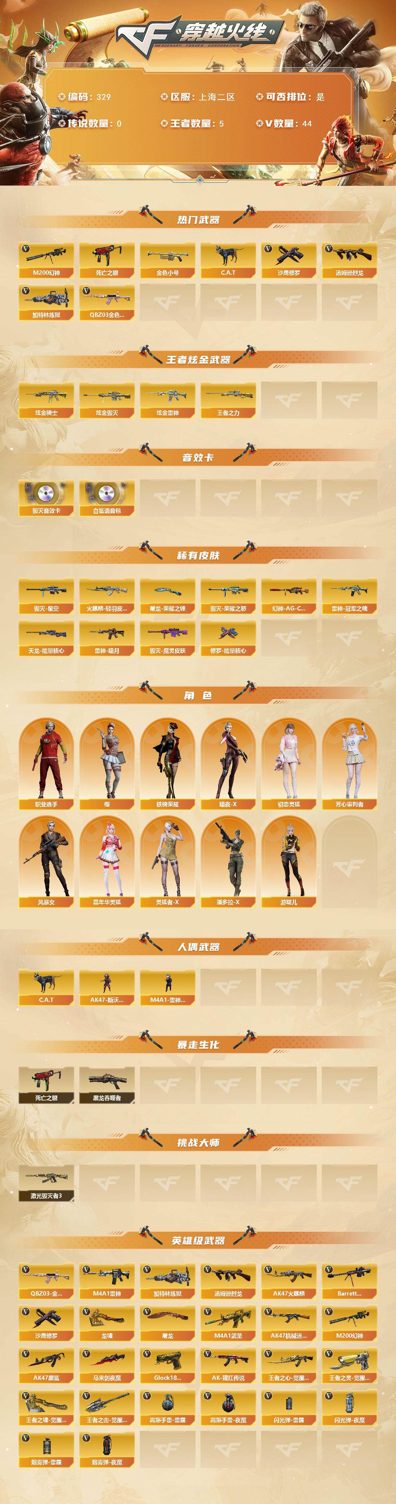 【329】xg23902上海二区-44v-5王者-3炫金 【热门武器】:q03-金色蔷薇,m200-幻神,死亡之眼,金色小号,c.a.t,汤姆逊-烈龙2,加特林-炼狱,沙鹰-修罗5 【王者炫金武器】:王者之力,炫金骑士,炫金雷神,炫金毁灭 【音效卡】:barrett-毁灭音效卡,白鲨语音包 【皮肤】:幻神-ag-cfpls17冠军,雷神-暗月,雷神-冠军之魄,火麒麟-轻羽皮肤,毁灭-荣耀之怒2,毁灭-星空,毁灭-魔灵皮肤,天龙-能量核心,修罗-能量核心,屠龙-荣耀之锋 【角色】:樱,暗夜-x,初恋灵狐,芳心审判者,风暴女,嘉年华灵狐,灵狐者-x,潘多拉-x,铁骑荣耀,游珑儿,职业选手 【人偶武器】:m4a1-雷神-精英刀锋,c.a.t,ak47-斯沃特 【暴走生化】:黑龙吞噬者,死亡之眼 【挑战大师】:激光毁灭者iii 【英雄级武器】:ak47-火麒麟,m4a1-雷神,m4a1-武圣2,ak47-机械迷城,ak47-黑鲨,q03-金色蔷薇,王者之心-觉醒版,ak-47-猩红传说,barrett-毁灭,m200-幻神,加特林-炼狱,汤姆逊-烈龙2,沙鹰-修罗5,王者之灵-觉醒版,glock18-武圣,屠龙2,龙啸,马来剑-夜魔,王者之啸-觉醒版,王者之击-觉醒版,高爆手蕾-雷霆2,高爆手蕾-夜魔3,闪光丹-雷霆2,闪光丹-夜魔3,盐雾蛋-雷霆2,盐雾蛋-夜魔3 【道具】:cfs限定背包,冰冰企鹅背包-猛男专用,炫彩背包,超级背包,夺命之镰,防化服,金色流光-呛王排位2,星辰流光-呛王排位,呛王排位28赛季金色流光,ep战队名片,ep战队喷图,c4-红龙,防弹头盔2,防弹衣3,c4工具钳3,手蕾包2 【特殊呛械】:2烈龙,1炼狱