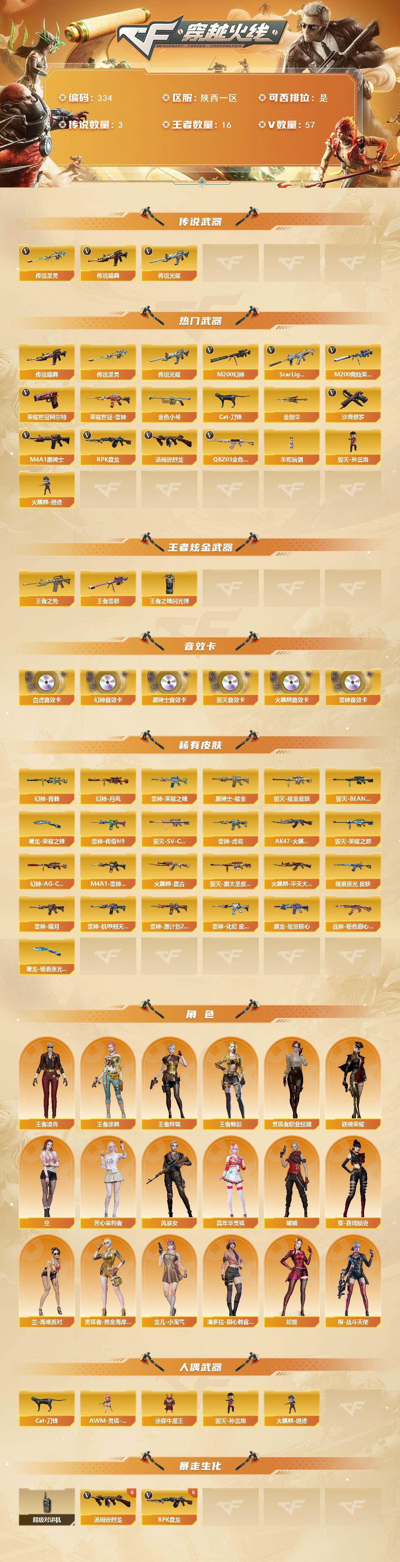 【334】xg34128陕西一区-57v-16王者-0炫金 【传说武器】:传说光耀,传说暗裔,传说圣灵 【热门武器】:传说光耀,传说暗裔,传说圣灵,q03-金色蔷薇,scar light-白虎,m200-幻神,m200-竞技荣光,荣耀世冠-雷神,荣耀世冠-柯尔特,金色小号,cat-刀锋,m4a1-黑骑士2,汤姆逊-烈龙6,rpk-盘龙6,羊驼玩偶,毁灭-孙三炮,火麒麟-绝迹,沙鹰-修罗2,金刚伞 【王者炫金武器】:王者之势,王者雷怒,王者之魄闪光丹 【音效卡】:m200-幻神音效卡,ak47-火麒麟音效卡,m4a1-雷神音效卡,m4a1-黑骑士音效卡,barrett-毁灭音效卡,scar light-白虎音效卡 【皮肤】:幻神-ag-cfpls17冠军,幻神-丹凤,幻神-青鹤,金色蔷薇-破浪逐光 皮肤,雷神-暗月,雷神-荣耀之魄,m4a1-雷神-cfs 2019,雷神-虎将,雷神-传奇n9,雷神-机甲刑天皮肤,雷神-源计划2.0专属 皮肤,雷神-化蛇 皮肤,ak47-火麒麟-传奇even,火麒麟-平天大圣,火麒麟-盘古,毁灭-荣耀之怒,毁灭耀金皮肤,毁灭-sv-cfpls16冠军,毁灭-bean-2020mvp,毁灭-黑大圣皮肤,黑龙-能量核心,黑骑士耀金皮肤,战神-粉色甜心皮肤,屠龙-荣耀之锋,屠龙-破浪逐光 皮肤 【角色】:王者凌霄,王者涂鸦,王者玲珑,王者-魅影,空,芳心审判者,风暴女,嘉年华灵狐,娟娟,葵-赛博朋克,兰-海滩派对,灵狐者-黄金海岸,灵狐者-职业经理,龙儿-小淘气,潘多拉-甜心教官,蛇姬,铁骑荣耀,樱-战斗天使 【人偶武器】:火麒麟-绝迹,毁灭-孙三炮,awm-灵狐-15周年嘉年华,cat-刀锋,迷你牛魔王 【暴走生化】:超级对讲机 【挑战大师】:冰龙粉碎者-白马银呛,激光毁灭者iii-白马银呛,试炼破坏者iii,神圣爆裂者-末日iii,阐释者iii 【英雄级武器】:ak47-火麒麟,m4a1-黑龙,m4a1-雷神,m4a1-黑骑士2,ak47-无影,scar light-白虎,q03-金色蔷薇,王者之心-觉醒版,王者炎心-觉醒版,王者火魄-觉醒版,黑骑士-海王,王者之烈-觉醒版,q-03-王者蔷薇-觉醒版,王者风势-觉醒版,荣耀世冠-雷神,barrett-毁灭,m200-幻神,m200-竞技荣光,王者之怒-觉醒版,王者之决-觉醒版,王者幻神-觉醒版,rpk-盘龙6,汤姆逊-烈龙6,沙鹰-修罗2,沙鹰-天神3,荣耀世冠-柯尔特,屠龙2,擎天-竞技荣光2,高爆手蕾-竞技荣光7,闪光丹-竞技荣光7,盐雾蛋-竞技荣光7 【道具】:xrock炫彩背包,机械魔影背包-红色,白狐背包,超级背包,黄金魔花研究所背包,生化弹匣,夺命之镰,防化服,金色流光-呛王排位2,星辰流光-呛王排位,巅峰赛先锋-金色流光,呛王排位28赛季金色流光,呛王排位29赛季金色流光,蛇隐宗表情,斯沃特表情,c4-红龙,c4-沙漠,防弹头盔2,防弹衣2,c4工具钳3,手蕾包3 【特殊呛械】:1白虎,2黑骑士,6烈龙,6盘龙