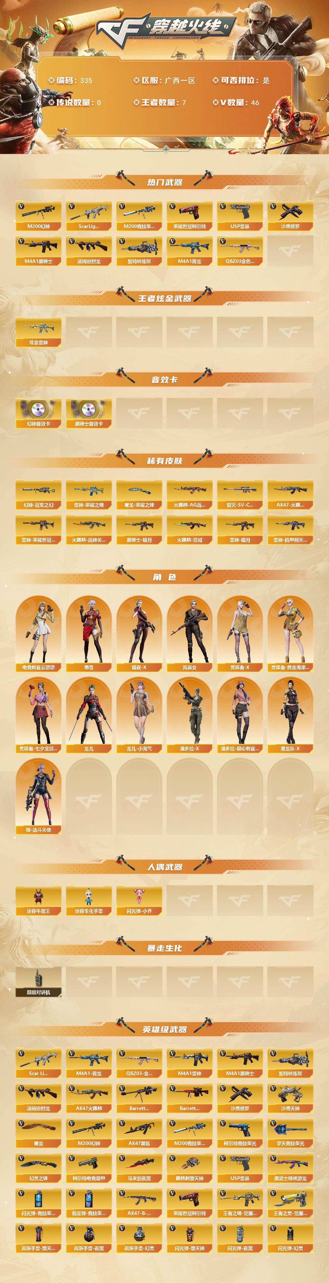 【335】xg78307广西一区-46v-7王者-1炫金 【热门武器】:q03-金色蔷薇,scar light-白虎,m4a1-青龙,m200-幻神,m200-竞技荣光,荣耀世冠-柯尔特,m4a1-黑骑士,汤姆逊-烈龙,加特林-炼狱,usp-雷暴,沙鹰-修罗2 【王者炫金武器】:炫金雷神 【音效卡】:m200-幻神音效卡,m4a1-黑骑士音效卡 【皮肤】:幻神-冠军之幻,雷神-暗月,雷神-荣耀之魄,雷神-荣耀世冠ag,雷神-机甲刑天皮肤,火麒麟-ag战队皮肤,ak47-火麒麟-传奇even,火麒麟-战神关羽,火麒麟-百城,毁灭-sv-cfpls16冠军,黑骑士-暗月,屠龙-荣耀之锋 【角色】:电竞教官-云悠悠,暗夜-x,风暴女,灵狐者-x,灵狐者-黄金海岸,灵狐者-七夕宝贝,龙儿,龙儿-小淘气,潘多拉-x,潘多拉-甜心教官,潜龙队-x,蜀雪,樱-战斗天使 【人偶武器】:迷你牛魔王,迷你生化手蕾,闪光丹-小乔 【暴走生化】:超级对讲机 【英雄级武器】:ak47-火麒麟,m4a1-雷神,m4a1-黑骑士,ak47-黑鲨,m4a1-青龙,scar light-白虎,黑武士-锦绣游龙,q03-金色蔷薇,王者之魄-觉醒版2,ak47-b-战神,barrett-毁灭,barrett-极光,m200-幻神,m200-竞技荣光,加特林-炼狱,汤姆逊-烈龙,沙鹰-修罗2,沙鹰-天神,usp-雷暴,柯尔特-电竞装甲,荣耀世冠-柯尔特,柯尔特-竞技荣光,王者之灵-觉醒版,屠龙2,麒麟刺-堕天神,马来剑-夜魔,幻灵之锋,擎天-竞技荣光,高爆手蕾-堕天神,高爆手蕾-夜魔,高爆手蕾-幻灵,闪光丹-堕天神,闪光丹-夜魔,闪光丹-幻灵,闪光丹-竞技荣光,闪光丹-雷霆王者-觉醒版2,盐雾蛋-堕天神,盐雾蛋-夜魔,盐雾蛋-幻灵,盐雾蛋-竞技荣光,盐雾蛋-雷霆王者-觉醒版 【道具】:炫彩背包,超级背包,变异宝贝,夺命之镰,防化服,呛王排位28赛季金色流光,ep战队击杀图标,防弹头盔,防弹衣,c4工具钳,手蕾包 【特殊呛械】:1白虎,1黑骑士,1烈龙,1炼狱