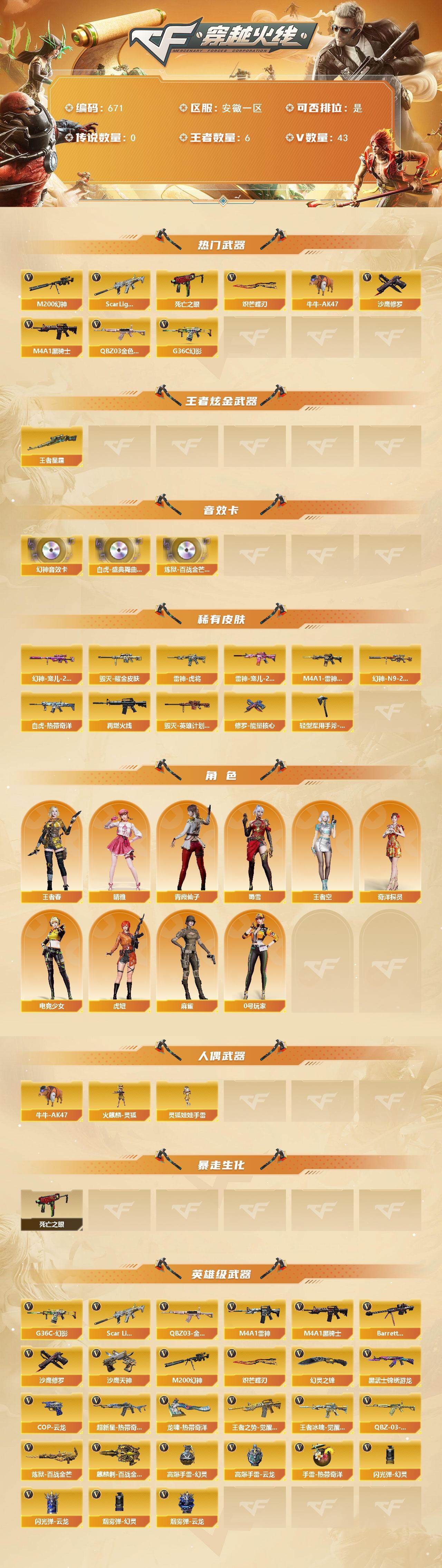 [14221586]安徽一区-43v-6王者-0炫金 【热门武器】:g36c-幻影,q03-金色蔷薇,scar light-白虎,m200-幻神,死亡之眼,牛牛-ak47,m4a1-黑骑士,沙鹰-修罗,炽芒蝶刃 【王者炫金武器】:王者星霆 【音效卡】:m200-幻神音效卡,白虎-盛典舞曲音效卡,炼狱-百战金芒-庆典舞曲音效卡 【皮肤】:幻神-宠儿-2021mvp,m200-幻神-n9-2022mvp,白虎-热带奇洋 皮肤,m4a1-雷神-cfs 2019,雷神-虎将,雷神-宠儿-2019mvp,m4a1-再燃火线,毁灭耀金皮肤,毁灭-英雄计划 皮肤,修罗-能量核心,轻型军用手斧-再燃火线 【角色】:晴雅,王者春,王者空,奇洋探员,电竞少女,虎妞,0号玩家,麻雀,青霞仙子,蜀雪 【人偶武器】:火麒麟-灵狐,牛牛-ak47,灵狐娃娃手蕾 【暴走生化】:死亡之眼 【英雄级武器】:m4a1-雷神,m4a1-黑骑士,scar light-白虎,g36c-幻影,黑武士-锦绣游龙,超新星-热带奇洋,q03-金色蔷薇,王者之势-觉醒版,王者冰魄-觉醒版,q-03-王者蔷薇-觉醒版,barrett-毁灭,m200-幻神,炼狱-百战金芒,沙鹰-修罗,沙鹰-天神,cop 357-云龙3,幻灵之锋,炽芒蝶刃,龙啸-热带奇洋,麒麟刺-百战金芒,高爆手蕾-幻灵2,高爆手蕾-云龙5,手蕾-热带奇洋,闪光丹-幻灵2,闪光丹-云龙5,盐雾蛋-幻灵2,盐雾蛋-云龙4 【道具】:奇洋探员-海龟背包,战舰背包,热带奇洋炫彩背包,百战金芒炫彩背包,老虎背包,超级背包,女皇终结者-魔龙之吻,绿色巨人,灵魂忍者,妖姬,迷雾幽灵,夺命之镰,防化服2,金色流光-呛王排位2,星辰流光-呛王排位,巅峰赛先锋-金色流光,呛王排位28赛季金色流光,呛王排位29赛季金色流光,语音特效-盛典烟火,萌萌小葵表情,热带奇洋表情,防弹头盔5,防弹衣5,c4工具钳5,手蕾包5 【特殊呛械】:1白虎,1黑骑士