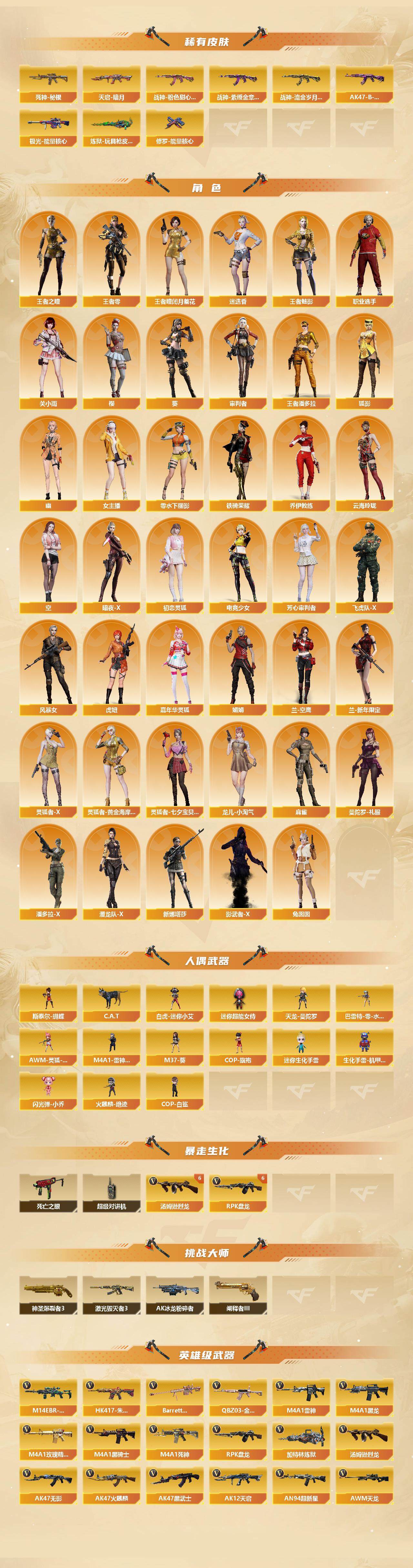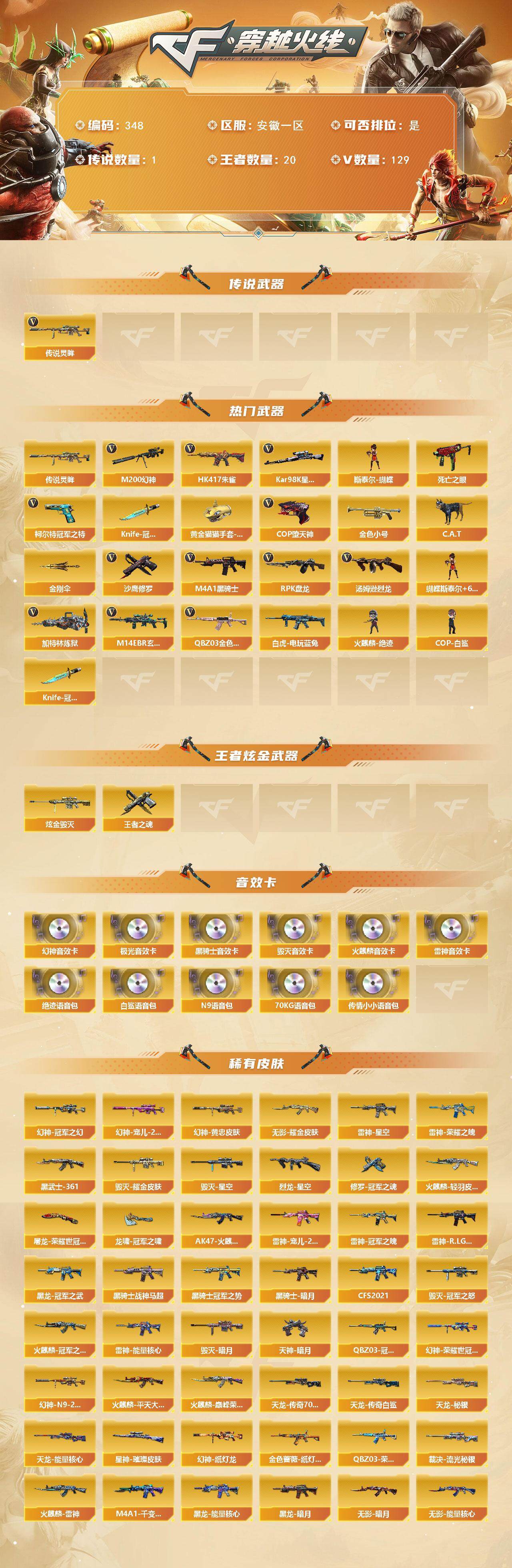 【348】xg26243安徽一区-129v-20王者-1炫金 【传说武器】:传说灵眸 【热门武器】:传说灵眸,q03-金色蔷薇2,m14ebr-玄武,hk417-朱雀,m200-幻神,死亡之眼2,白虎-电玩蓝兔,柯尔特-冠军之特2,kar98k-星神,金色小号,c.a.t,m4a1-黑骑士2,汤姆逊-烈龙6,rpk-盘龙7,加特林-炼狱2,斯泰尔-蝴蝶,火麒麟-绝迹,cop-白鲨,cop-堕天神2,沙鹰-修罗7,knife-冠军之刃4,黄金猫猫手套-白鲨2,金刚伞 【王者炫金武器】:王者之魂,炫金毁灭 【音效卡】:m200-幻神音效卡,ak47-火麒麟音效卡,m4a1-雷神音效卡,m4a1-黑骑士音效卡,barrett-毁灭音效卡,barrett-极光音效卡,70kg语音包,绝迹语音包,白鲨语音包,n9语音包,传情小小语音包 【皮肤】:m200-幻神-黄忠皮肤,幻神-冠军之幻,幻神-宠儿-2021mvp,m200-幻神-荣耀世冠白鲨,m200-幻神-n9-2022mvp,幻神-纸灯龙皮肤,q03-冠军之薇,金色蔷薇-纸灯龙皮肤,q03-荣耀世冠ep 皮肤,裁决-流光秘银,星神-璀璨皮肤,烈龙-星空,雷神-能量核心2,雷神-荣耀之魄,雷神-星空,雷神-冠军之魄,雷神-宠儿-2019mvp,雷神-r.lgd-cfpls18冠军,火麒麟-雷神,火麒麟-冠军之心2,ak47-火麒麟-传奇even,火麒麟-轻羽皮肤,火麒麟-平天大圣,火麒麟-巅峰荣耀,毁灭-暗月2,毁灭耀金皮肤,毁灭-星空,毁灭-冠军之怒2,m4a1-千变-孔明皮肤,黑龙-能量核心,黑龙-暗月,黑龙-冠军之武,黑骑士-暗月,黑骑士-冠军之势,黑骑士-战神马超,黑骑士-cfs2021,无影-暗月2,无影-能量核心3,无影耀金皮肤,死神-秘银5,ak47-黑武士-361,天启-暗月5,战神-粉色甜心皮肤2,战神-紫绶金章皮肤,战神-流金岁月皮肤,ak47-b-常胜将军-曹操,天龙-秘银,天龙-能量核心,awm-天龙-传奇70kg,awm-天龙-传奇白鲨,极光-能量核心3,炼狱-玩具呛皮肤,修罗-能量核心3,修罗-冠军之魂2,天神-暗月2,屠龙-荣耀世冠ag,龙啸-冠军之啸 【角色】:葵,樱,迷迭香,关小雨,审判者,王者-瞳-闭月羞花,王者-零,王者之瞳,王者-魅影,王者潘多拉,狐影,乔伊教练,云海玲珑,空,暗夜-x,初恋灵狐,电竞少女,芳心审判者,飞虎队-x,风暴女,虎妞,嘉年华灵狐,娟娟,兰-空鹰,兰-新年限定,零-水下丽影,灵狐者-x,灵狐者-黄金海岸,灵狐者-七夕宝贝,龙儿-小淘气,麻雀,曼陀罗-礼服,女主播,潘多拉-x,潜龙队-x,铁骑荣耀,兔囡囡,新娜塔莎,影武者-x,幽,职业选手 【人偶武器】:火麒麟-绝迹,cop-白鲨,白虎-迷你小艾,天龙-曼陀罗,m4a1-雷神-精英刀锋,斯泰尔-蝴蝶,芭蕾特-零-水下丽影2,awm-灵狐-15周年嘉年华,m37-葵,cop-旗袍2,c.a.t,迷你生化手蕾,生化手蕾-机甲核心,闪光丹-小乔,迷你超能女侍 【暴走生化】:死亡之眼2,超级对讲机 【挑战大师】:神圣爆裂者iii,ak47-冰龙粉碎者,激光毁灭者iii,阐释者iii 【英雄级武器】:ak47-火麒麟2,m4a1-黑龙4,m4a1-雷神4,m4a1-黑骑士2,ak47-无影,m4a1-死神3,ak47-黑武士,ak12-天启,an94-超新星,m4a1-武圣,ak47-机械迷城,ak47-黑鲨3,m4a1-龙血,m4a1-堕天神,hk417-朱雀,m14ebr-玄武,q03-天罚,黑武士-锦绣游龙,m4a1-玫瑰精灵4,q03-金色蔷薇2,王者之心-觉醒版,王者之武-觉醒版,王者之魄-觉醒版,ak-47-猩红传说3,ak47-b-战神,黑骑士-海王,q-03-王者蔷薇-觉醒版,白虎-电玩蓝兔,黑武士-cf网剧冠军,awm-天龙,barrett-毁灭5,barrett-极光,awm-裁决,m200-幻神,barrett-朱雀,kar98k-星神,barrett-金色蔷薇,王者之怒-觉醒版,王者之光-觉醒版,王者之力-觉醒版,王者幻神-觉醒版,王者星神-觉醒版2,rpk-盘龙7,加特林-炼狱2,炼狱-悦蓝-觉醒版,汤姆逊-烈龙6,aa-12-雷霆,沙鹰-修罗7,沙鹰-天神2,cop-堕天神2,柯尔特-冠军之特2,天神-动感闪耀,天神-cf网剧冠军,屠龙2,龙啸2,麒麟刺-堕天神2,擎天3,麒麟刺3,龙啸-堕天神,擎天-cf网剧冠军,王者之锋-觉醒版2,高爆手蕾-堕天神6,手蕾-动感闪耀,闪光丹-堕天神6,盐雾蛋-堕天神6,盐雾蛋-云龙 【道具】:ep战队炫彩背包,edg炫彩背包,冰冰企鹅背包-猛男专用,战舰背包,炫彩背包,虎牙炫彩背包,超级背包,女皇终结者-魔龙之吻,妩媚妖姬,黄金生化钩,变异宝贝,生化弹匣,夺命之镰2,防化服,金色流光-呛王排位2,星辰流光-呛王排位,呛王排位28赛季金色流光,语音特效-生化,电玩兔兔表情,循环实验表情,c4-红龙,防弹头盔5,防弹衣3,c4工具钳2,手蕾包 【特殊呛械】:蝴蝶斯泰尔6烈龙,2黑骑士,6烈龙,6盘龙,2炼狱,1蝴蝶斯泰尔