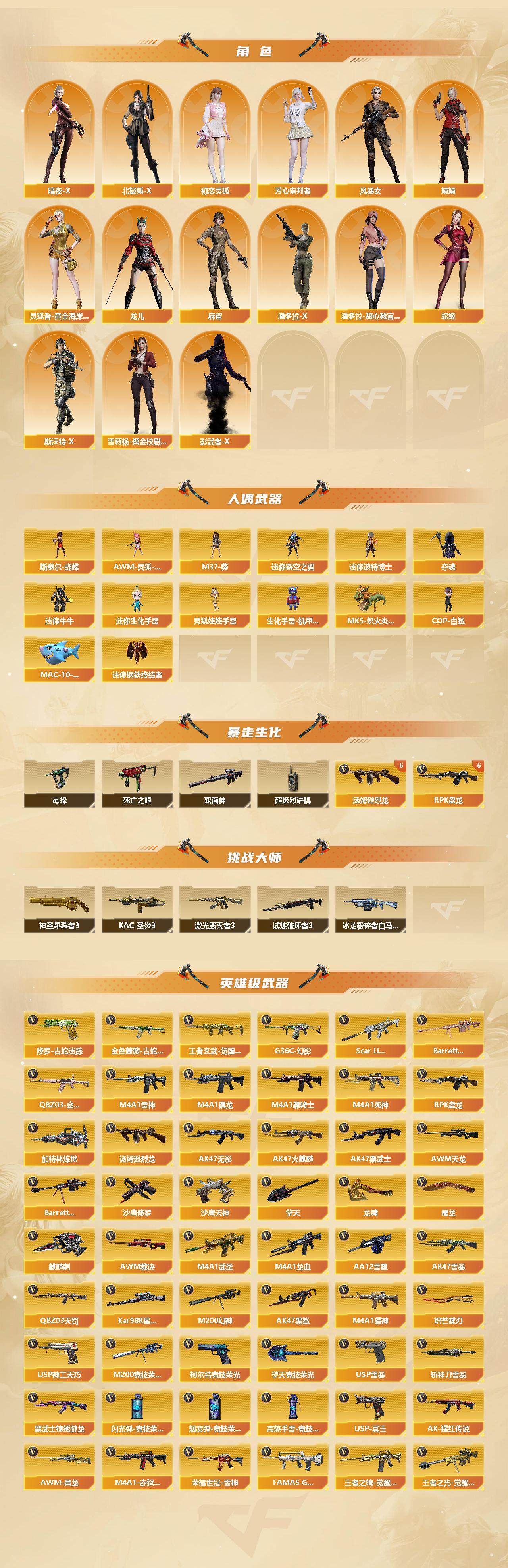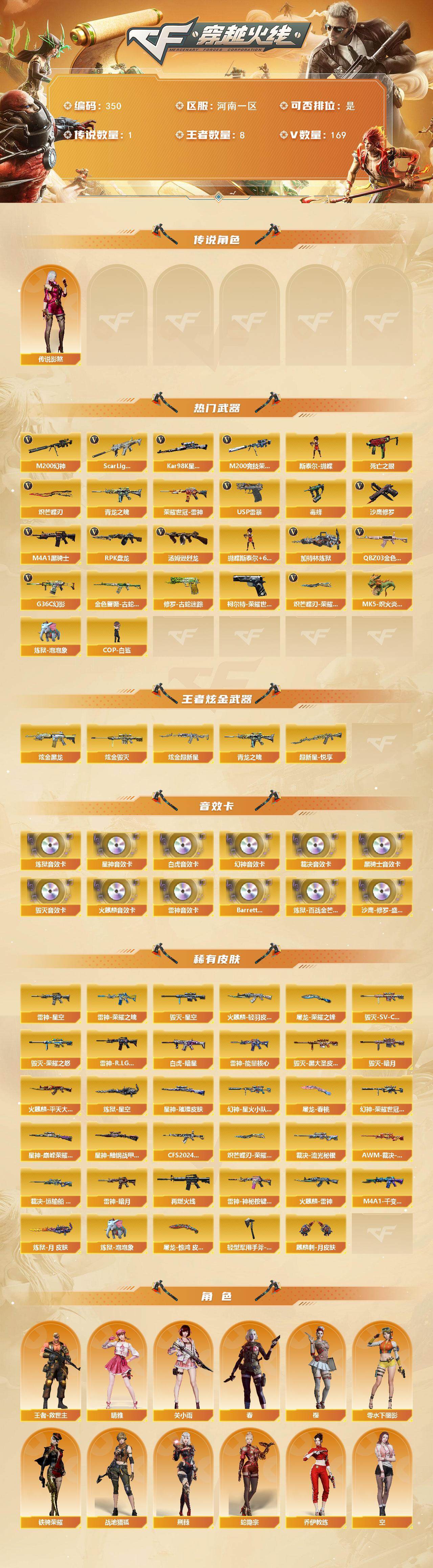 【350】xg17839河南一区-169v-8王者-6炫金 【传说角色】:传说影煞 【热门武器】:g36c-幻影,q03-金色蔷薇,scar light-白虎,m200-幻神,柯尔特-荣耀世冠白鲨20232,金色蔷薇-古蛇迷踪,修罗-古蛇迷踪,m200-竞技荣光,死亡之眼,青龙之魄,荣耀世冠-雷神,kar98k-星神,毒蜂,m4a1-黑骑士2,汤姆逊-烈龙7,rpk-盘龙6,加特林-炼狱,斯泰尔-蝴蝶,mk5-炽火炎龙,炼狱-泡泡象,cop-白鲨,usp-雷暴,沙鹰-修罗5,炽芒蝶刃3,炽芒蝶刃-荣耀世冠白鲨2023 皮肤 【王者炫金武器】:超新星-悦享,青龙之魄,炫金黑龙,炫金超新星3,炫金毁灭2 【音效卡】:m200-幻神音效卡,ak47-火麒麟音效卡,m4a1-雷神音效卡,m4a1-黑骑士音效卡,barrett-毁灭音效卡,awm-裁决音效卡,scar light-白虎音效卡,kar98k-星神音效卡,加特林-炼狱音效卡,barrett-碧霄极光音效卡3,炼狱-百战金芒-庆典舞曲音效卡,沙鹰-修罗-盛典舞曲音效卡 【皮肤】:幻神-星火小队签名臻藏版 皮肤,幻神-荣耀世冠白鲨2023 皮肤,scar light-白虎-暗星,q03-cfs2024 皮肤,裁决-流光秘银,awm-裁决-凤灵皮肤,裁决-运输船 皮肤,星神-璀璨皮肤,星神-巅峰荣耀 皮肤,星神-黯钢战甲 皮肤,雷神-暗月,雷神-能量核心,雷神-荣耀之魄,雷神-星空,雷神-r.lgd-cfpls18冠军,m4a1-再燃火线,雷神-神秘按键 皮肤,火麒麟-雷神,火麒麟-轻羽皮肤,火麒麟-平天大圣,毁灭-暗月,毁灭-荣耀之怒,毁灭-星空,毁灭-sv-cfpls16冠军,毁灭-黑大圣皮肤,m4a1-千变-孔明皮肤,炼狱-星空,炼狱-月 皮肤,炼狱-泡泡象,屠龙-荣耀之锋,屠龙-春桃 皮肤,屠龙-惊鸿 皮肤,轻型军用手斧-再燃火线,麒麟刺-月皮肤,炽芒蝶刃-荣耀世冠白鲨2023 皮肤 【角色】:樱,春,关小雨,晴雅,荆棘,战地猎狐,王者-救世主,蛇隐宗,乔伊教练,空,暗夜-x,北极狐-x,初恋灵狐,芳心审判者,风暴女,娟娟,零-水下丽影,灵狐者-黄金海岸,龙儿,麻雀,潘多拉-x,潘多拉-甜心教官,蛇姬,斯沃特-x,铁骑荣耀,雪莉杨-摸金校尉,影武者-x 【人偶武器】:cop-白鲨,迷你钢铁终结者,mk5-炽火炎龙,斯泰尔-蝴蝶,mac-10-千针棘鲨,awm-灵狐-15周年嘉年华,m37-葵,迷你裂空之翼,迷你波特博士5,夺魂,迷你牛牛,迷你生化手蕾,生化手蕾-机甲核心,灵狐娃娃手蕾 【暴走生化】:毒蜂,双面神,死亡之眼,超级对讲机 【挑战大师】:神圣爆裂者iii,冰龙粉碎者-白马银呛,激光毁灭者iii4,试炼破坏者iii,kac-圣炎切割者iii 【英雄级武器】:ak47-火麒麟5,m4a1-黑龙3,m4a1-雷神3,m4a1-黑骑士2,ak47-无影3,m4a1-死神7,ak47-黑武士6,m4a1-武圣3,ak47-黑鲨2,m4a1-龙血2,ak47-雷暴,scar light-白虎,q03-天罚2,g36c-幻影,黑武士-锦绣游龙,金色蔷薇-古蛇迷踪,famas g2-天戎,q03-金色蔷薇,m4a1-猎神,王者之魄-觉醒版,ak-47-猩红传说,王者玄武-觉醒版2,荣耀世冠-雷神,awm-天龙2,barrett-毁灭11,awm-裁决,m200-幻神,kar98k-星神,m200-竞技荣光,barrett-金色蔷薇4,王者之光-觉醒版,rpk-盘龙6,加特林-炼狱,炼狱-百战金芒,炼狱-悦蓝-觉醒版,汤姆逊-烈龙7,aa-12-雷霆,沙鹰-修罗5,沙鹰-天神5,usp-雷暴,柯尔特-荣耀世冠白鲨20232,柯尔特-无冕之王,柯尔特-竞技荣光2,anaconda-玄豹,usp-神工天巧,usp-冥王2,修罗-古蛇迷踪,屠龙5,龙啸,擎天,麒麟刺4,擎天-竞技荣光,炽芒蝶刃3,斩神刀-雷暴,麒麟刺-百战金芒,丛林匕首-玄豹,高爆手蕾-雷霆,高爆手蕾-雷暴7,高爆手蕾-竞技荣光,高爆手蕾-古蛇迷踪,高爆手蕾-玄豹,闪光丹-雷霆,闪光丹-雷暴7,闪光丹-竞技荣光2,盐雾蛋-雷霆,盐雾蛋-雷暴7,盐雾蛋-竞技荣光,盐雾蛋-古蛇迷踪,盐雾蛋-玄豹2,m4a1-赤狱骑士,m4a1-苍鸣雷神,awm-昌龙,barrett-碧霄极光 【道具】:bs战队炫彩背包,cfs限定背包,云山科技背包,亚洲杯纪念炫彩背包,古蛇迷踪炫彩背包,女皇终结者-背包,沙漠龙背包-猛男专属,炫彩背包,百战金芒炫彩背包,超级背包,超核名片,圣拳猎手-炽雪,终极猎手-秦魂将军,虚空终结者-暗域熔岩,女皇终结者-魔龙之吻,救世主-黑桃战神,绿色巨人,灵魂忍者2,变异宝贝,妖姬,迷雾幽灵,生化弹匣2,夺命之镰,防化服3,流光-鎏金之域,呛王排位28赛季金色流光,呛王排位29赛季金色流光,语音特效-盛典烟火,古蛇迷踪打击特效,蛇隐宗表情,萌萌小葵表情,斯沃特表情,循环实验表情,cfpl选手表情-第1套,ep战队名片,ep战队喷图,ep战队击杀图标,防弹头盔3,防弹衣3,c4工具钳3,手蕾包3 【特殊呛械】:蝴蝶斯泰尔6烈龙,1白虎,2黑骑士,6烈龙,6盘龙,1炼狱,1蝴蝶斯泰尔