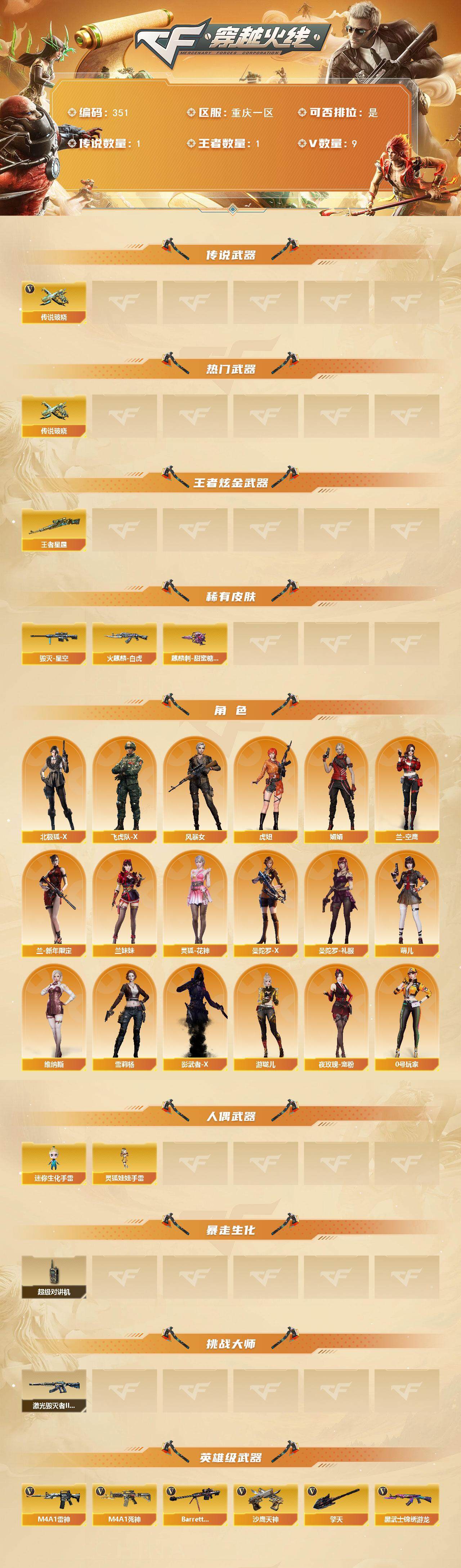 【351】xg38684重庆一区-9v-1王者-0炫金 【传说武器】:传说破晓 【热门武器】:传说破晓 【王者炫金武器】:王者星霆 【皮肤】:火麒麟-白虎,毁灭-星空,麒麟刺-甜蜜糖果 皮肤 【角色】:北极狐-x,飞虎队-x,风暴女,虎妞,娟娟,兰-空鹰,兰-新年限定,兰妹妹,0号玩家,灵狐-花神,曼陀罗-x,曼陀罗-礼服,萌儿,维纳斯,雪莉杨,夜玫瑰-宠粉,影武者-x,游珑儿 【人偶武器】:迷你生化手蕾,灵狐娃娃手蕾2 【暴走生化】:超级对讲机 【挑战大师】:激光毁灭者iii-白马银呛 【英雄级武器】:m4a1-雷神,m4a1-死神,黑武士-锦绣游龙,barrett-毁灭,沙鹰-天神,擎天4 【道具】:cfs限定背包,亚洲杯纪念炫彩背包,终极猎手-秦魂将军,绿色巨人,灵魂忍者3,变异宝贝,迷雾幽灵3,夺命之镰,防化服3,呛王排位28赛季金色流光,ep战队击杀图标,防弹头盔2,防弹衣2,c4工具钳2,手蕾包2 【特殊呛械】: