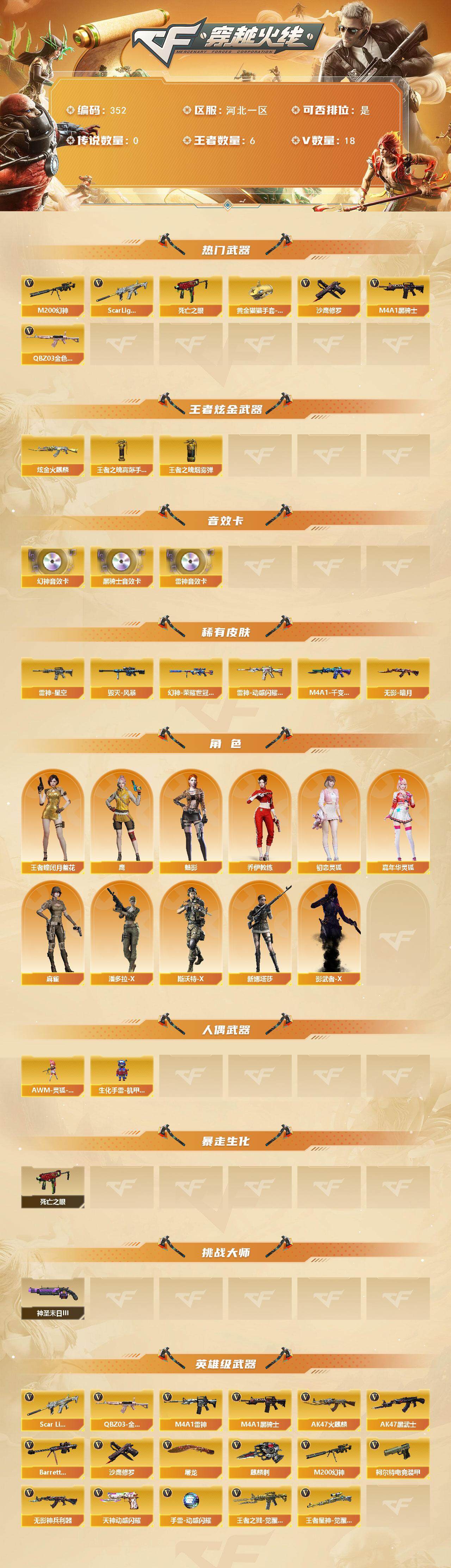 【352】xg24047河北一区-18v-6王者-1炫金 【热门武器】:q03-金色蔷薇,scar light-白虎,m200-幻神,死亡之眼,m4a1-黑骑士,沙鹰-修罗,黄金猫猫手套-白鲨 【王者炫金武器】:炫金火麒麟,王者之魄高爆手蕾2,王者之魄盐雾蛋 【音效卡】:m200-幻神音效卡,m4a1-雷神音效卡,m4a1-黑骑士音效卡 【皮肤】:m200-幻神-荣耀世冠白鲨,雷神-星空,雷神-动感闪耀 皮肤,毁灭-风暴,m4a1-千变-孔明皮肤,无影-暗月 【角色】:魅影,鹰,王者-瞳-闭月羞花,乔伊教练,初恋灵狐,嘉年华灵狐,麻雀,潘多拉-x,斯沃特-x,新娜塔莎,影武者-x 【人偶武器】:awm-灵狐-15周年嘉年华,生化手蕾-机甲核心 【暴走生化】:死亡之眼 【挑战大师】:神圣爆裂者-末日iii 【英雄级武器】:ak47-火麒麟,m4a1-雷神,m4a1-黑骑士,ak47-黑武士,scar light-白虎,无影-神兵利器,q03-金色蔷薇,王者之戮-觉醒版,barrett-毁灭,m200-幻神,王者星神-觉醒版,沙鹰-修罗,柯尔特-电竞装甲,天神-动感闪耀,屠龙,麒麟刺,手蕾-动感闪耀 【道具】:全能呛王背包,战舰背包,超级背包,哔哩哔哩名片,生化弹匣,夺命之镰,防化服,金色流光-呛王排位2,星辰流光-呛王排位,呛王排位28赛季金色流光,呛王排位29赛季金色流光,ep战队名片,防弹头盔3,防弹衣3,c4工具钳3,手蕾包3 【特殊呛械】:1白虎,1黑骑士